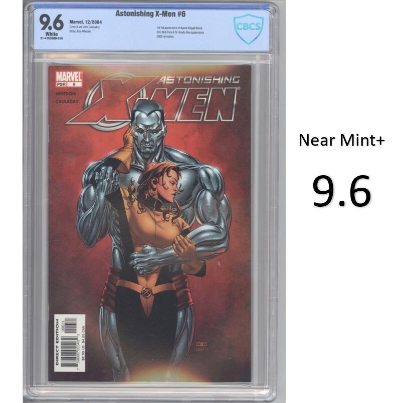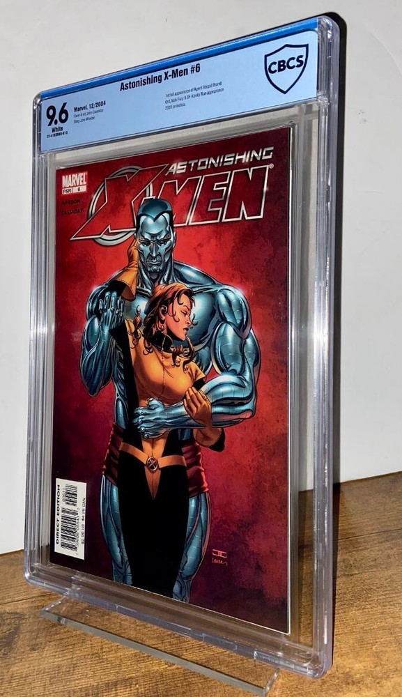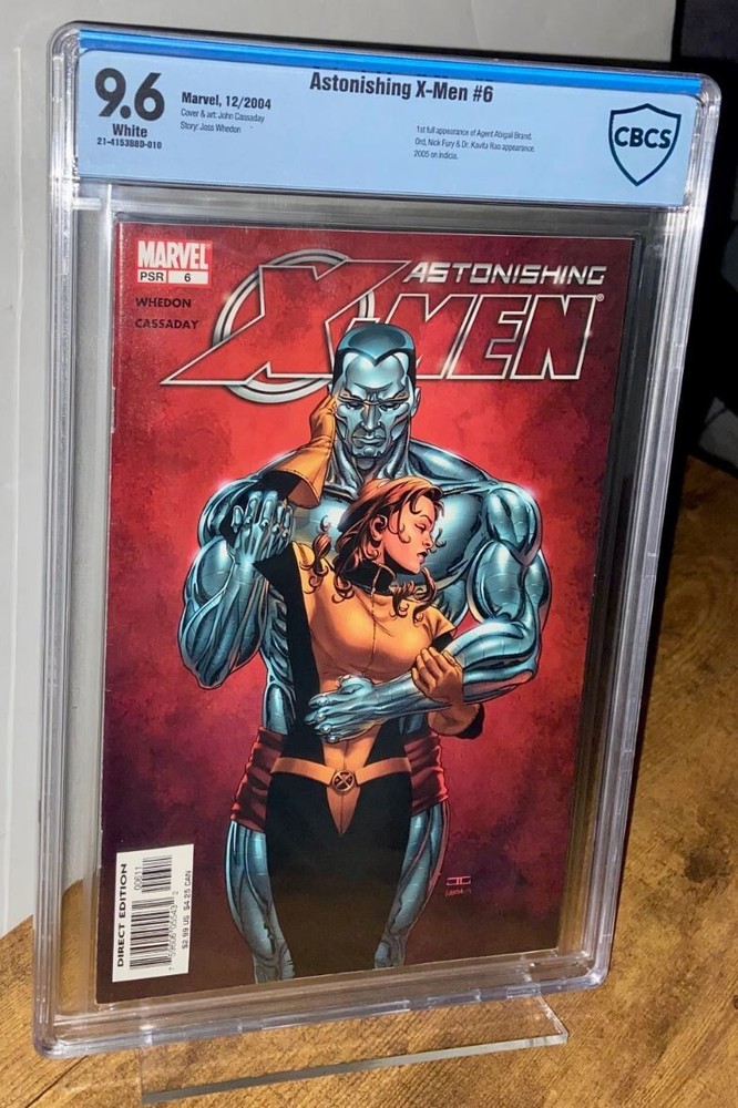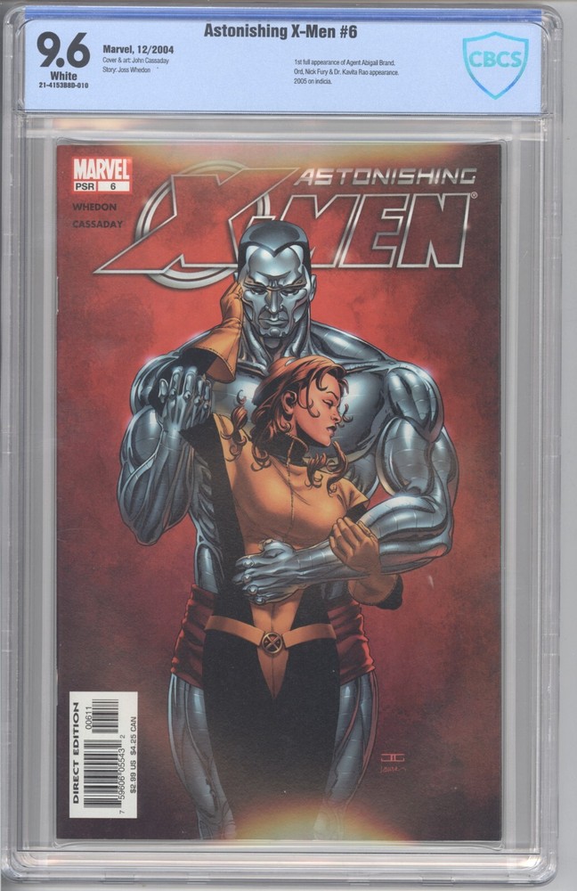 Astonishing X-Men, Issue 6 (Published 2004) graded CBCS 9.6! Brand New Slab! Key Issue! In this issue is the first full appearance of Agent Abigail Brand. Note: This slabbed Near Mint+ collectible is priced to sell and would make a good investment. Cover art by John Cassaday. Story by Joss Whedon Slab: 21-4153B8D-010 Title: Gifted (Part 6) WE OFFER BUNDLE SHIPPING, SO YOU SAVE!