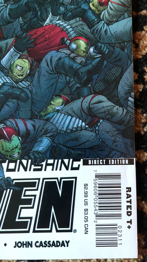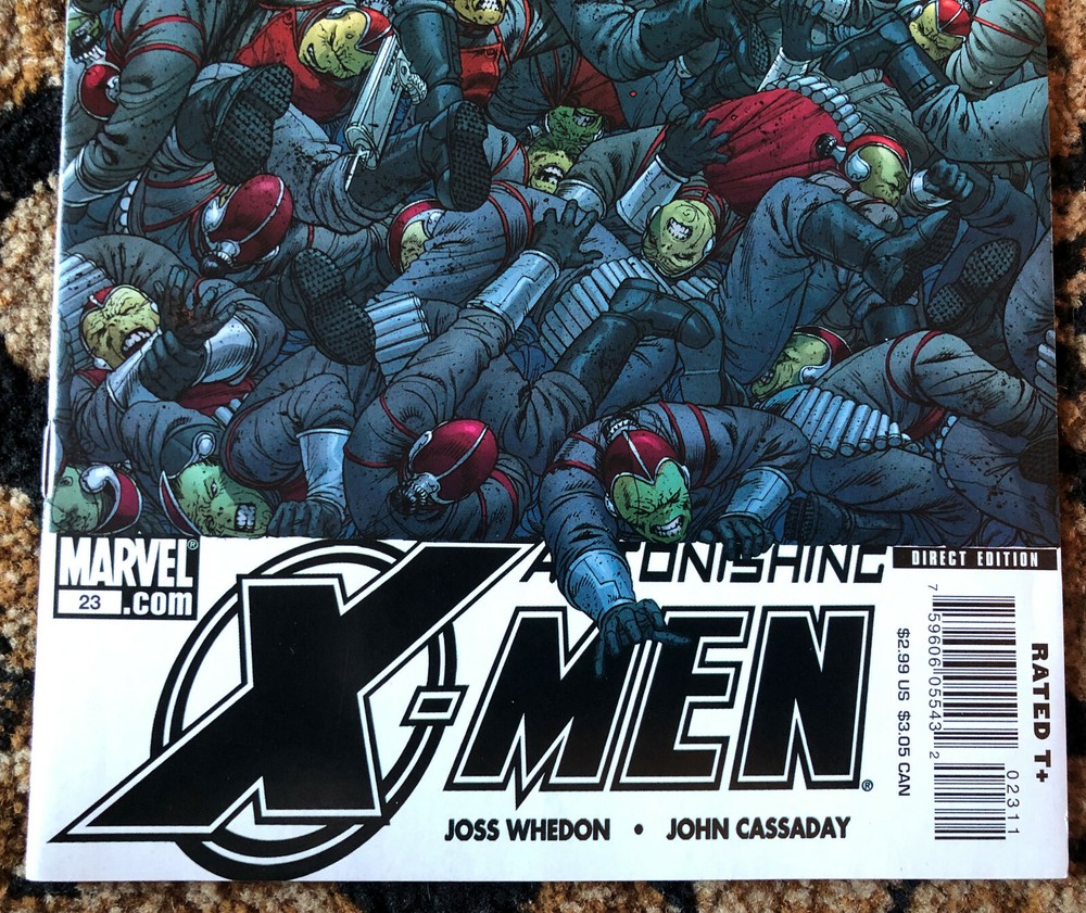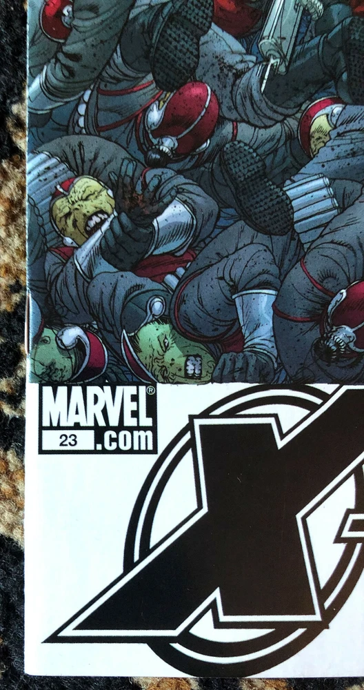 Astonishing X-Men Vol 3, #23 ( January 200)- Joss Whedon, John Cassaday - Marvel Some spine wear. Slight discoloration of white bottom left close to spine. Slight wear on top left corner of front cover. Slight indent on top front cover near right. Slight indent on top right corner of back cover. Slight wear on corner of both front and back covers. Judged to be 8.5, Very Fine+. tranded on the Breakworld, Cyclops has given his life to buy his fellow X-Men the time they need to escape Kruun's forces, and put their backup plan, Leviathan, in motion. But human death can be cured by the science of the Breakworld, and Scott's death is short indeed as his prisoners begin to interrogate him regarding this plan.Meanwhile, the rest of his X-Men are hunted and hounded across the planet... but all is going just according to plan. Also selling many other comic books--Marvel, DC, and indies. And we combine shipping. Please contact us if you wish to purchase multiple books so we can send you an invoice with the combined shipping. Thanks.