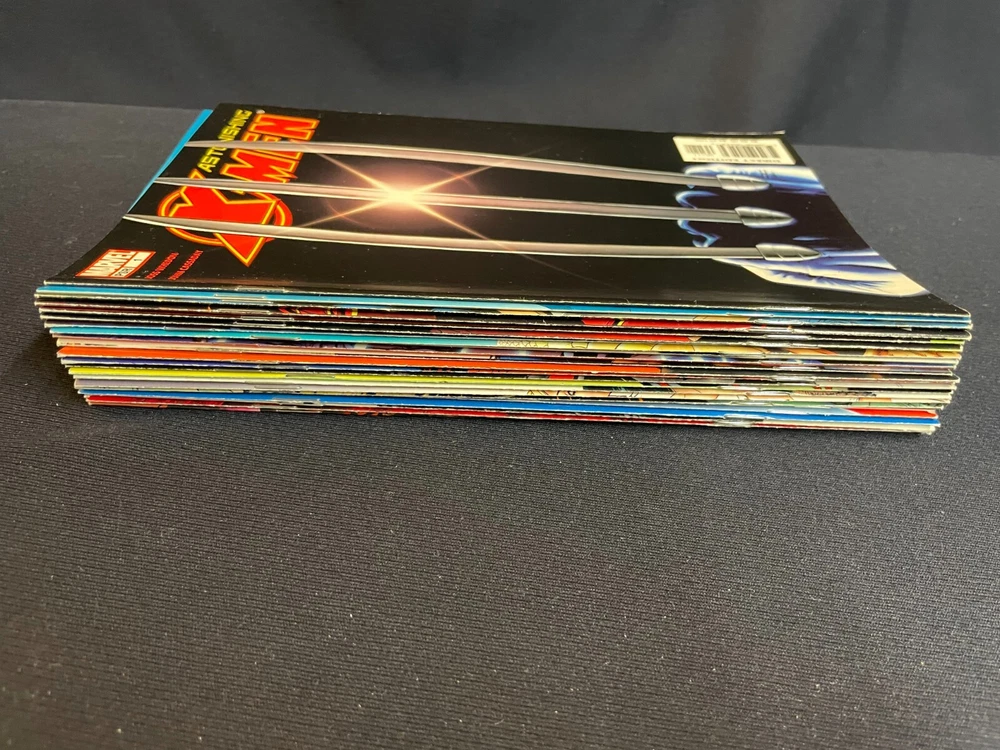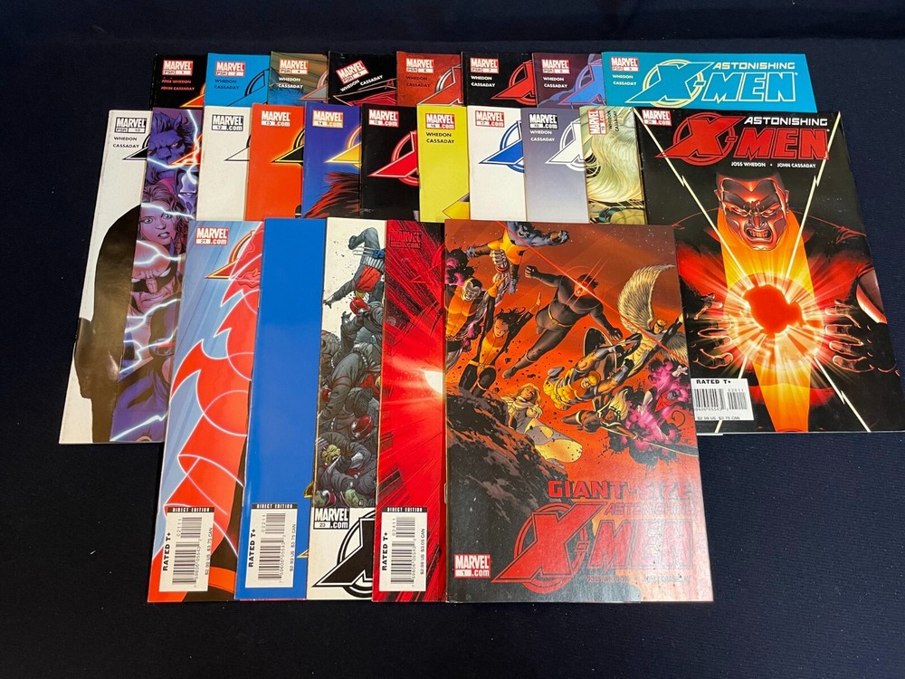 About This Auction: Astonishing X-Men (2004) #1-24 (Missing #3) Giant-Size Astonishing X-Men By Joss Whedon for Marvel Comics 24 Comics Total! *** These comics are solid, gently read, collectible copies unless specified otherwise in the description below*** Our goal is to assemble the best run of a series in its most complete and collectible form. We carefully consider the quality of each comic in the lot when determining its auction value as a whole. We do not place a grade on individual comics; instead we provide clear pictures for you to gauge the overall quality. **Please contact us for any questions or requests for additional photos** Please note: Our comics are not sold individually bagged and boarded. (If the images provided show comic books with bags/boards, please note the bags/boards have been removed! We do not sell comics individually bagged and boarded) Shipping: We offer Priority shipping services and pack items securely. Items are shipped within 1 days after payment has been received barring weekends and holidays. Items over $200 require a signature upon arrival. To ensure your books arrive safely, we bag our comics in bundles of 4-7 books per golden bag and place comic boards between the bundles to protect the book on all side. We have found this method to prevent movement during shipping. Contact Us: Please contact us directly to discuss any questions, concerns or to request additional detailed photos. We pride ourselves on our evaluation process and our prompt customer service. We're always happy to work with you to ensure total customer satisfaction before your transaction is complete. _____________________________________________ ** Comicazi Inc.** Comicazi is located in located in Somerville, Massachusetts 2017 Eisner Award winning retail shop specializing in comic books, graphic novels, toys, games, and more!! ** Ebay user ID: comicazionline ** Inventory: Marvel 49