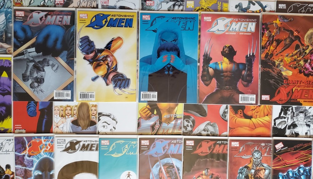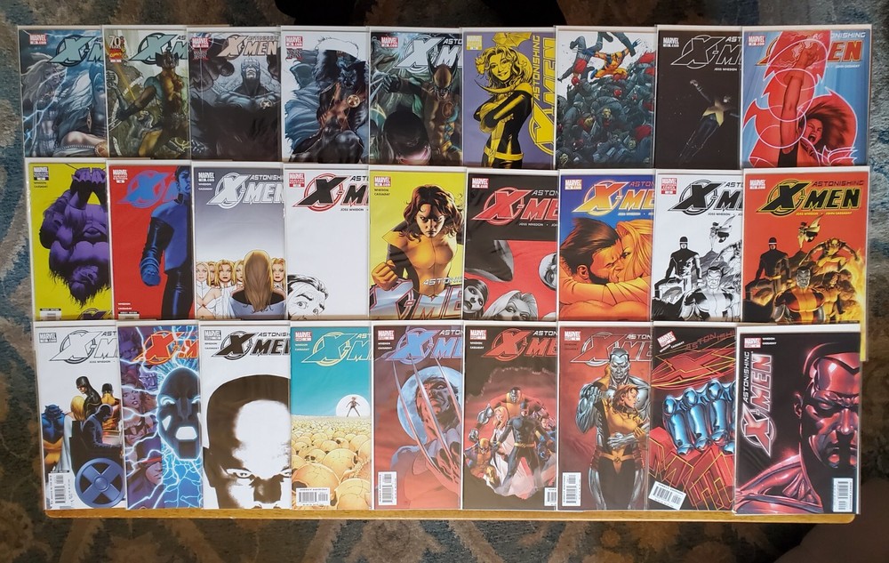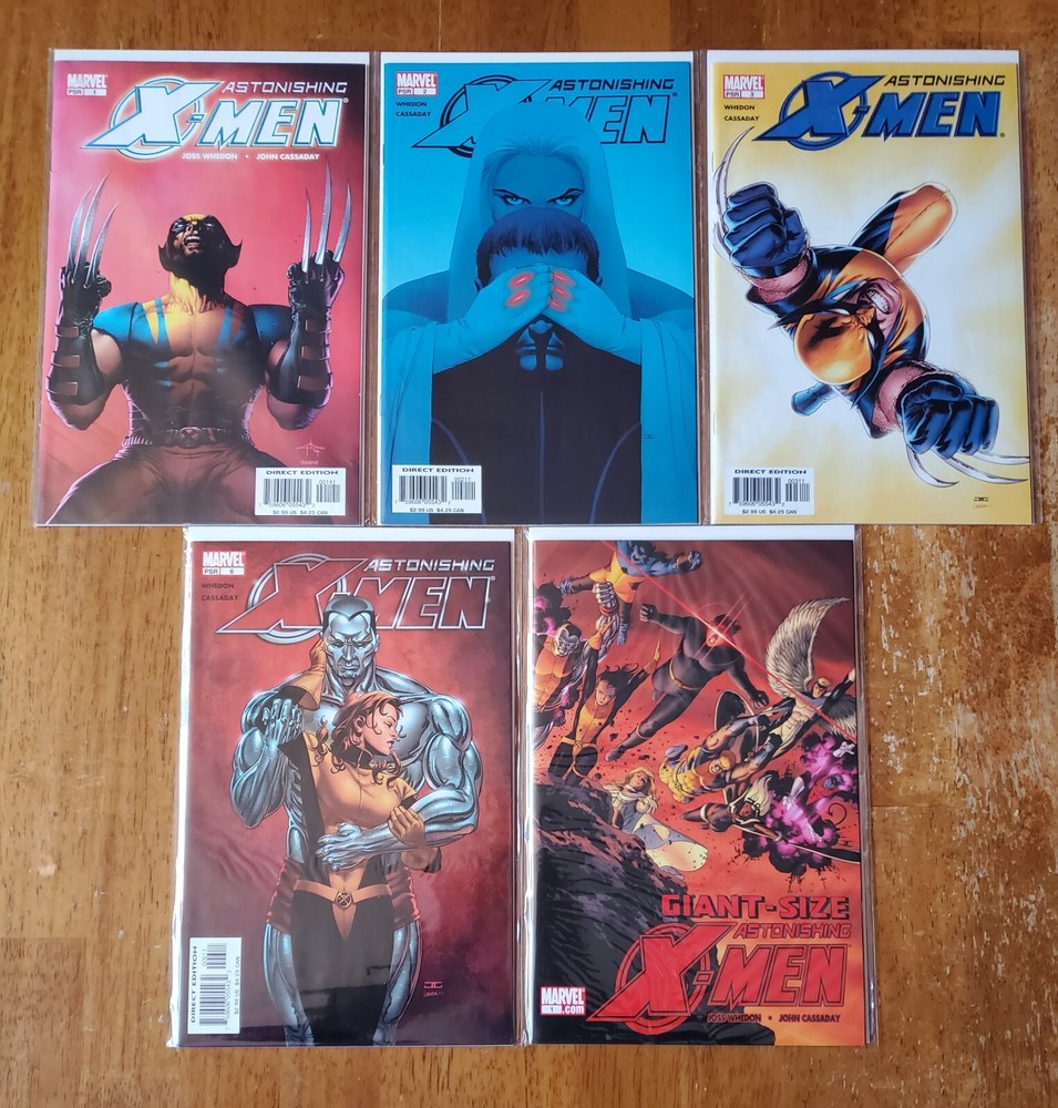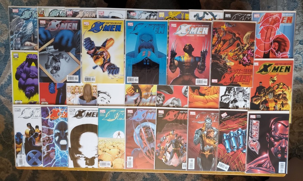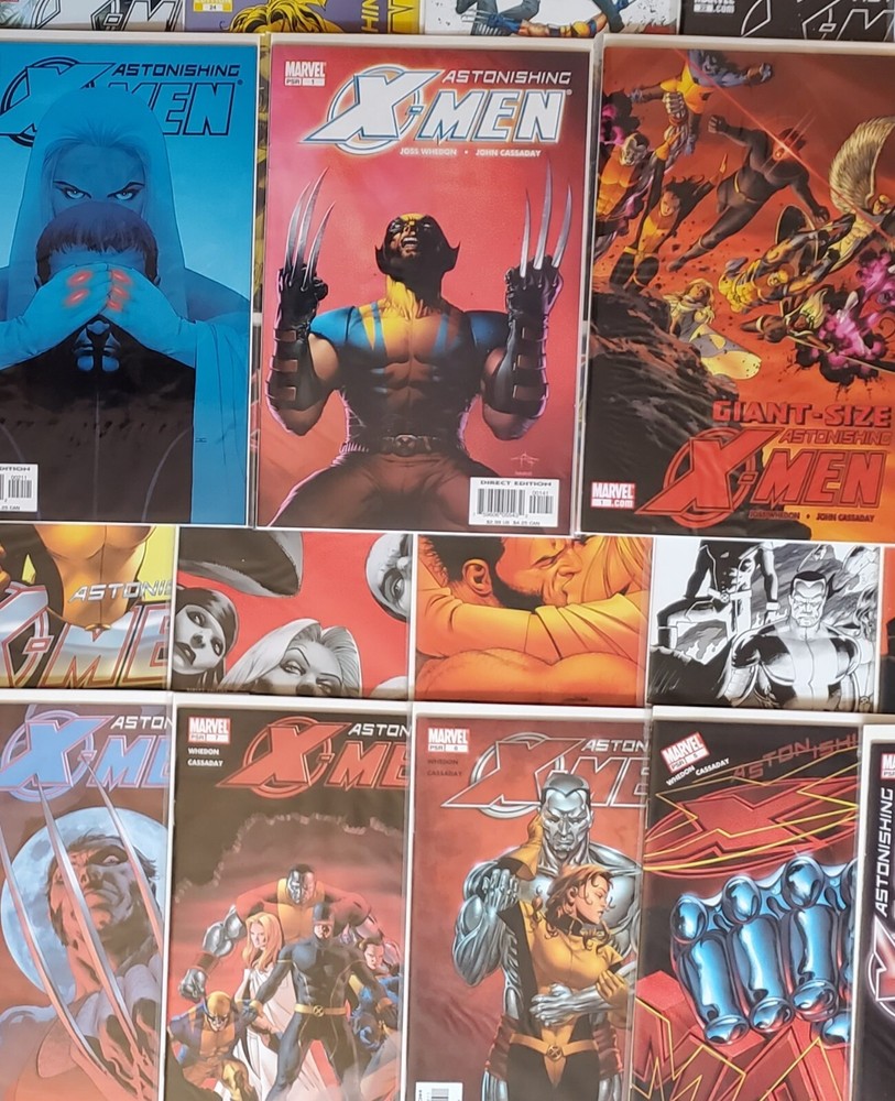 ASTONISHINGX-MEN #1 (2004) #1-30 plus Giant-Size Astonishing X-Men #1 (2008). The acclaimed series by Joss Whedon and the late, great John Cassaday. Includes the #1 GabrieleDell'otto 1:10 Variant plus #4 retailer incentive variant, #13 Midtown Comics variant, and #17, 19, 20 & 24 variant covers. 1st appearance of Abigail Brand (#3, 7), Armor (#4), Blindfold (#7), and Danger (#9). 1st mention ofS.W.O.R.D . ( Sentient World Observation and Response Department). Cyclops, Emma Frost, Beast, Kitty Pryde/Shadowcat, Colossus, and Wolverine! Near Mint NM 9.6 All comics are individually bagged & boarded. Buy with confidence. You can trust my grading. I am a Overstreet Price Guide advisor (check out my report on page 160 of the current price guide). " Gifted " (issues #1–6) The first story arc introduced a "mutant cure" designedby scientist Dr. Kavita Rao, who was secretly sponsored bywarrior alien Ord. With this2005 arc, Whedon brought back Colossus four years after his comic book death in 2001. " Dangerous " (issues #7–12) This arc features a Sentinel attack with a mystery mastermind. The culprit is the Danger Room itself, which has become sentient and fights the X-Men in a robotic form called "Danger." " Torn " (issues #13–18) The X-Men are manipulated by a new Hellfire Club, consisting of Cassandra Nova, Emma Frost, the enigmatic Perfection, Negasonic Teenage Warhead, and Sebastian Shaw. The final panel of issue 15, in which Shadowcat crouches in a sewer clenching her fists, was an homage to the final panel of Uncanny X-Men #132, in which Wolverine did the same. " Unstoppable " (issues #19–24 and Giant-SizeAstonishing X-Men #1) The X-Men square off against the Breakworld leaders, who intend todestroy Earth by firing a giant bullet at it.