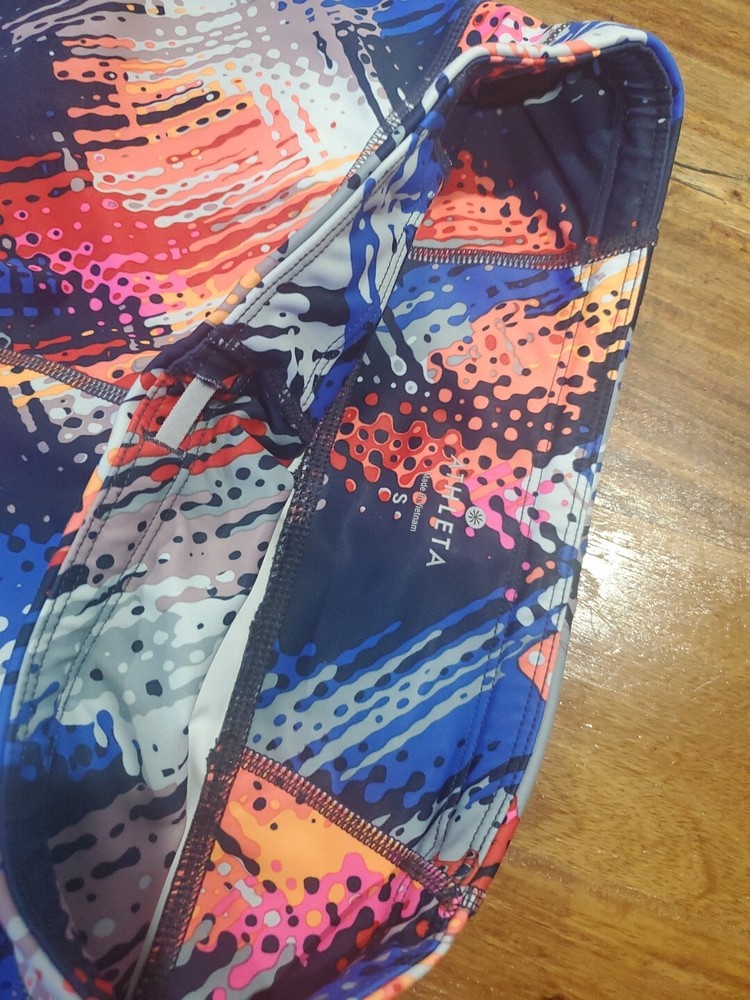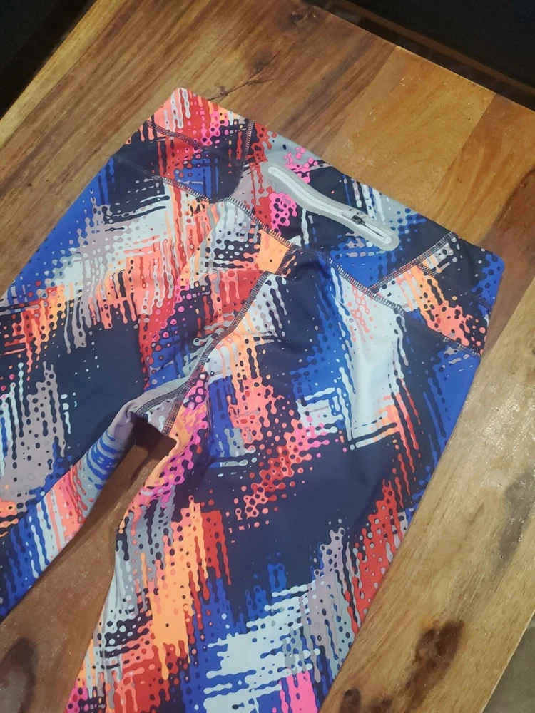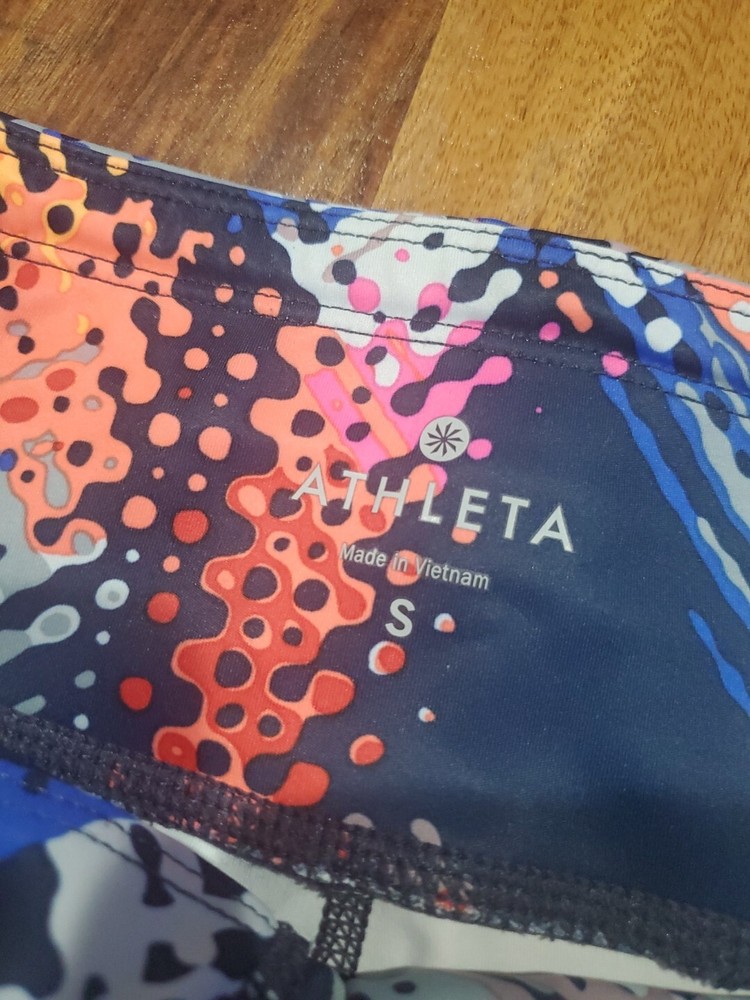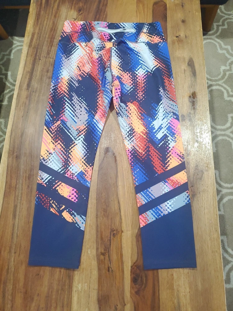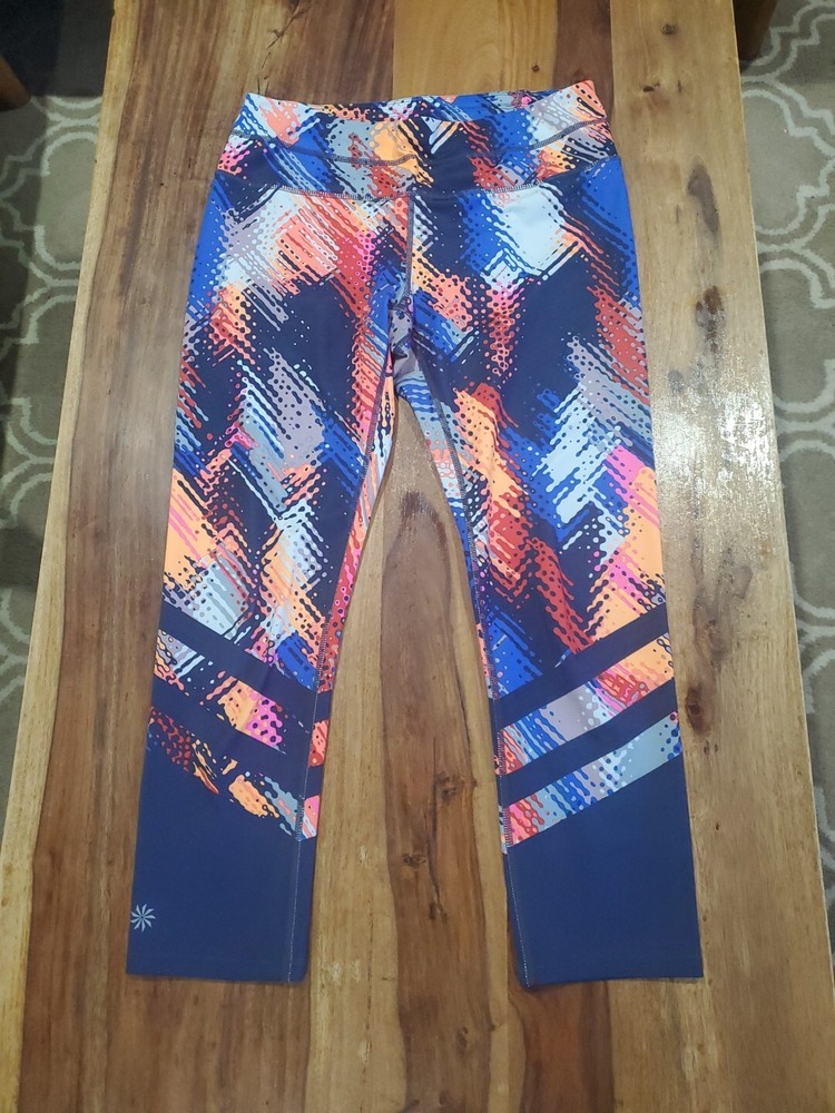 Enhance your workout wardrobe with these colorful Athleta leggings! Perfect for gym training, yoga, or running, these leggings boast a comfortable and stretchy fit with a mid-rise waist and cropped leg style. The colorblock design in blue and orange adds a fun pop of color to your activewear collection. Made of a polyester and spandex knit fabric, these leggings also feature a pull-on closure and a 28-inch waist size. Ideal for the summer, fall, or spring seasons, these leggings are a must-have for any athletic activity. Grab a pair today and hit the gym in style!
