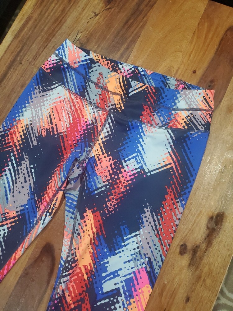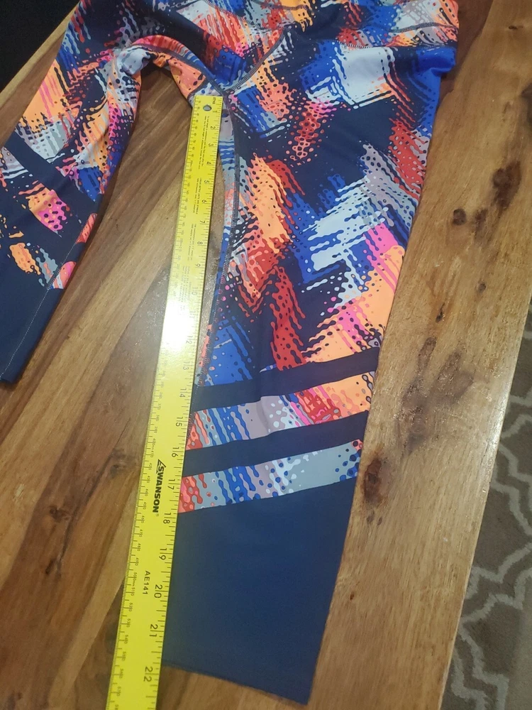 Love these leggings—so soft, stretchy, and perfect for workouts or lounging! The bright blue and orange color combo is fun, and the cropped length keeps them cool and comfortable. The mid-rise waist stays put without digging in, and the fabric feels breathable yet supportive. Great for yoga, runs, or just daily wear. A stylish and functional addition to my activewear!