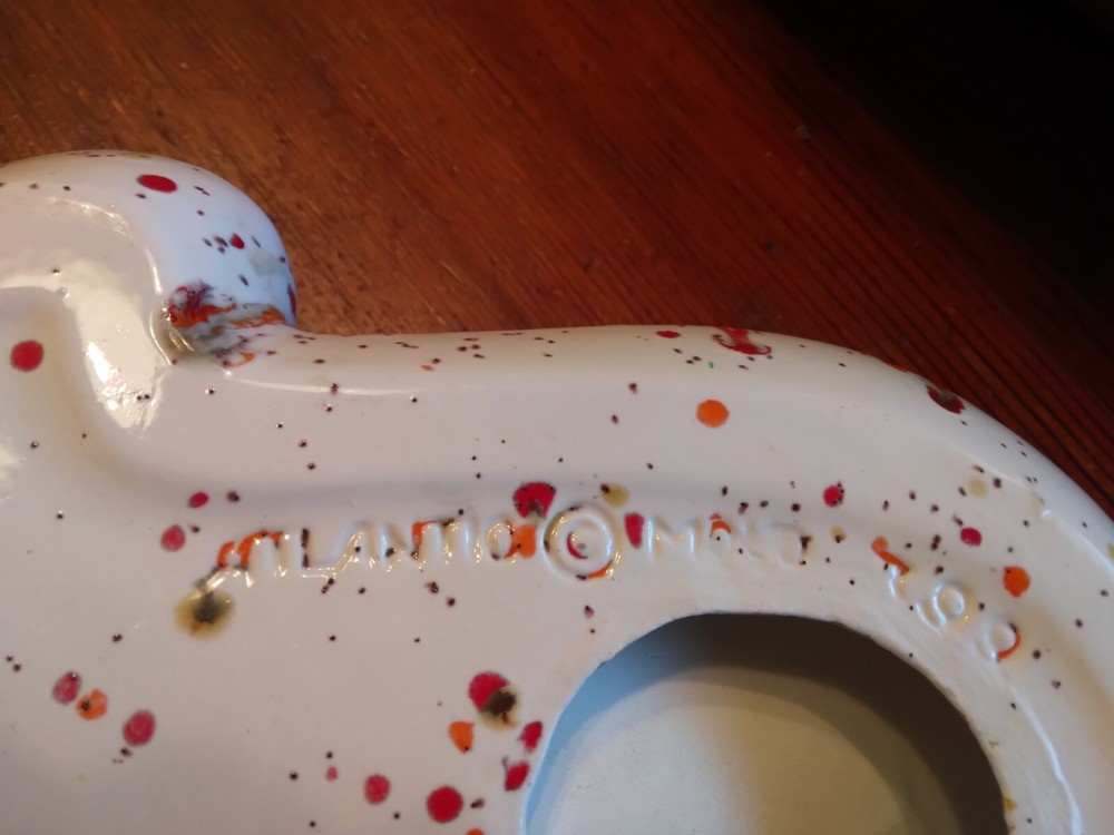This ashtray is a stunning mid-century piece with vibrant orange, red, and gray confetti dots against a crisp white background. The 12" by 9" size is perfect, and it arrived safely with no chips or cracks. USPS Priority Mail made shipping fast and reliable. A stylish and functional addition to any space!