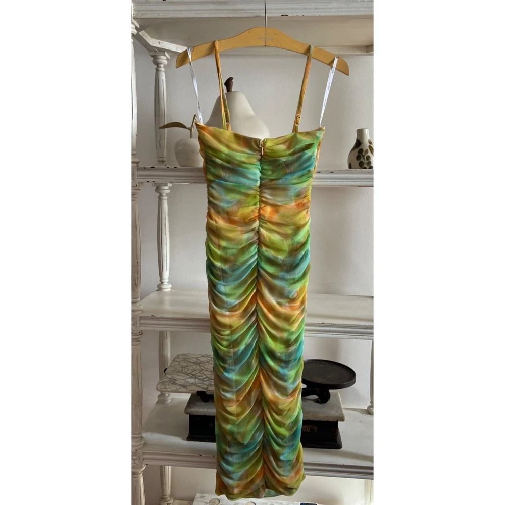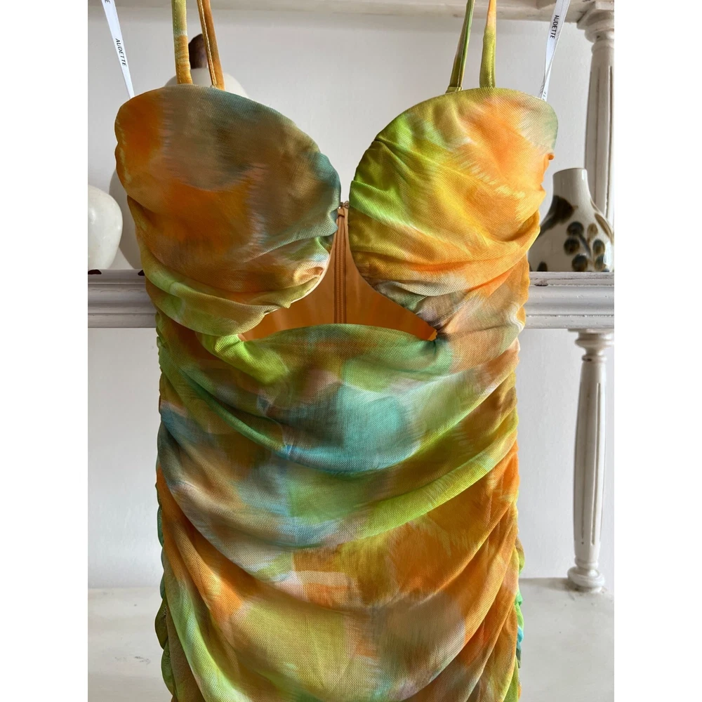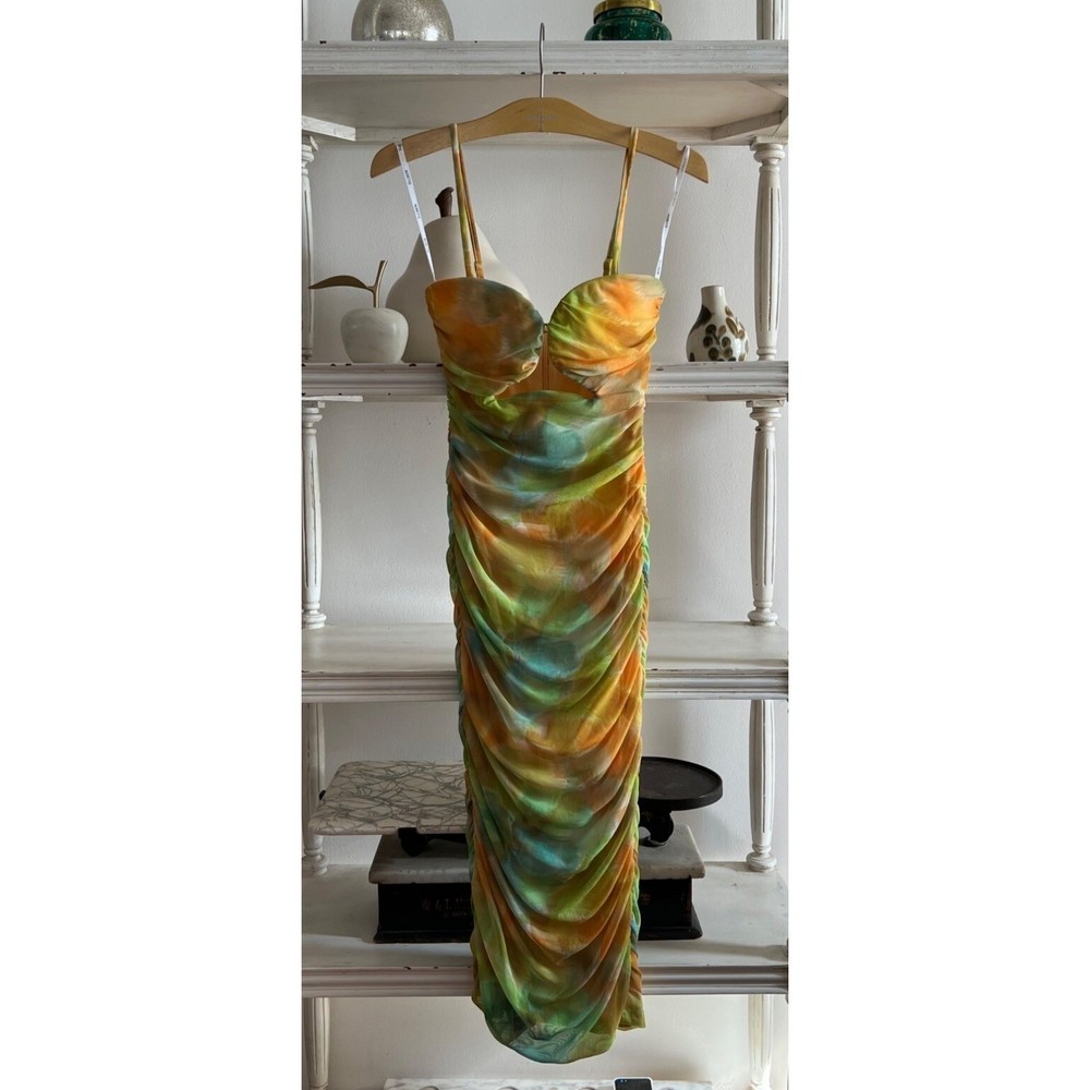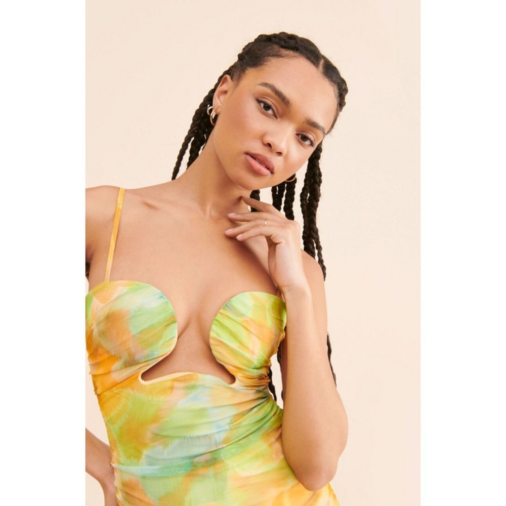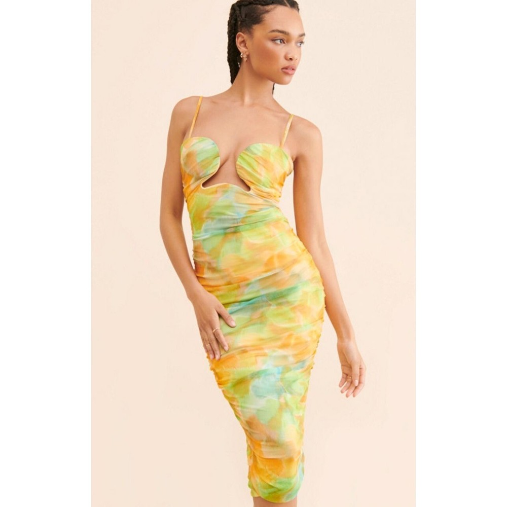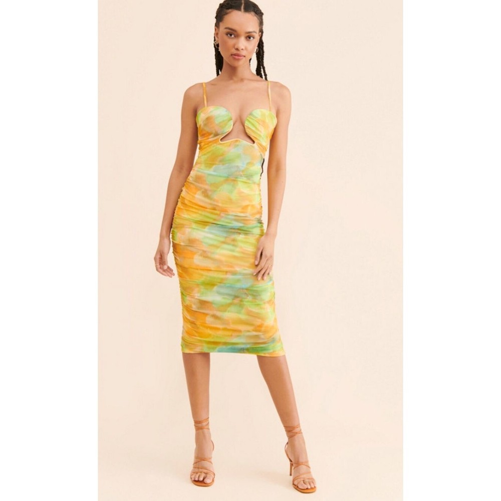 New without tags Audette Studios Joss Mesh Midi Dress Size XS Retail $268 Polyester, Elastane Mesh midi dress in ruched fabrication w/ front cutout for added shape Adjustable straps Zip closure Stretchy, mesh material Fits true to size Label has been marked to prevent store returns