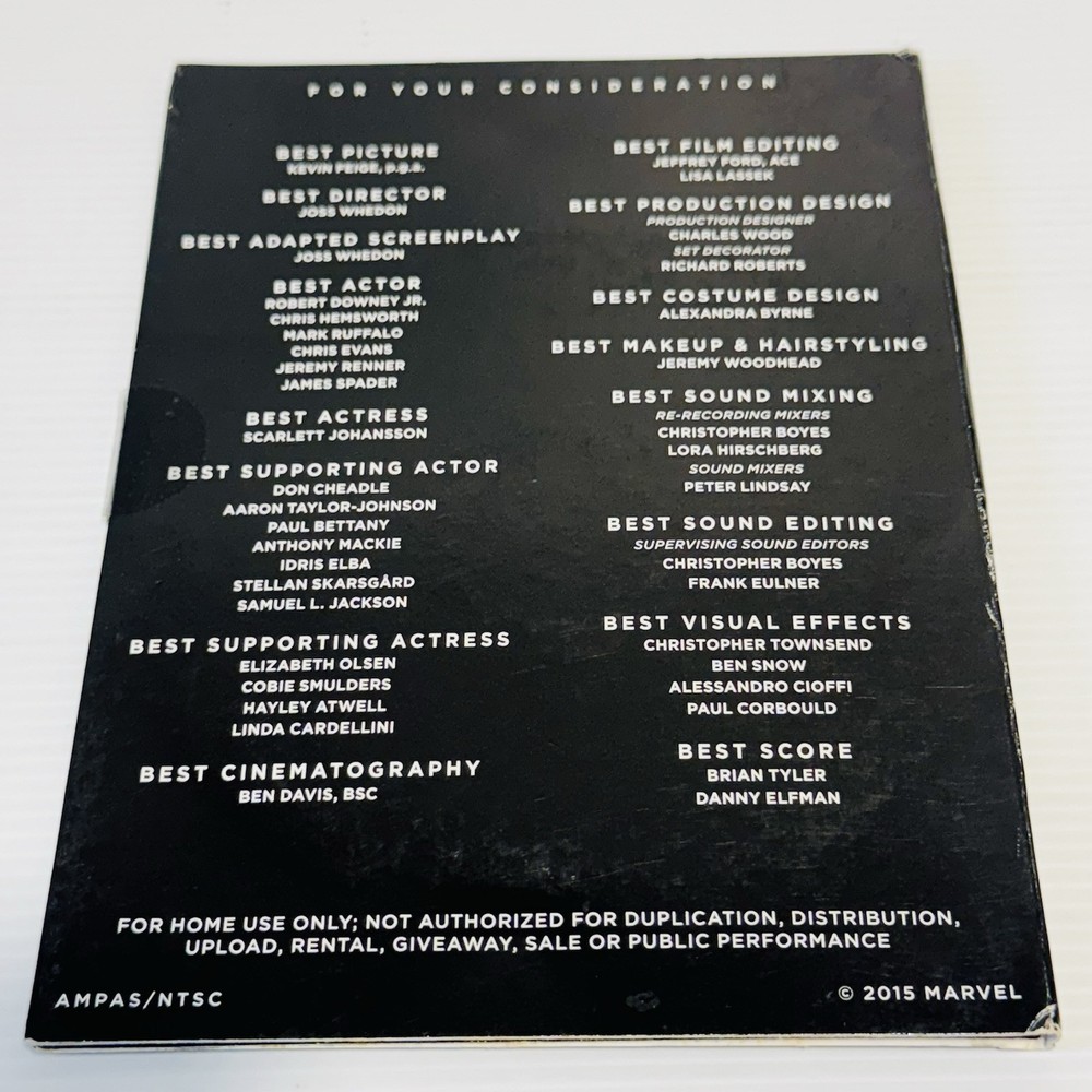 Avengers Age Of Ultron 2015 Award Screener DVD For Your Consideration is a limited edition promotional DVD of the action-packed superhero film directed by Joss Whedon. Featuring an ensemble cast including Chris Hemsworth, Mark Ruffalo, Robert Downey Jr., and Scarlett Johansson, this DVD is a must-have for Marvel Studios fans and collectors. With a runtime of 141 minutes, this modern blockbuster is perfect for fans of military/war, action, and sci-fi & fantasy genres. Get your hands on this rare special edition Award screener DVD to experience the thrill of Avengers: Age of Ultron in the comfort of your own home. Free tracked postage included Australia wide for your convenience.