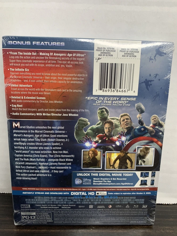 Experience the ultimate action-packed adventure with Avengers: Age of Ultron in stunning SteelBook BlueRay. This limited edition collector's item features the iconic characters of Iron Man, Captain America, and Thor, as they battle the powerful Ultron in a thrilling martial arts and superhero storyline. Directed by Joss Whedon, this movie is a must-watch for fans of the genre. The Blu-ray format is compatible with Region Free and DVD: 1 (US, Canada...) players, making it easy to enjoy this special edition SteelBook movie at home. With additional scenes, commentary, and behind-the-scenes featurettes, this action-packed adventure is sure to keep you on the edge of your seat from beginning to end.