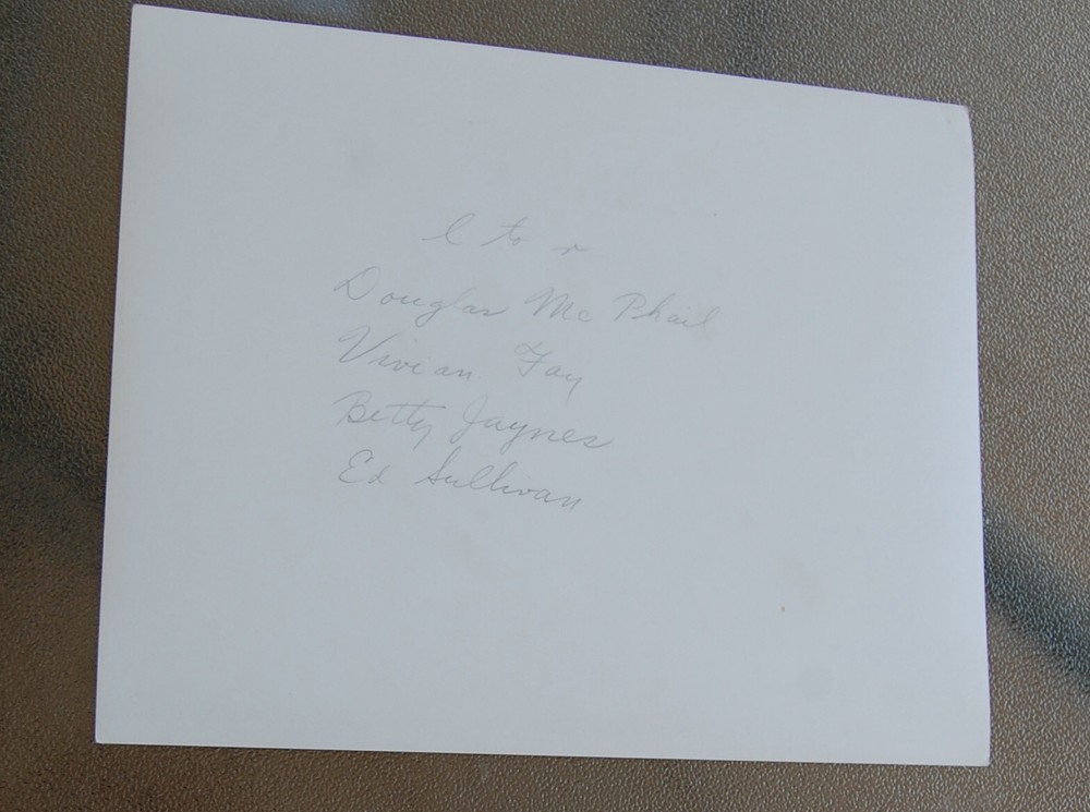 Here is an original glossy publicity still from Ed Sullivan's production Stardust Cavalcade in 1940. This photo has Douglas McPhail, Vivian Fay, Betty Jaynes and Ed Sullivan. Names are written on the back in pencil. 8" X 10" Buy from a trusted and reliable seller. I source my items from estate sales, thrift shops, auctions and yard sales. My home is non-smoking and pet-friendly but I cannot vouch for their original homes.
