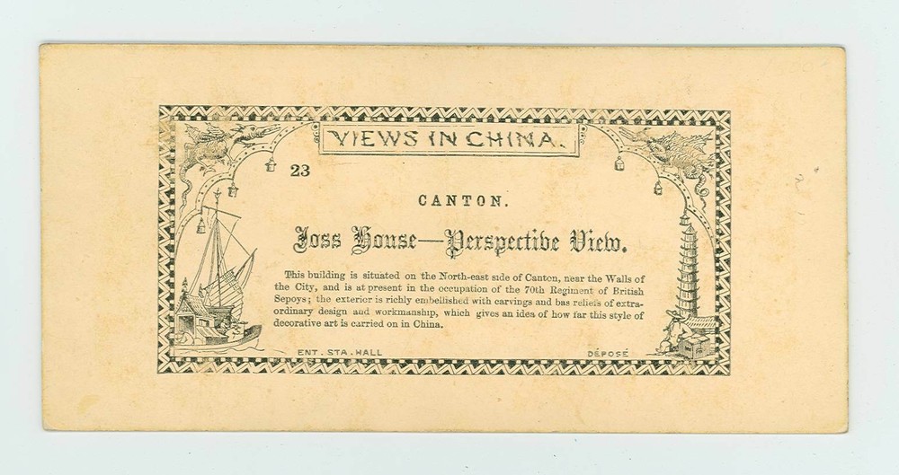 View photographed by Pierre Rossier in 1859, Published by Negretti and Zambra, No. 23 is titled Joss House, Perspective View, Canton. View has detailed description on verso. View is in very good condition. See our other views. Please note that our scanner does not like curved mount views very well. Any lightness or reddish color effects at the bottom of the view or blue tones at the right are complements of the scanner. THESE ARE ORIGINAL VIEWS, NOT REPRINTS. Email us via ebay with any questions prior to bidding.