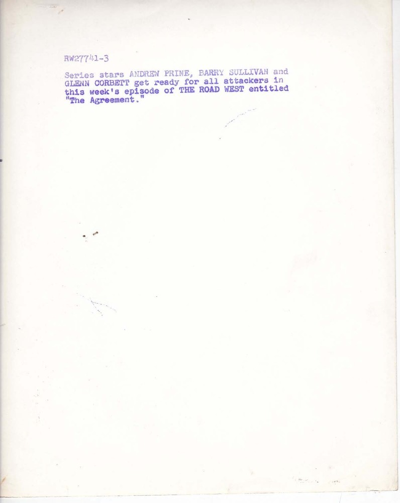 Now offering an original vintage TV photo. This is an original photograph, not a modern reproduction or re-print. Artists portrayed: ANDREW PRINE - BARRY SULLIVAN - GLENN CORBETT Series Title: THE ROAD WEST Episode Title: The Agreement Year / Country: 1967 - USA Company: N/A Still number: RW 27741-3 Photo measures approx.: 8" x 10", printed on single weight paper with glossy finish Condition: Excellent minus (Tiny tear at top right border not reaching image area) Ref #: TV-18 Comments: "The Road West" is an American Western television series that aired on NBC from September 12, 1966, to May 1, 1967. Ben Pride moves with his children Timothy, Midge, and Kip, his new wife Elizabeth, his father Tom, and his brother-in-law Chance from Ohio to Kansas during the 1860s. The show centers around the difficulties the family faces taming the land and homesteading. Shipping via FedEx International Priority for 1 up to 20 similar items: US$ 25 to USA, CANADA and Americas, US$ 30 to EUROPE and US$ 35 to the rest of the World