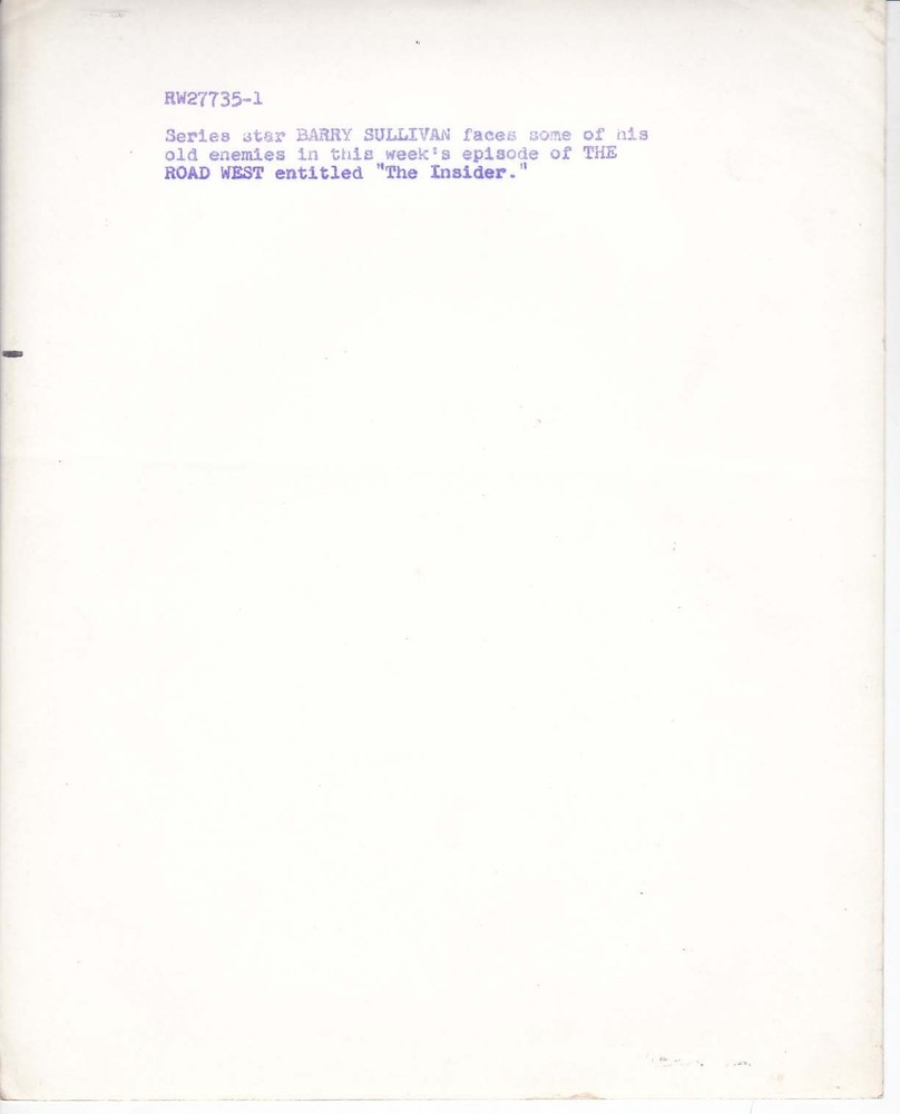 Now offering an original vintage TV photo. This is an original photograph, not a modern reproduction or re-print. Artists portrayed: BARRY SULLIVAN and others Series Title: THE ROAD WEST Episode Title: The Insider Year / Country: 1967 - USA Company: N/A Still number: RW 27741-3 Photo measures approx.: 8" x 10", printed on single weight paper with glossy finish Condition: Excellent Ref #: TV-19 Comments: "The Road West" is an American Western television series that aired on NBC from September 12, 1966, to May 1, 1967. Ben Pride moves with his children Timothy, Midge, and Kip, his new wife Elizabeth, his father Tom, and his brother-in-law Chance from Ohio to Kansas during the 1860s. The show centers around the difficulties the family faces taming the land and homesteading. Shipping via FedEx International Priority for 1 up to 20 similar items: US$ 25 to USA, CANADA and Americas, US$ 30 to EUROPE and US$ 35 to the rest of the World
