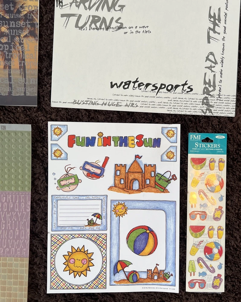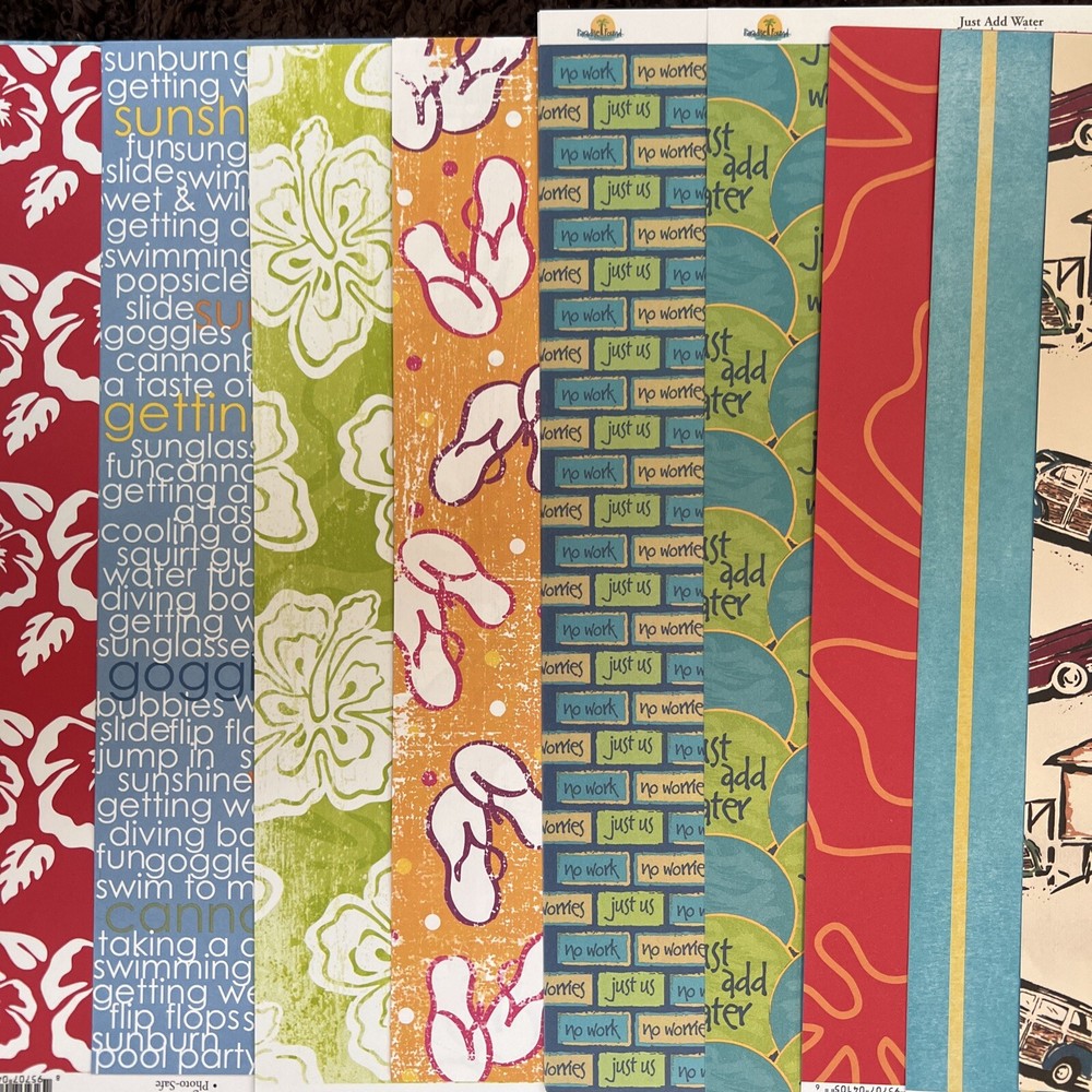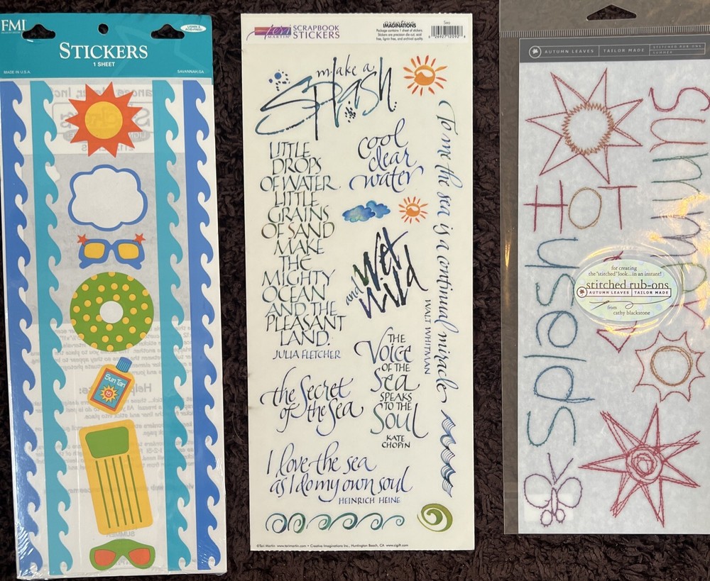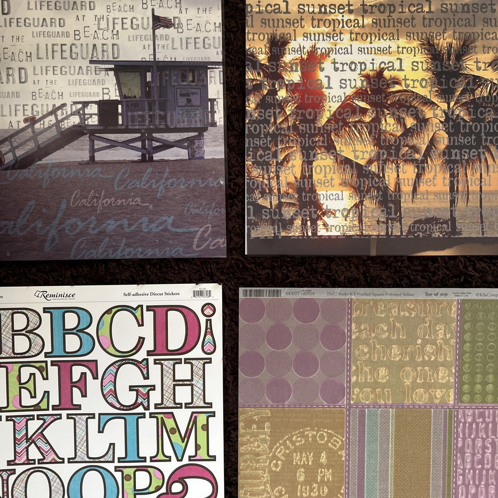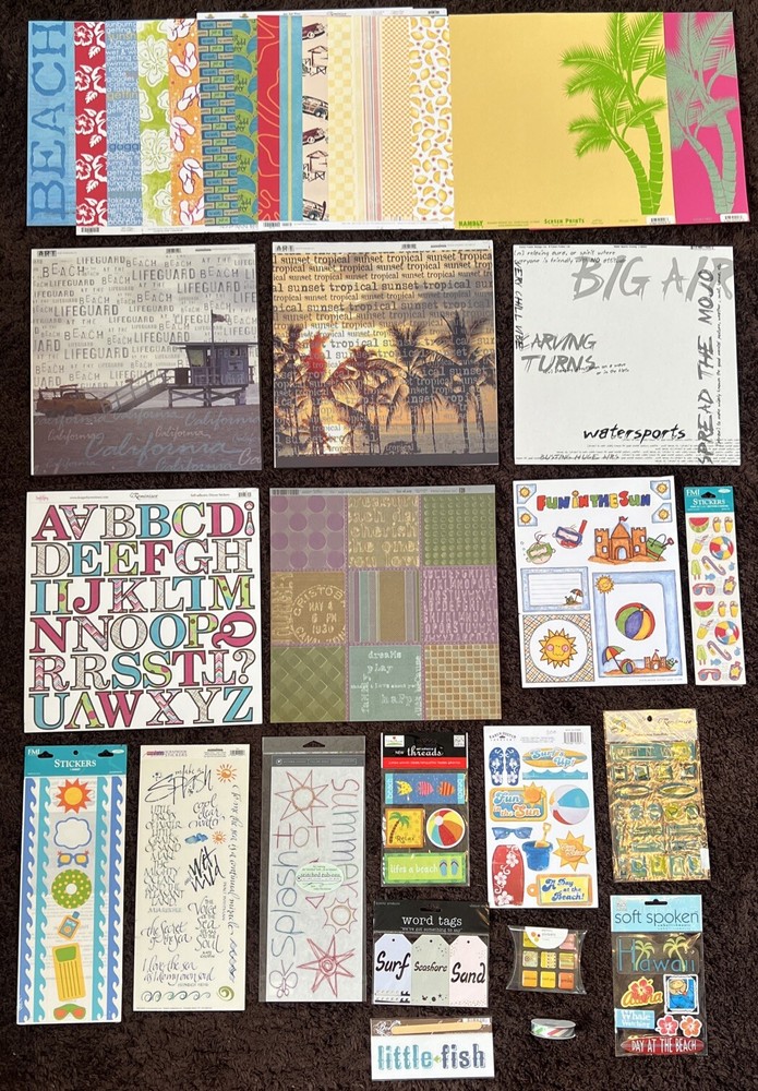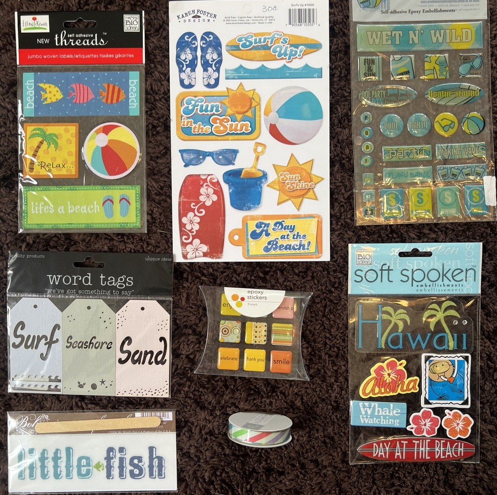 This is a BEACH themed embellishments kit that features products from Memories Complete, BoBunny, Reminisce, Creative Imaginations, Karen Foster, Hambly, Provo Craft, American Crafts, BOP, Deluxe Cuts, Frances Meyer, K & Company, All My Memories, Me and My Big Ideas, My Minds Eye, and Cathy Blackstone. It includes 22 12x12 papers, borders, stickers, velum, rub ons, fabric labels, tags, ribbon, sayings, acrylics, epoxy embellishments, frames, 3 overlays, and alphabets. This is great for scrapbooking, card making, and crafting. I am happy to combine shipping so check out my other listings. Smoke-free pet free home