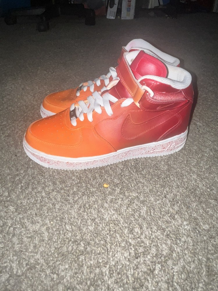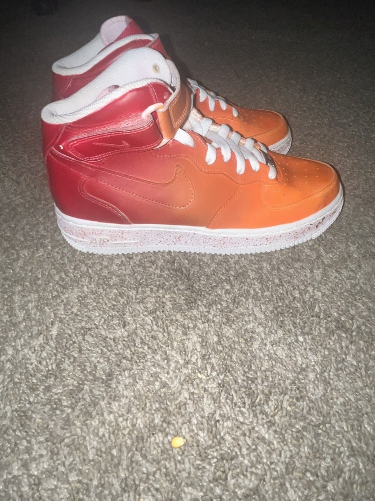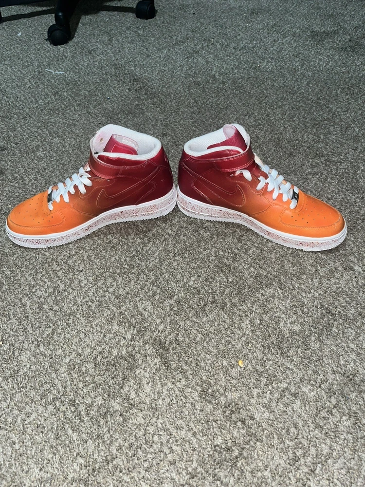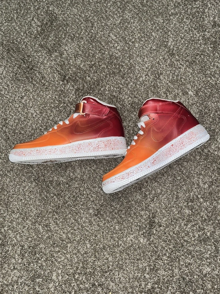 These custom-painted Nike Air Force 1 Mid '07 shoes are a unique find! Barely worn with a fresh paint job, they still look great—only minimal wear near the inner Velcro. Super comfortable with padded support and breathable perforations. The Velcro straps just need a quick fix. A steal for someone who loves bold, one-of-a-kind kicks that stand out! Perfect for anyone wanting a stylish, custom look without the price of a brand-new pair.