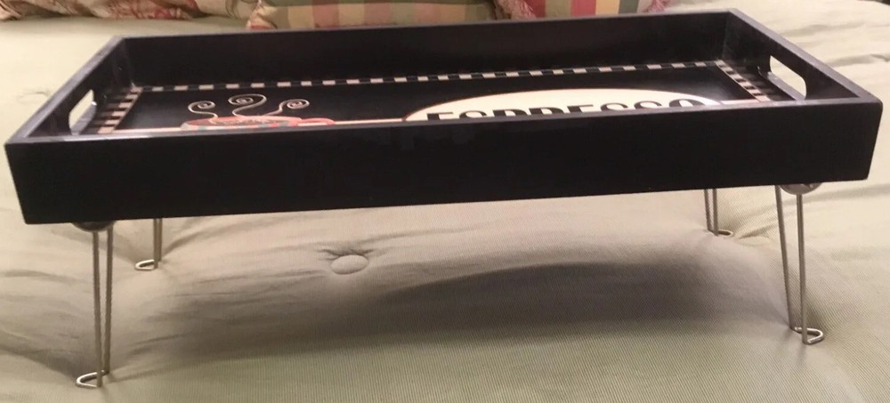 DECORATIVE BREAKFAST SERVING TRAY BY CREATIVE CO-OP *WOOD FOLDING TRAY WITH METAL LEGS *BLACK WOOD BACKGROUND *THE WORD "ESPRESSO" ON TOP OF TRAY *SIZE IS MEDIUM TO LARGE, IN GENERAL *LENGTH = 25 INCHES *WIDTH = 12 INCHES *DEPTH = 2.5 INCHES W/O LEGS EXTENDED *HEIGHT = 10 INCHES WITH LEGS EXTENDED *LEGS = 8 INCHES *WEIGHT = 5 LBS *ITEM #HD3753A FROM CREATIVE CO-OP PLEASE SEE MY OTHER LISTINGS AND HAVE A MERRY CHRISTMAS!