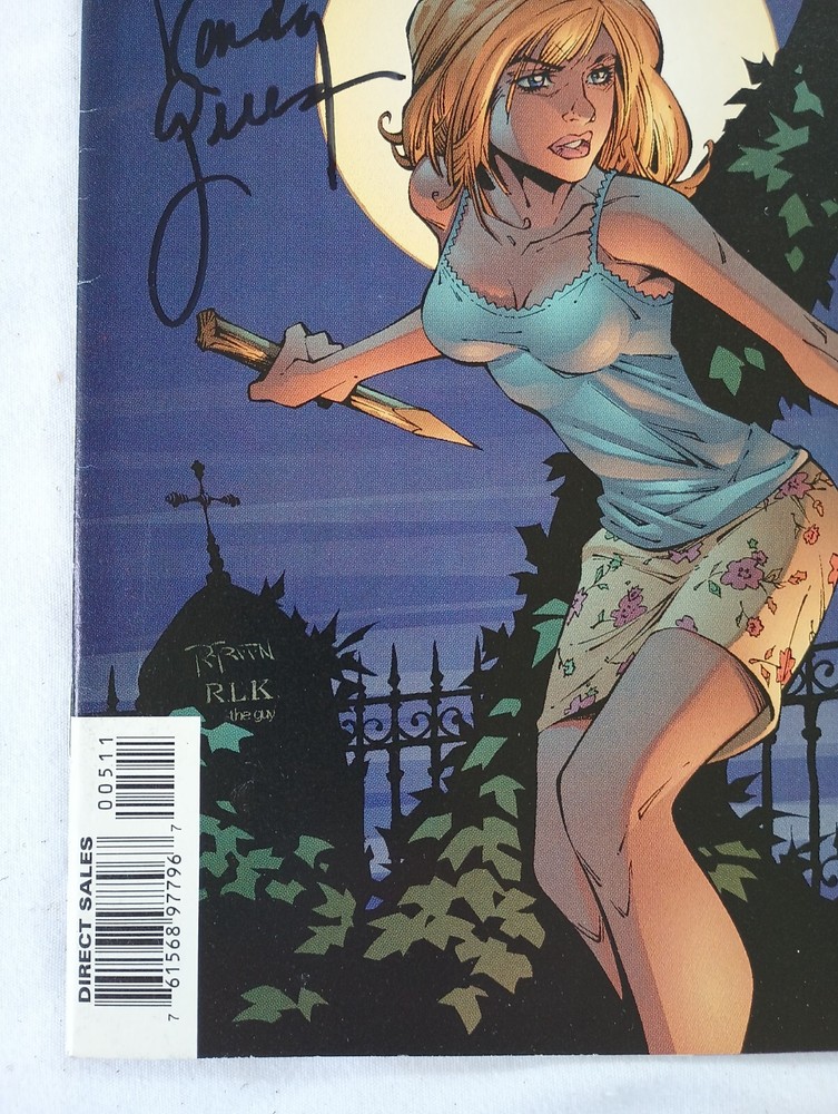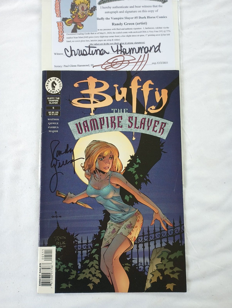 This is an amazing issue of Buffy the Vampire Slayer #5B, signed by Randy Green , the cover artist. This comic book is a first edition, monthly publication from Dark Horse Comics, released in 1999. The story title is "Happy New Year" and it features the iconic characters of Buffy the Vampire Slayer, Willow, and Angel. The comic is in 8.0 Very Fine grade @ 77% market Near Mint and comes bagged & boarded, newsstand "B" variant cover, and a witnessed & notarized certificate of authenticity (COA). This comic is perfect for collectors and fans of the Buffy the Vampire Slayer series as well as a must-have for anyone who loves action, superheroes, bad/good girl art, supernatural, vampire, horror & sci-fi, action/adventure, and/or science fiction genres. While many comic books based on the television series " Buffy the Vampire Slayer " were published when the television show was on air they are not all considered c anonical and often deal with characters who do not appear in the television series, most notably in the " Tales of the Slayers " and " Tales of the Vampires " mini-series. This first series of books were published by Dark Horse Comics between 1998 and 2004, originally in comic format but then gathered into volumes of trade paperbacks . A small number of Buffy comics have not been included in trade paperbacks, such as the books entitled "Giles", "Jonathan", and "Reunion". The stories in the Buffy comics take place in between episodes of the " Buffy the Vampire Slayer " TV series , and continue after the series ended. Issues #1 - #63 take place during the period that the series was still on air, and none are written by Joss Whedon himself. The earlier issues are not very easy to place in the series other than the season they are set in. The stories get more specific later on, however; for example, the " Oz" (Buffy) comics fill in the story line of Oz's character after he leaves the TV series, and the " Death of Buffy " comics clearly take place between Seasons #5 and #6 of the series. Following the television series finale, Dark Horse began releasing new books titled Season Eight (8), Nine (9), and Ten (10), and the various spin-offs, which are written and/or supervised by creator Joss Whedon and officially recognized as canon to the show. Series creator Joss Whedon and a number of writers involved with the television series authored many of the comic books. Overviews summarizing the comic books' storylines were written early in the writing process and were 'approved' by both/either the Fox Network and/or Joss Whedon (or his office), and the books were, therefore, later published as official Buffy merchandise. Randy Green is a comic artist/inker living near Greenville, SC and started his illustrious career inking the back inside covers of Dark Horse Comics "Comics Greatest World". He has worked for all of the larger comic publishers including Marvel, DC, Image & Dark Horse. Please notice his attention to detail on this cover (& especially check out #8)