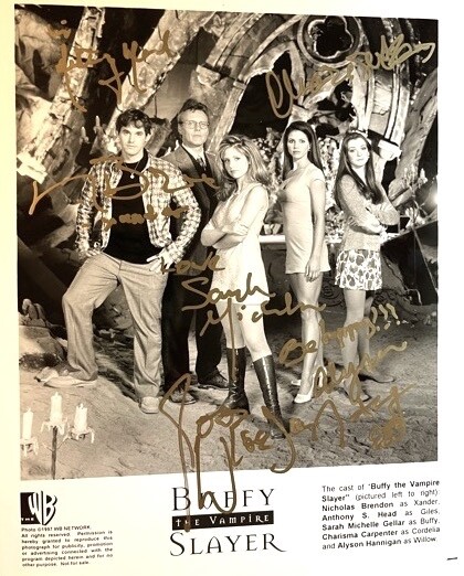 BUFFY The Vampire Slayer Season 1 8x10 photo cast signed by Sarah Michelle Gellar, Nicholas Brendon, Alyson Hannigan, Anthony Head, Charisma Carpenter, and Joss Whedon. We do not sell preprints, facsimiles or secretarial signatures. We do the hard work for you. Hours in the sun, rain or cold, we are the ones that are backstage, at the premieres, and conventions. 35 years of in-person collecting! Each piece includes, a tamper proof hologram with matching numbers, and an embossed Certificate of Authenticity. Upholding a high standard of scrutiny. Standard photographic image sizes are approximately 8x10 inches. Each piece has sharp corners unless otherwise noted. Our collection has always been stored in a smoke free environment. Photographs are shipped in a rigid top loader for support and preservation. We use brand new photo mailers backed with cardboard, and each are stamped with “Please do not bend”. Free trackable shipping worldwide!