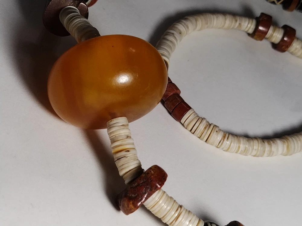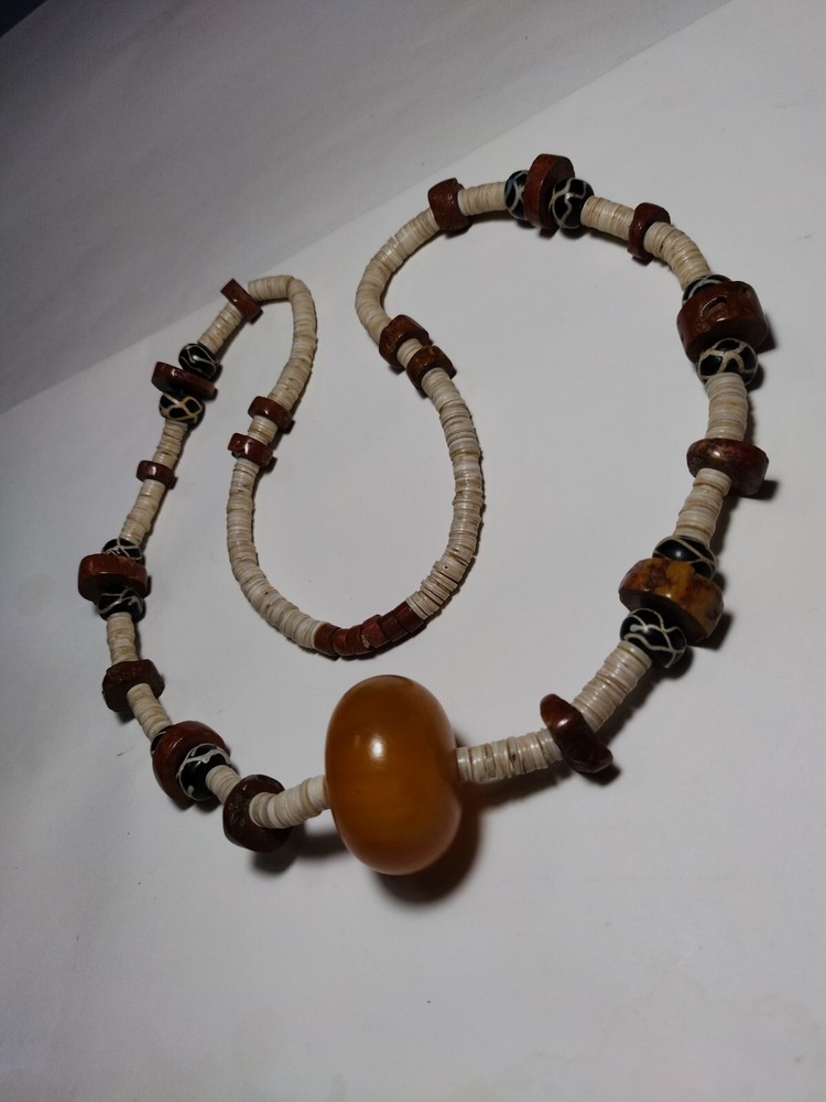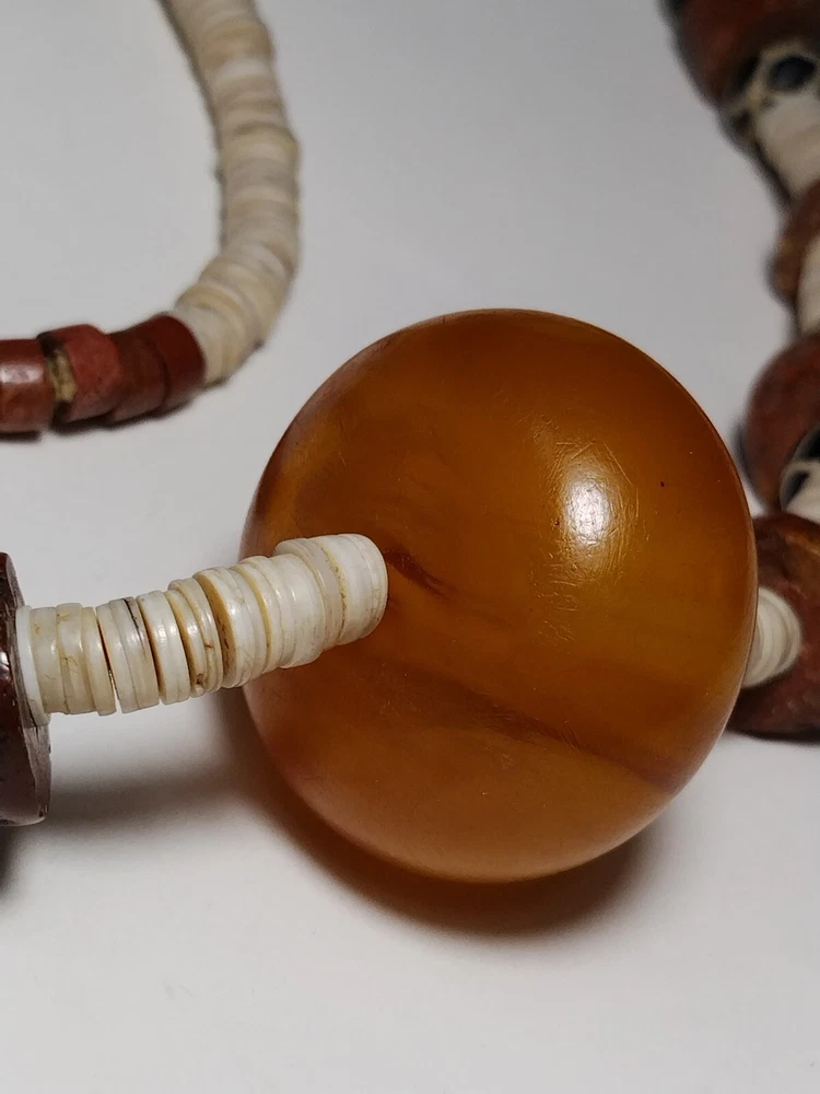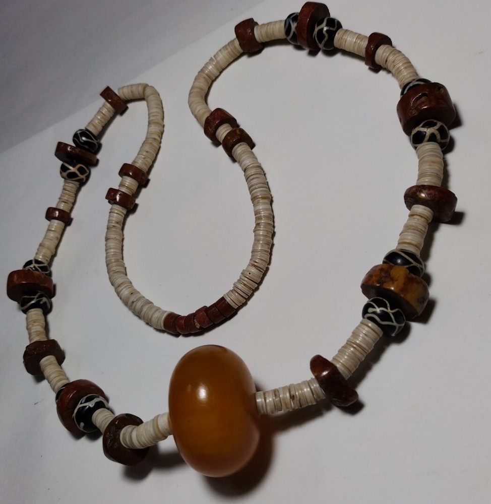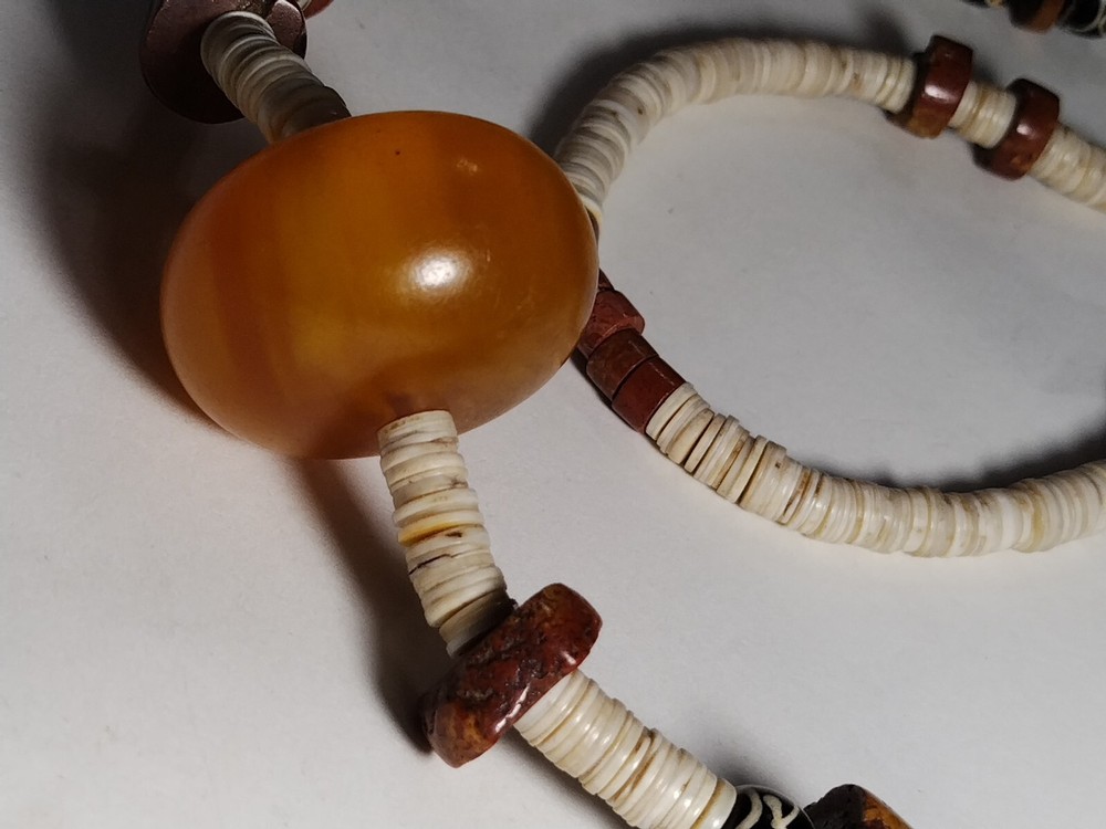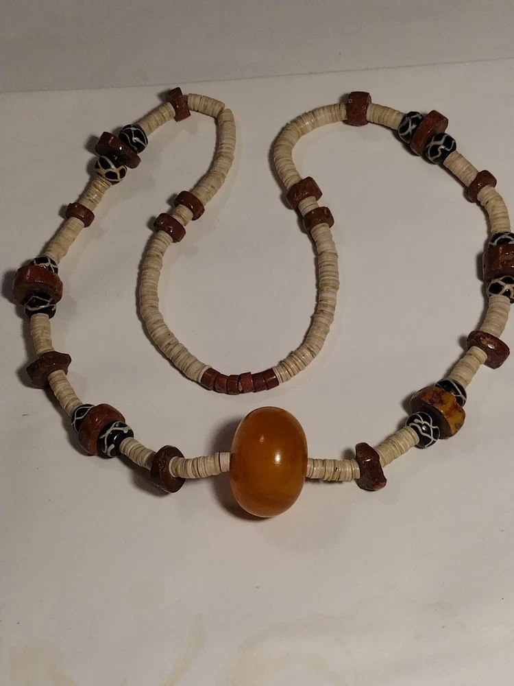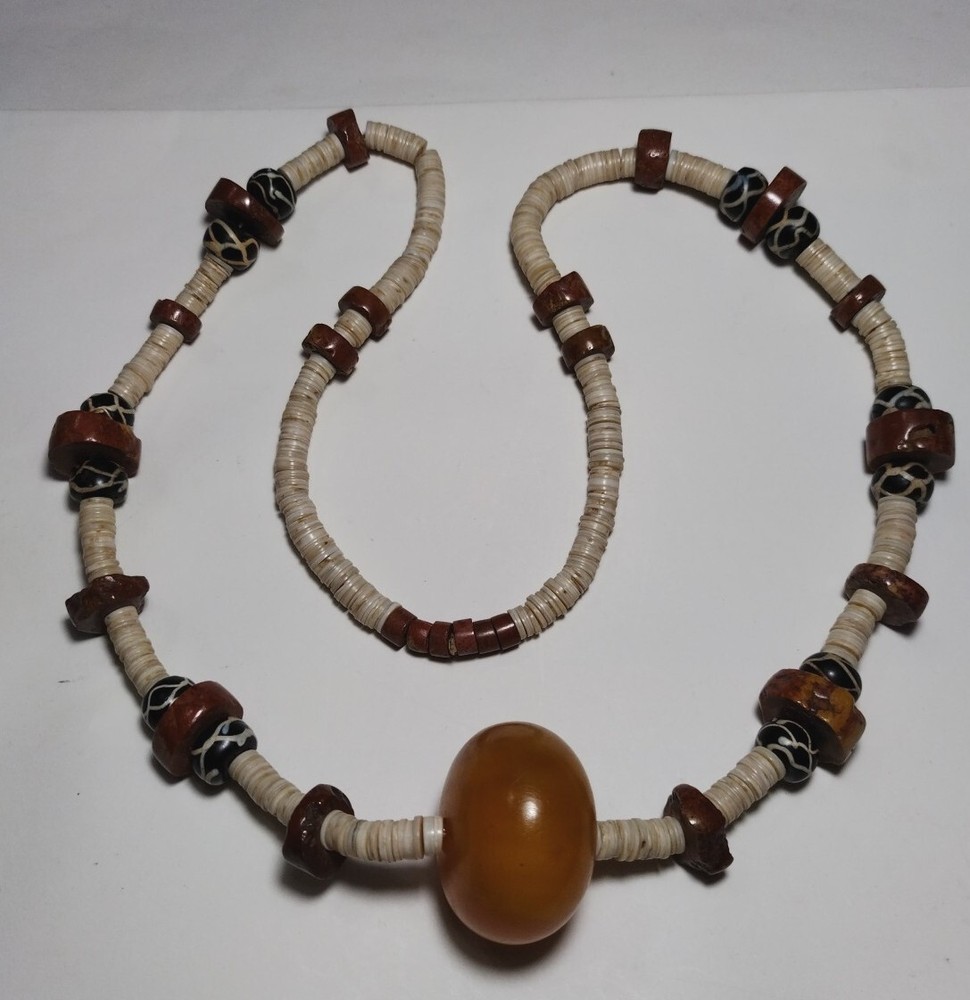 This vintage necklace features butterscotch-colored, natural bakelite beads in a heishi style, with a round pendant and a bead closure. The necklace is 30 inches long and weighs 158 grams, and showcases the tribal style of the Berber people of Morocco. The necklace is handmade, and dates back to the era of 1940-1970. It is in excellent condition and will make an elegant, one-of-a-kind addition to any jewelry collection.