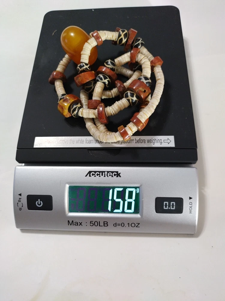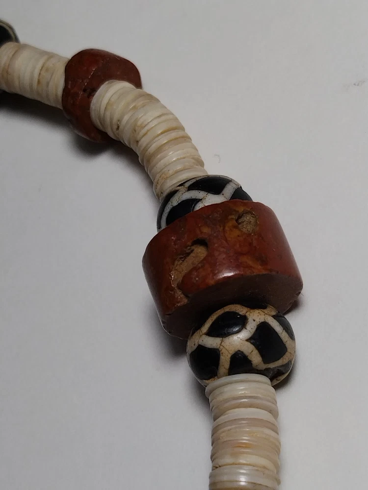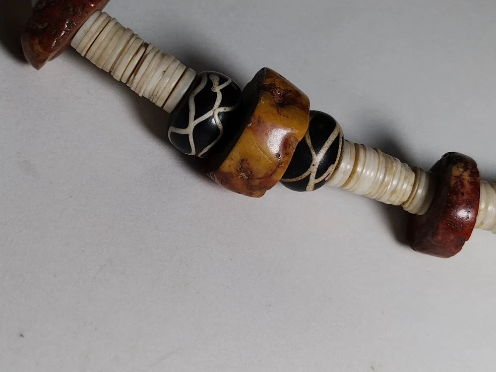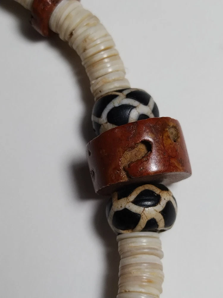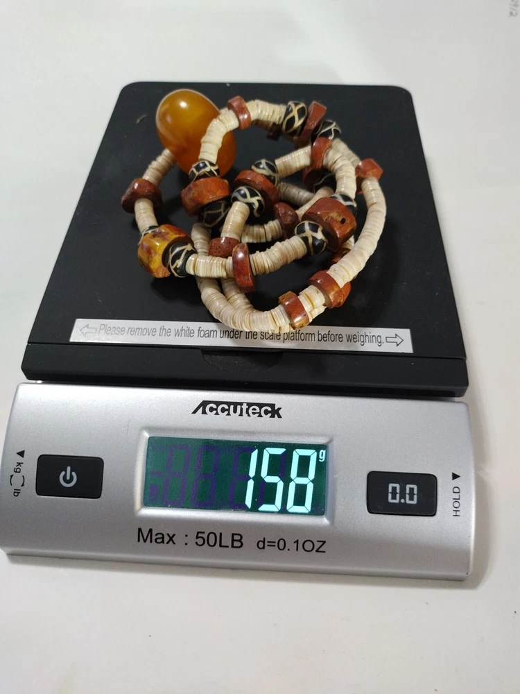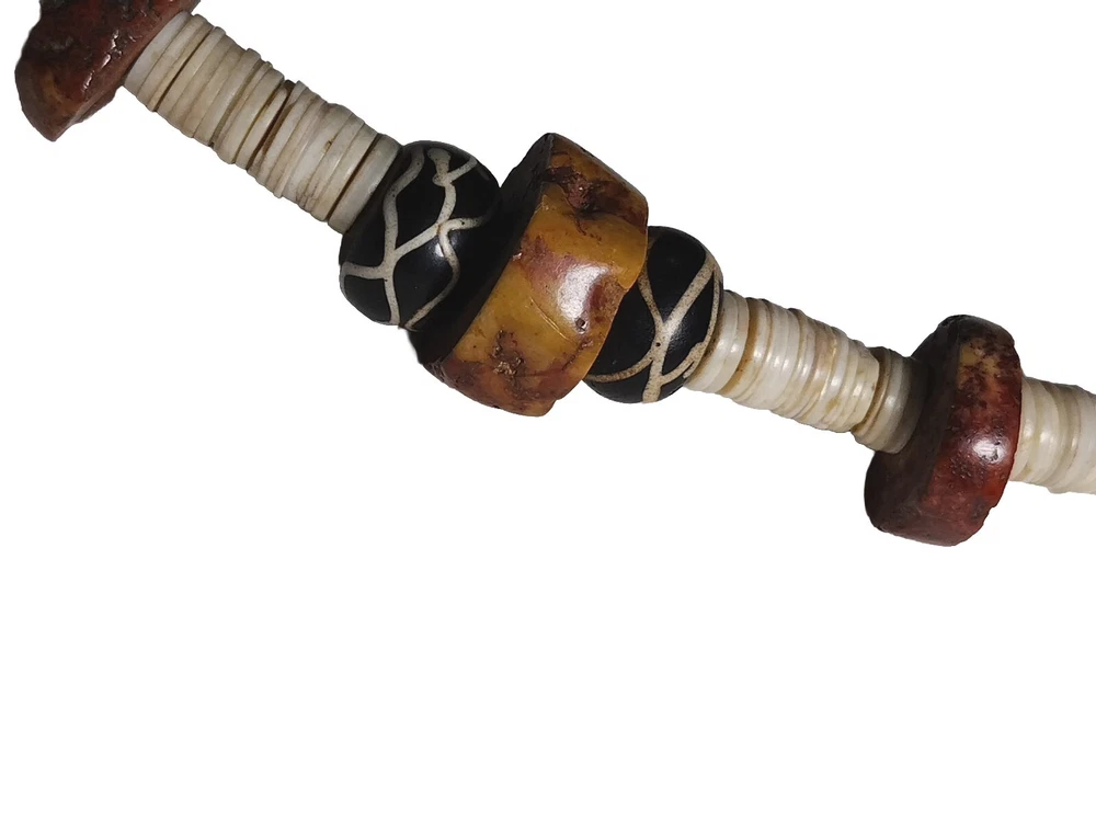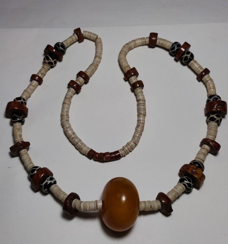 This vintage necklace features butterscotch-colored, natural bakelite beads in a heishi style, with a round pendant and a bead closure. The necklace is 30 inches long and weighs 158 grams, and showcases the tribal style of the Berber people of Morocco. The necklace is handmade, and dates back to the era of 1940-1970. It is in excellent condition and will make an elegant, one-of-a-kind addition to any jewelry collection.