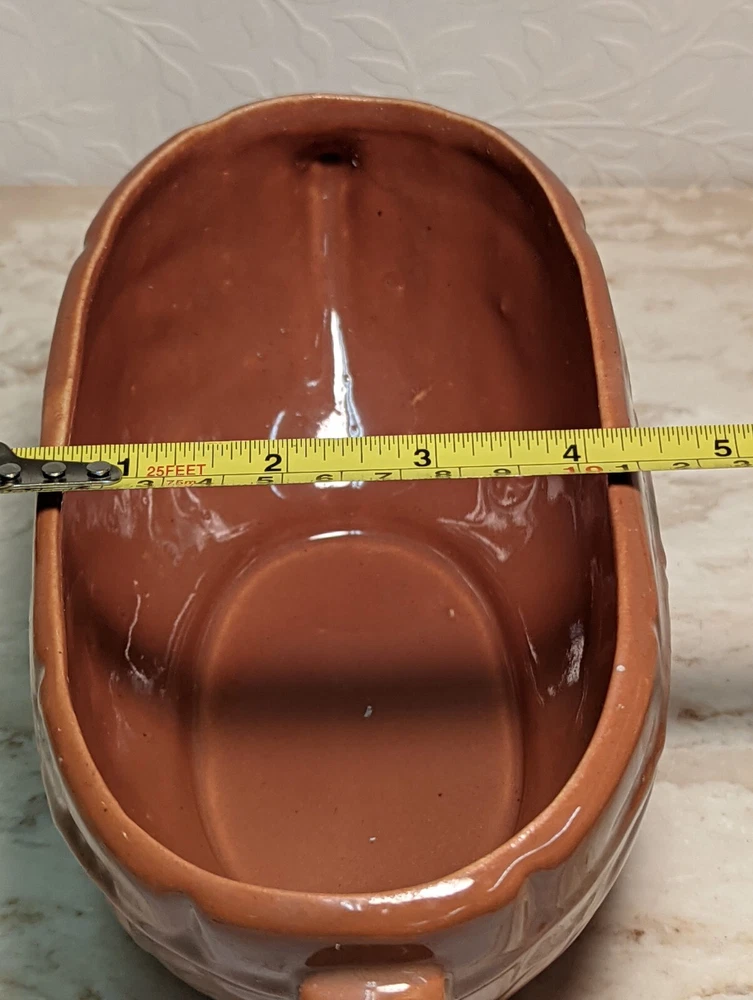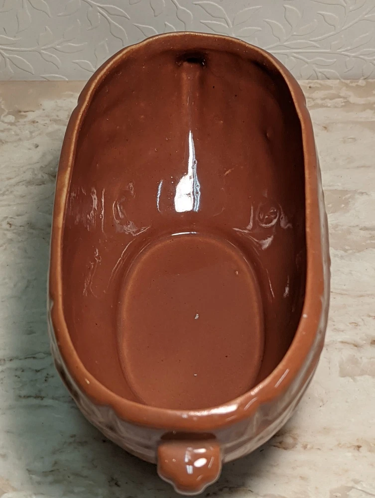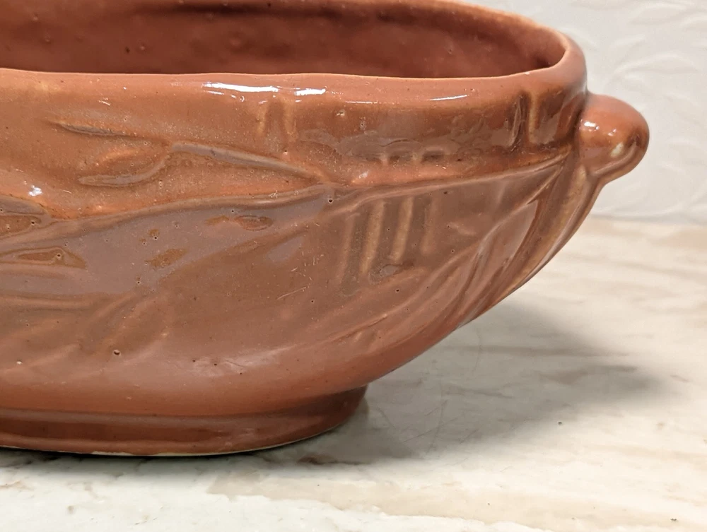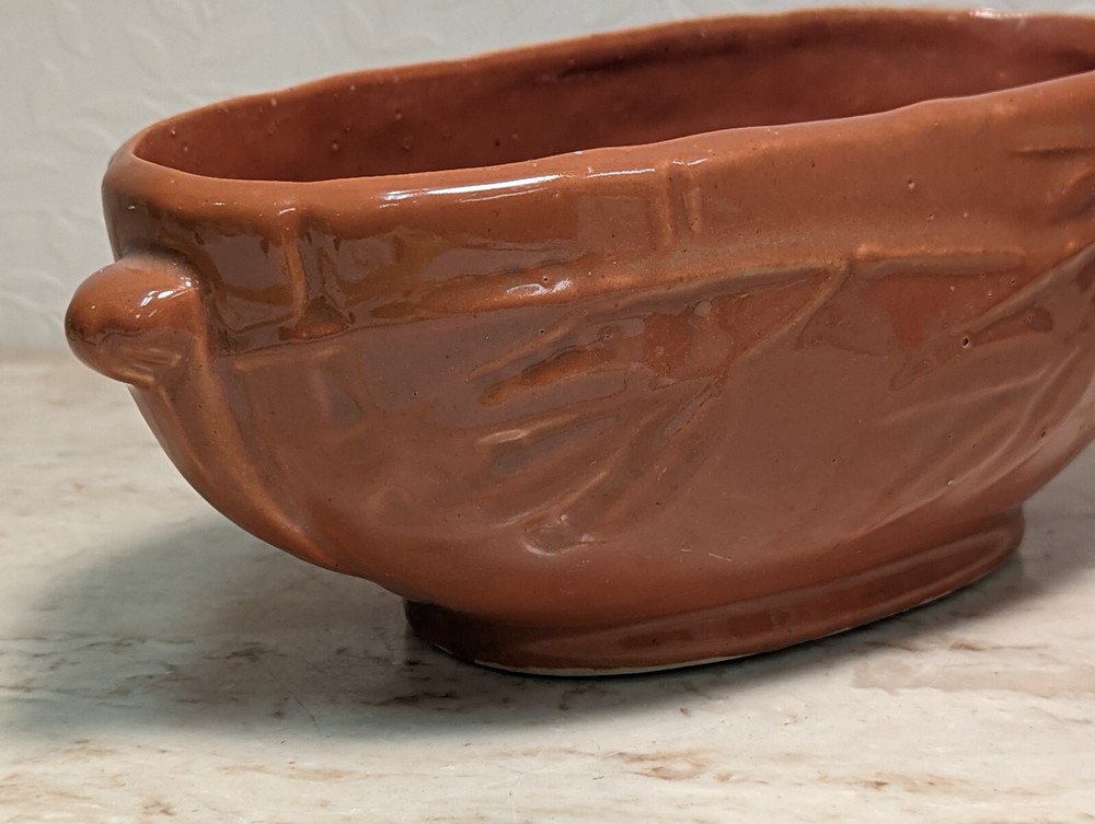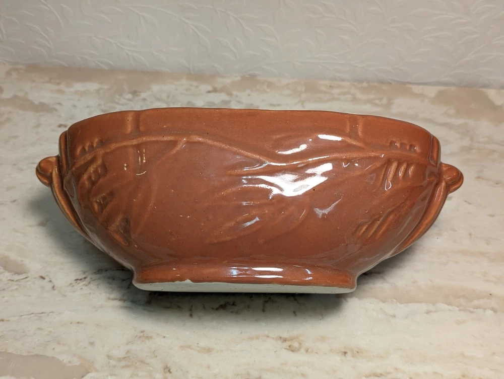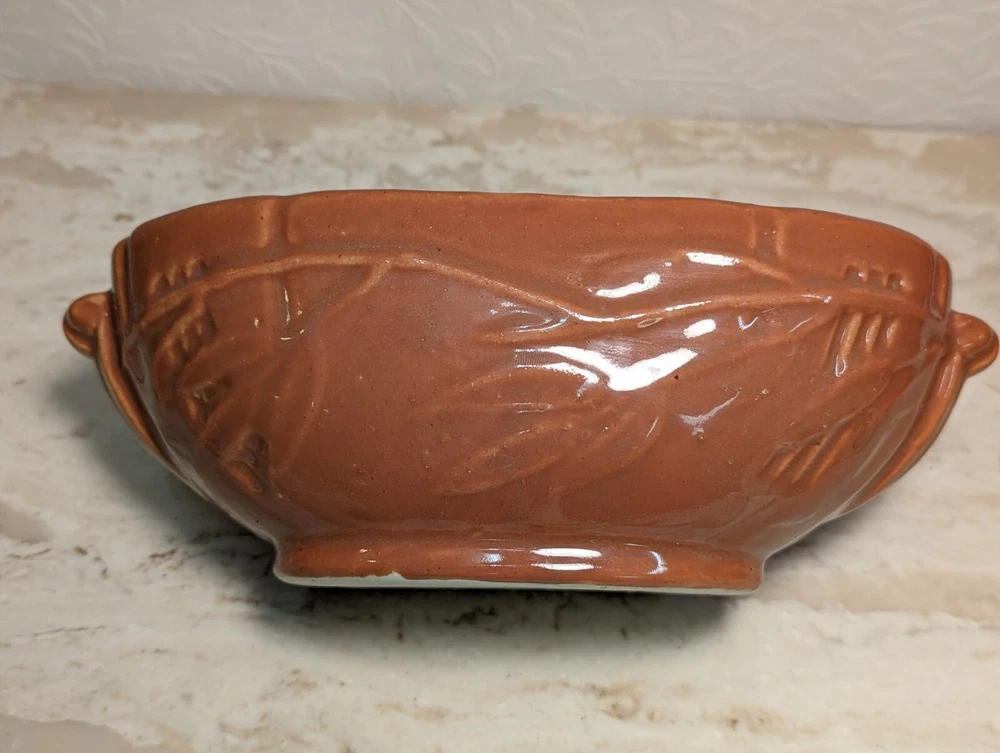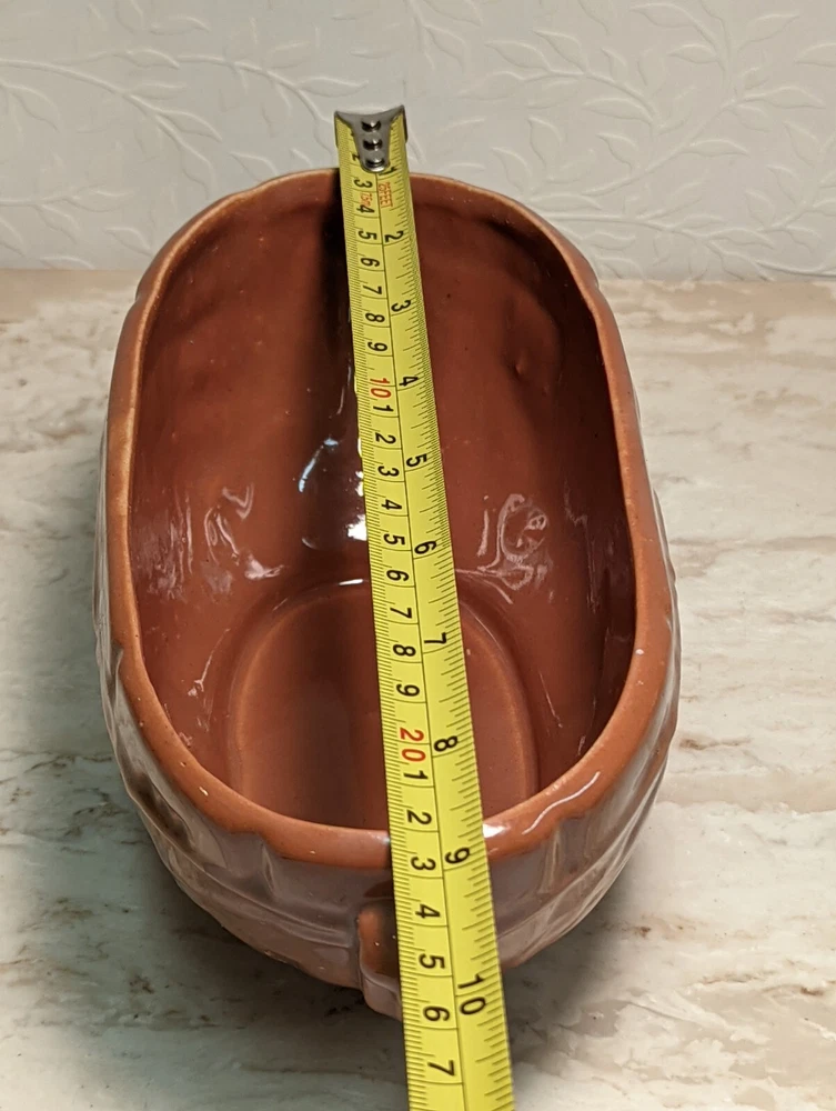 This beautiful vintage planter features a unique mid-century modern design with an orange glossy finish and a decorative 3D effect pattern of bamboo leaves. The oval-shaped pottery piece is handmade and has elegant handles on the sides. Measuring 10 inches in length, 4.5 inches in width, and 3.5 inches in height, this art piece is perfect for adding a touch of vintage charm to any room. It is in excellent vintage condition and comes in its original box. O5.
