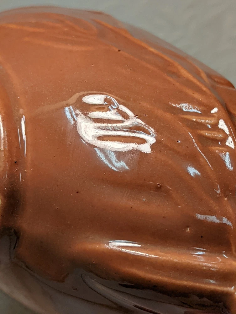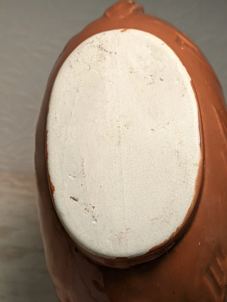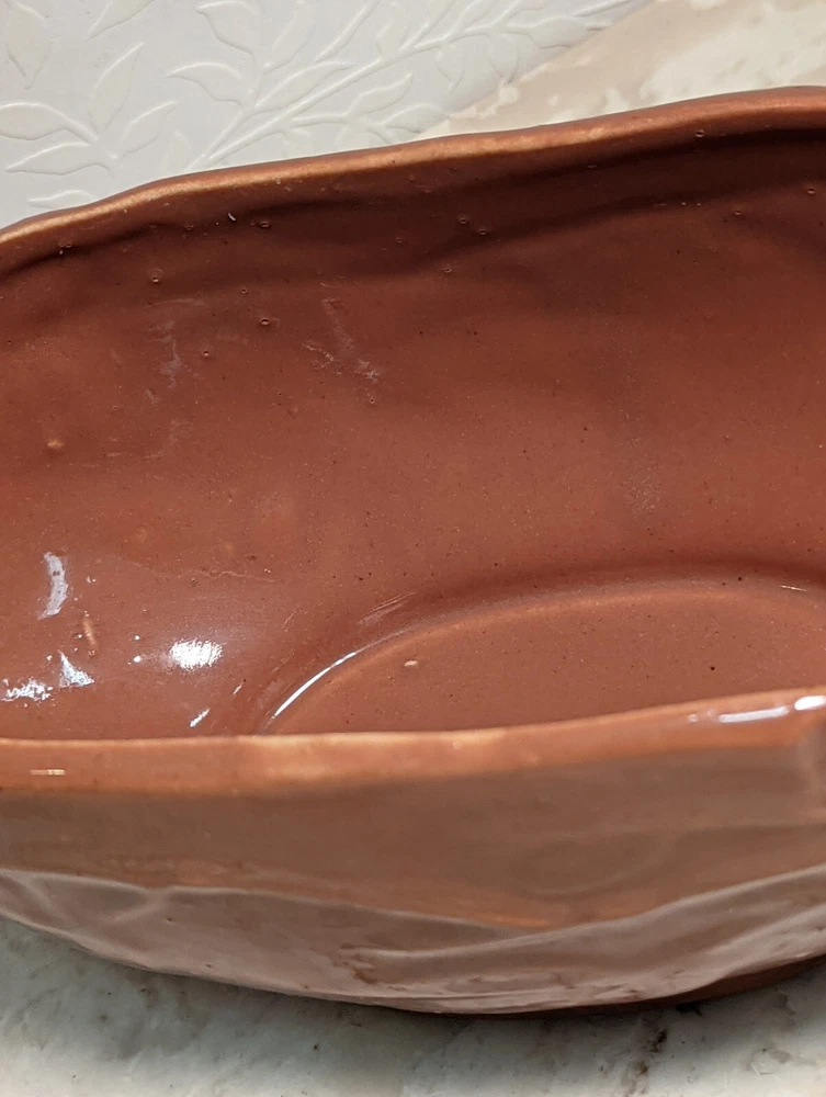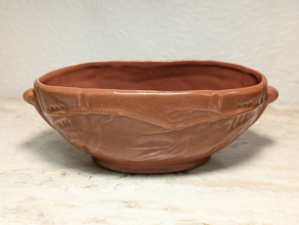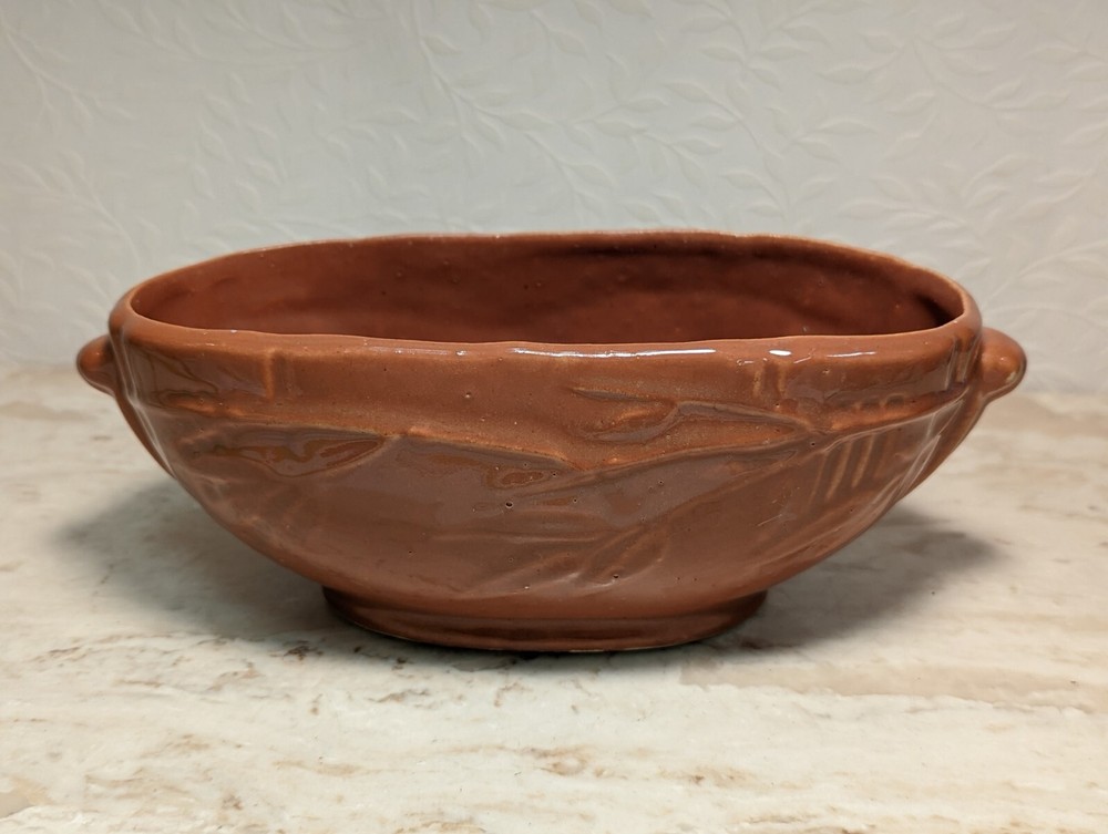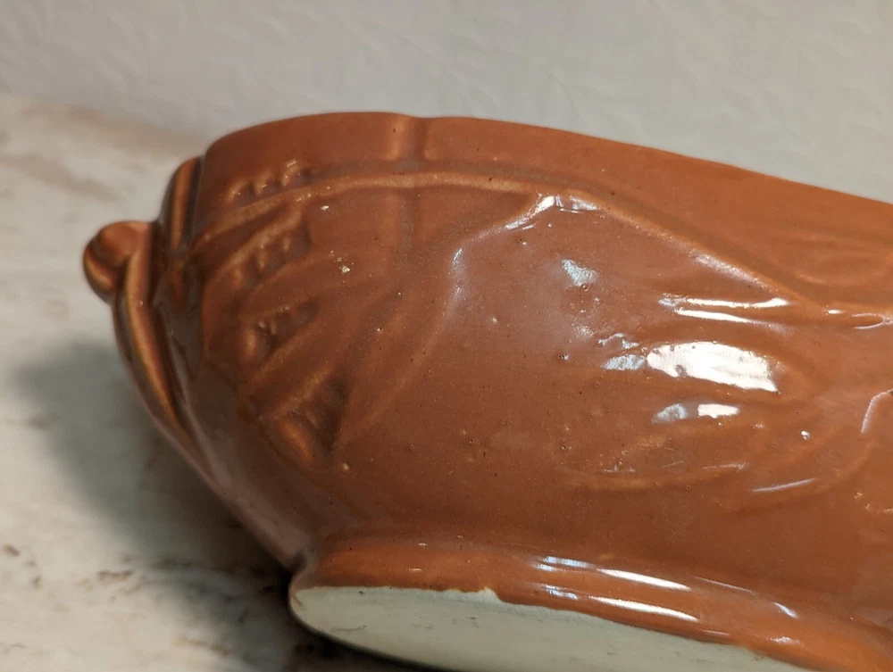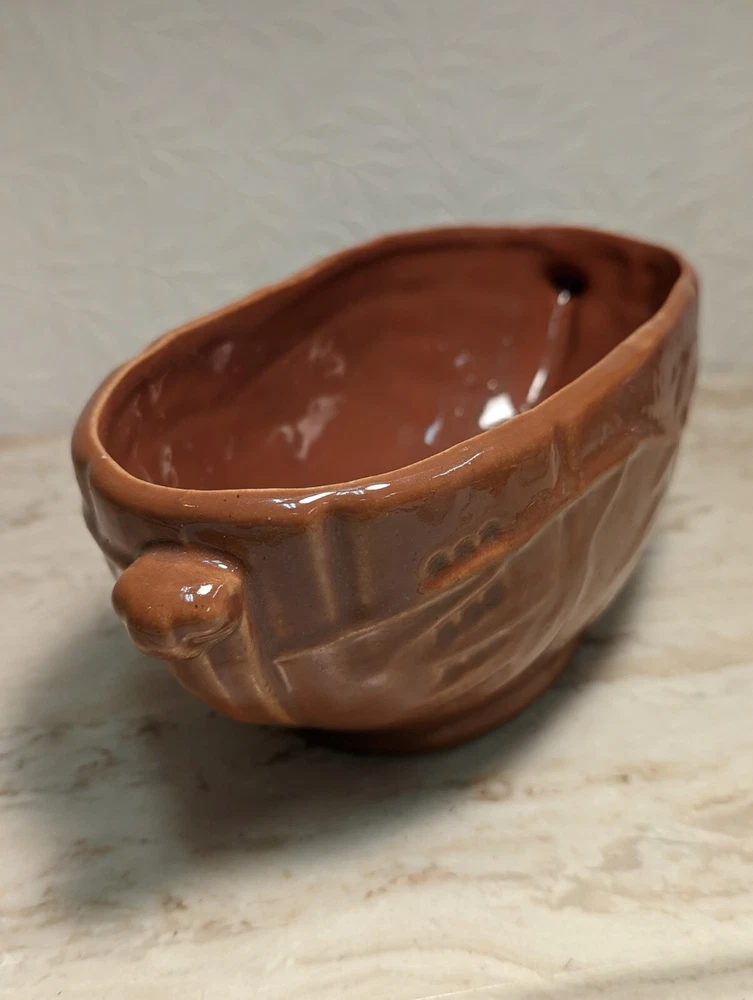 This beautiful vintage planter features a unique mid-century modern design with an orange glossy finish and a decorative 3D effect pattern of bamboo leaves. The oval-shaped pottery piece is handmade and has elegant handles on the sides. Measuring 10 inches in length, 4.5 inches in width, and 3.5 inches in height, this art piece is perfect for adding a touch of vintage charm to any room. It is in excellent vintage condition and comes in its original box. O5.