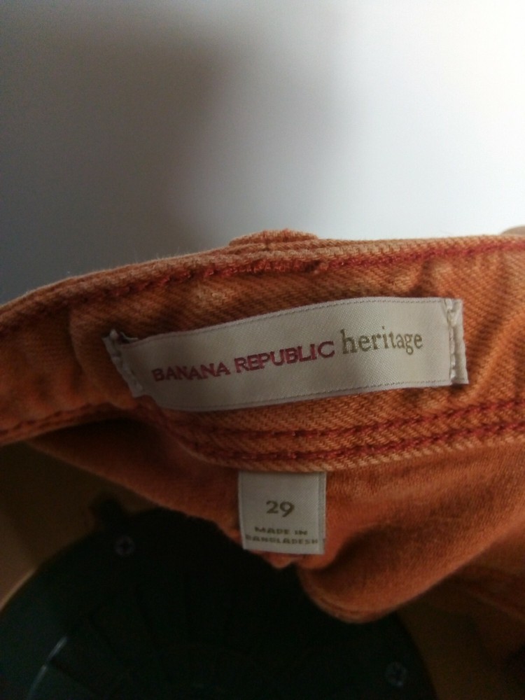 Vintage designer Banana Republic Heritage women`s jeans, orange denim. Size-29. Waist size to fit-34inch. Inside leg-29inch. Material: 99% cotton, 1% elastane. Used, in great condition(see the pictures), the jeans has signs of wearing. Stylish and comfortable, plus great looking. Excellent fashion accent. Any questions please contact seller before you decided to buy. Dispatched with Royal mail, class 2 signed.