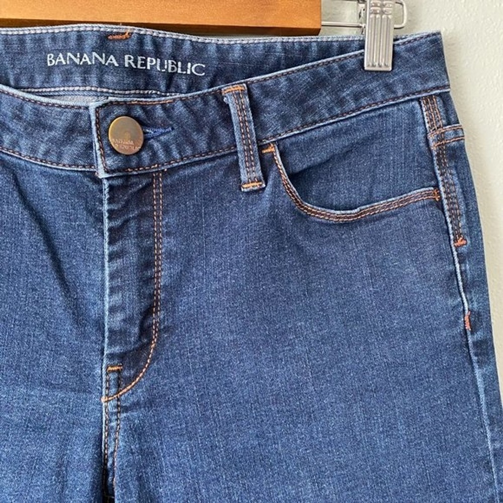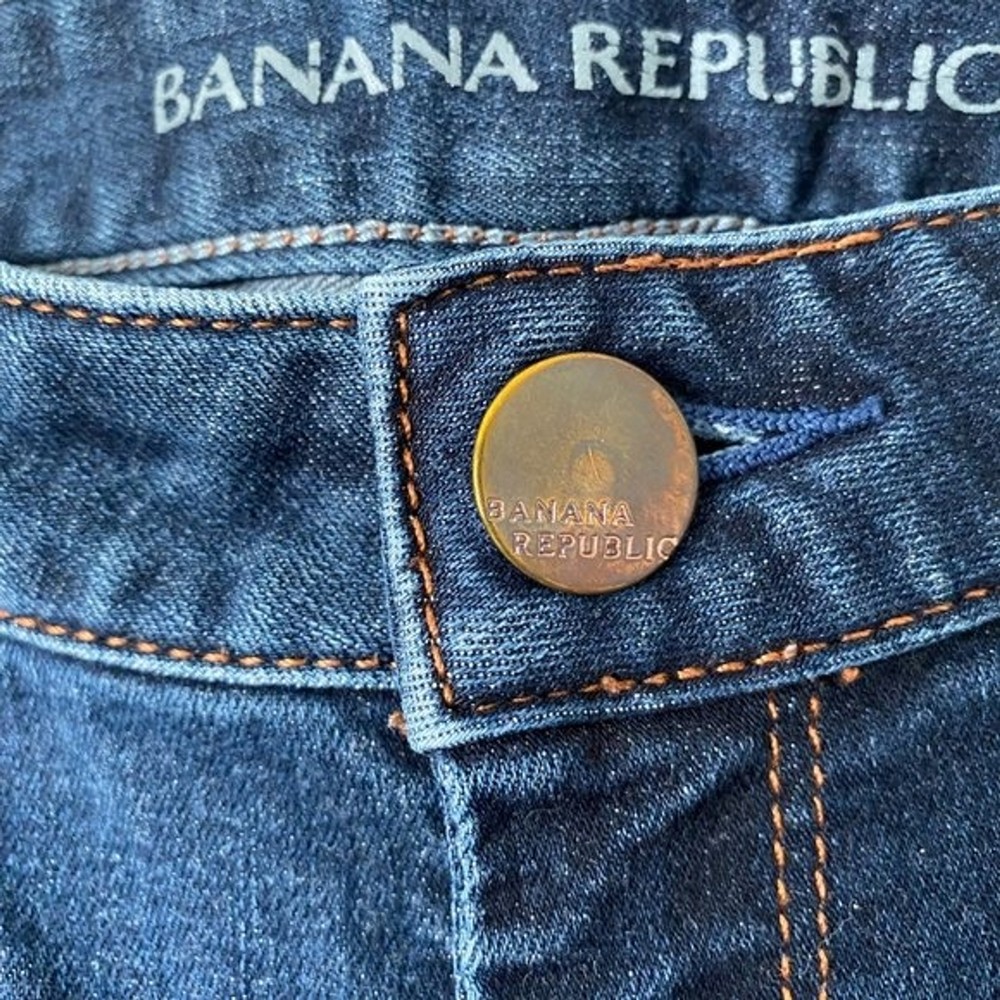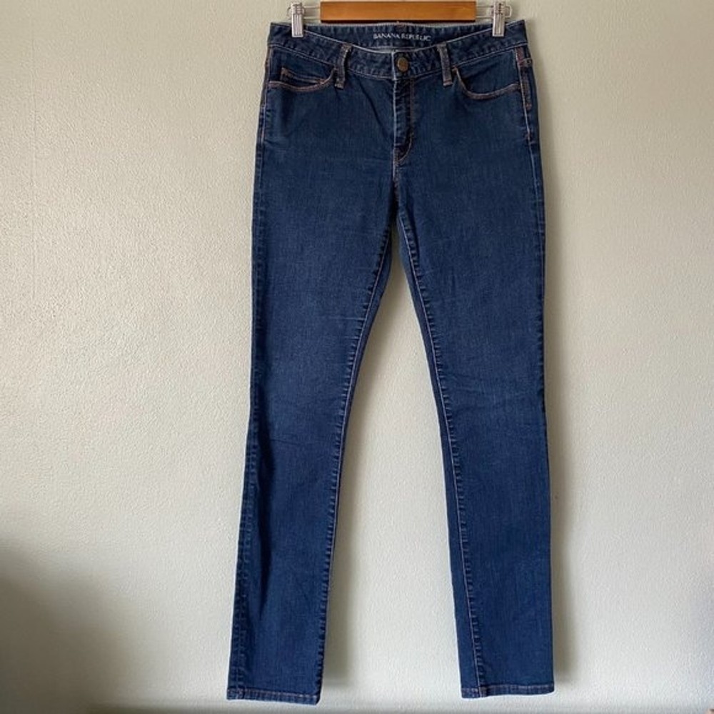 Banana Republic skinny jeans. Women's size 28. Sits lower on waist, fitted through hip and thigh. Skinny leg. Dark wash, super soft and stretchy denim material. 89% Cotton 8% Polyester 3% Spandex. Functional pockets on front and back. These Banana Republic dark blue skinny jeans with a vibrant orange stitching offer a most desirable silhouette perfect for any occasion. Beautiful quality and a superb cotton blend offers a great fit with enough stretch to complement any lifestyle. EUC, no visible flaws Tags: minimalist, industrial, normcore, practical, basic, solid, minimal, simple, modern, classy, classic, timeless, neutral, contemporary, everyday Please see all pictures for style, color, condition, & measurements & remember that colors can vary from screen to screen (which means the actual item may be lighter or darker than it appears on your device). Questions welcome before purchase. 5 Star Seller Fast Shipping Offers Welcome Bundle & SaveCLOTHING & FABRIC ITEMS: All pre-owned clothing and fabric items have been steam cleaned and/or washed per eBay standards.