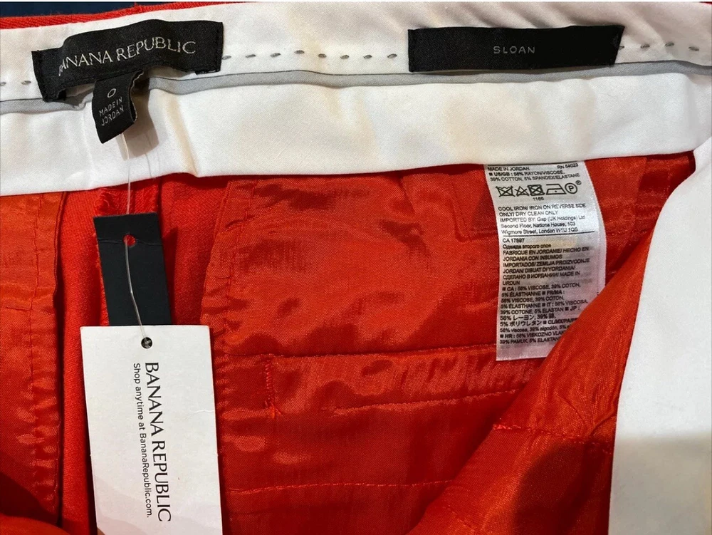 Elevate your wardrobe with these stylish Banana Republic Modern Sloan pants. The orange washable pants are made of a comfortable blend of spandex, rayon, and cotton, making them perfect for any season. The pants feature a flat front and a straight leg style with a mid-rise, and they come with belt loops for easy accessorizing. These versatile pants are perfect for any occasion, whether it's a casual day out, a business meeting, or a party. The pants also have slash pockets for added convenience, and the belt is sold separately. Don't miss out on the chance to add these must-have pants to your collection.