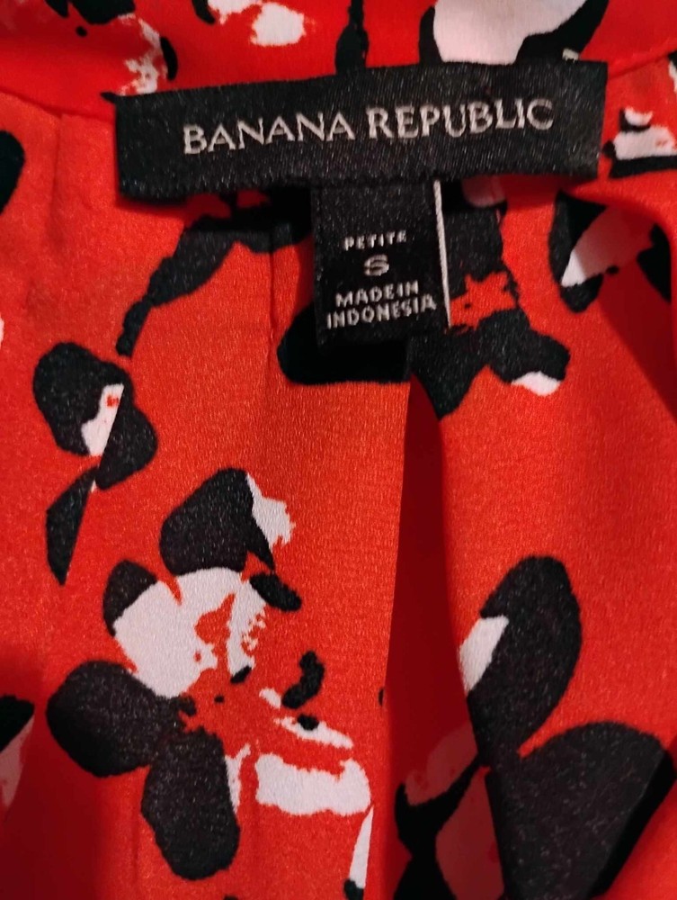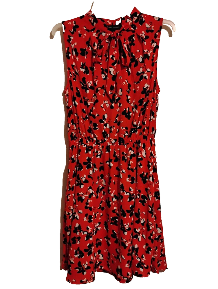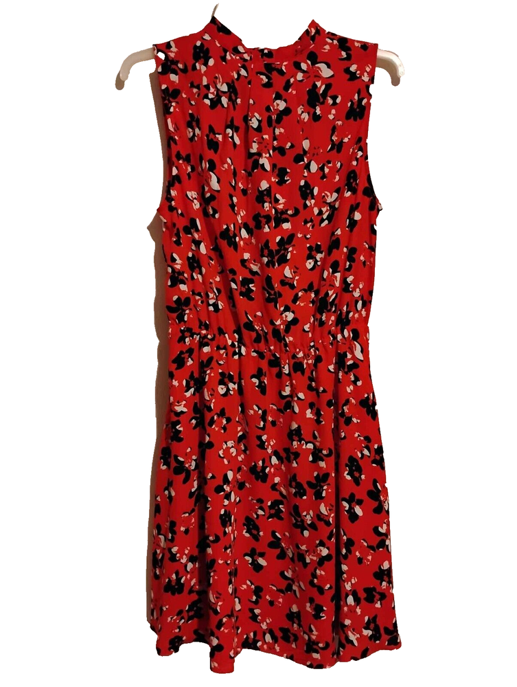 This is a Banana Republic dress for women in size SP. It features a floral print on chiffon fabric with a sleeveless knee-length fit & flare style. The dress has an elastic waist and a V-neckline. Ideal for various occasions like travel, parties, casual wear, or work attire. The color is orange, giving it a vibrant and stylish look. Made of polyester material, this dress exudes a feminine and fashionable vibe.