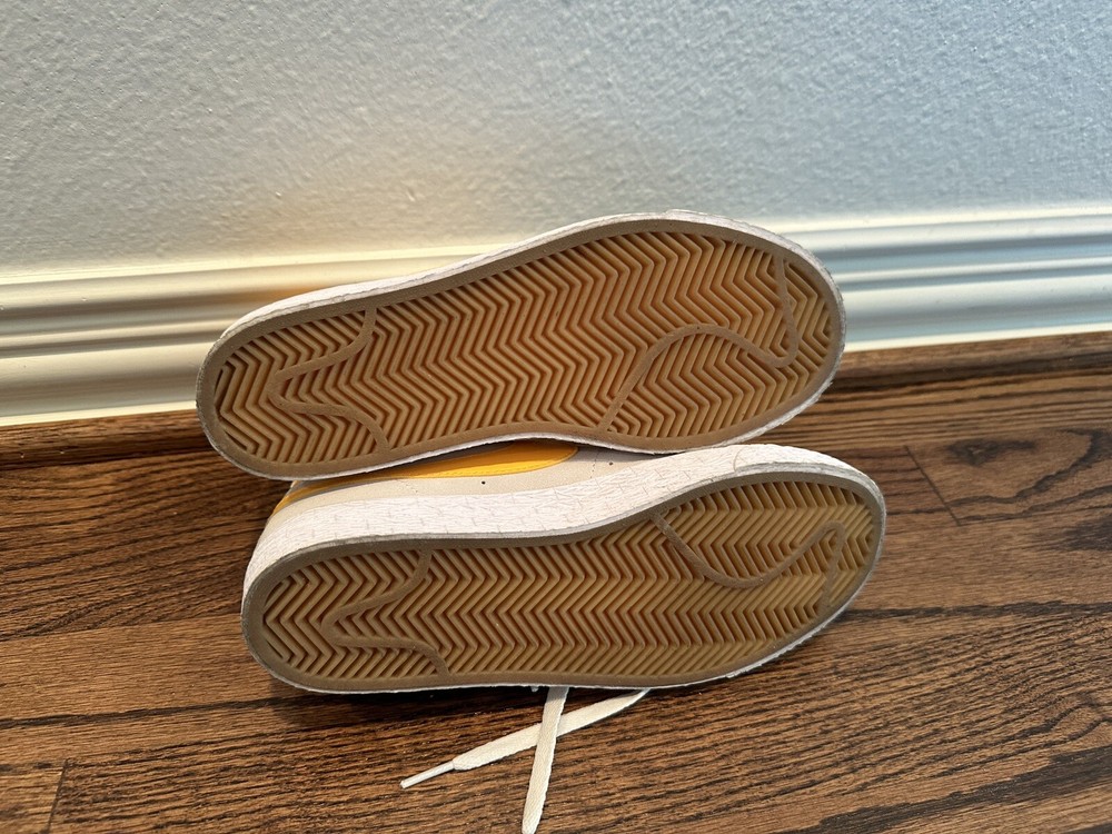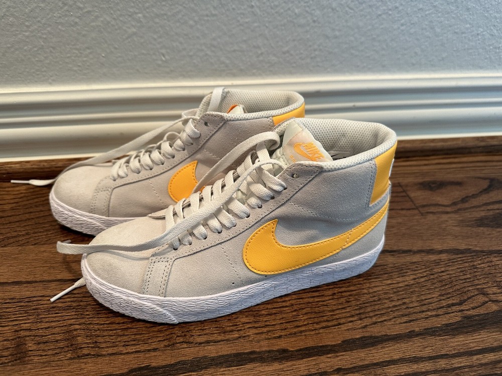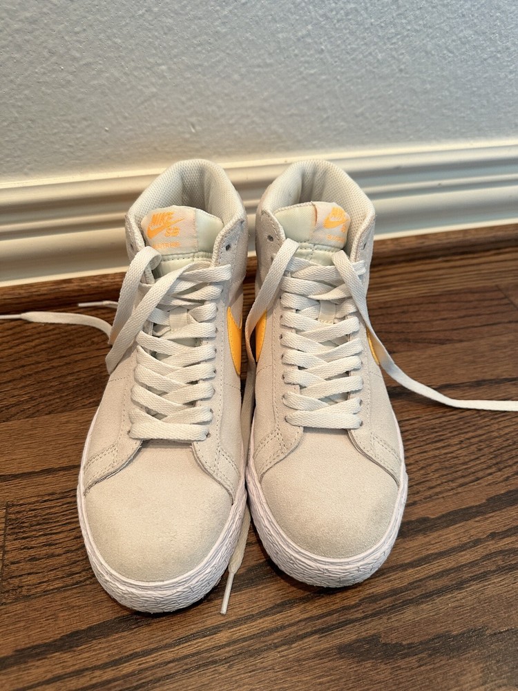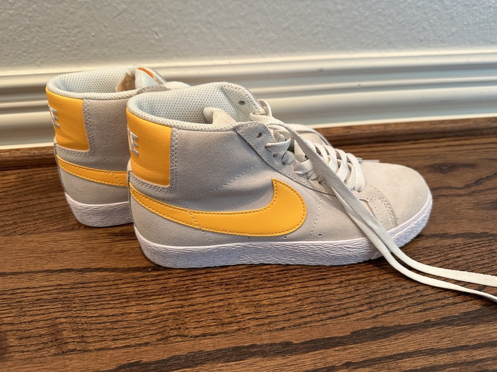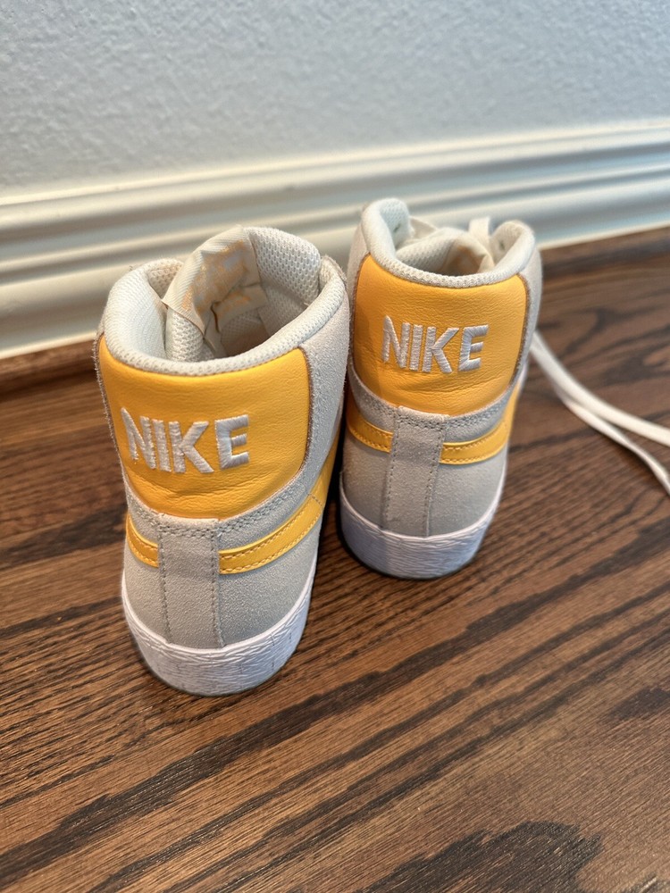 Almost new Nike Blazer Hi Tops in white. These shoes are perfect for any season and are great for walking, school, the beach, and skateboarding. The suede upper material gives them a classic look, while the rubber outsole material provides excellent grip. These Nike Blazers come in size 4.5 and are part of the Nike Blazer product line. They are ideal for athletic activities and will keep your child comfortable and fashionable all day long. Worn only a time or 2. My daughter outgrew them before she had a chance to wear them. Cleaning out both of our closets. Please take a look at my other items.