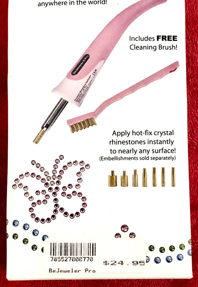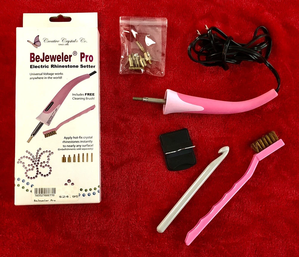 This is a BeJeweler Pro Electric Rhinestone Setter Creative Crystals Co. Universal Voltage OPEN BOX. NOTE: DIRECTIONS NOT INCLUDED Box includes: - Bejeweled Pro - Secure Support stand - 8 Removable Tips - Cleaning Brush