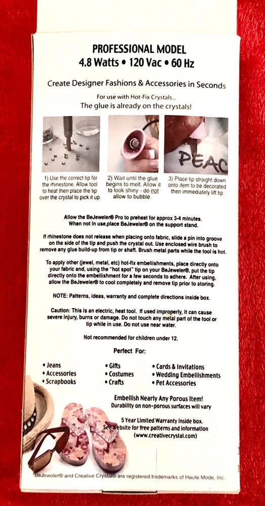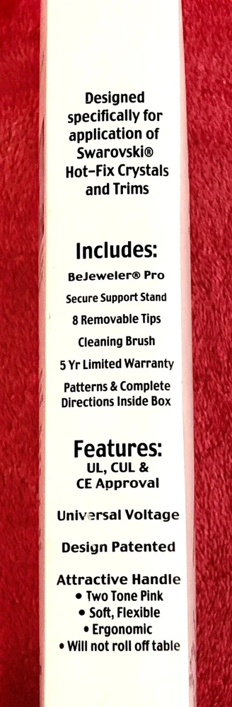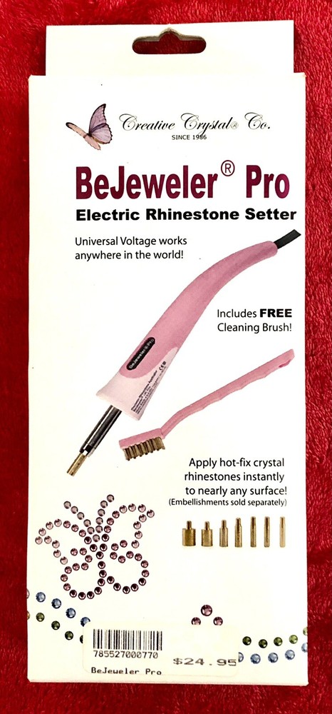 This is a BeJeweler Pro Electric Rhinestone Setter Creative Crystals Co. Universal Voltage OPEN BOX. NOTE: DIRECTIONS NOT INCLUDED Box includes: - Bejeweled Pro - Secure Support stand - 8 Removable Ti...