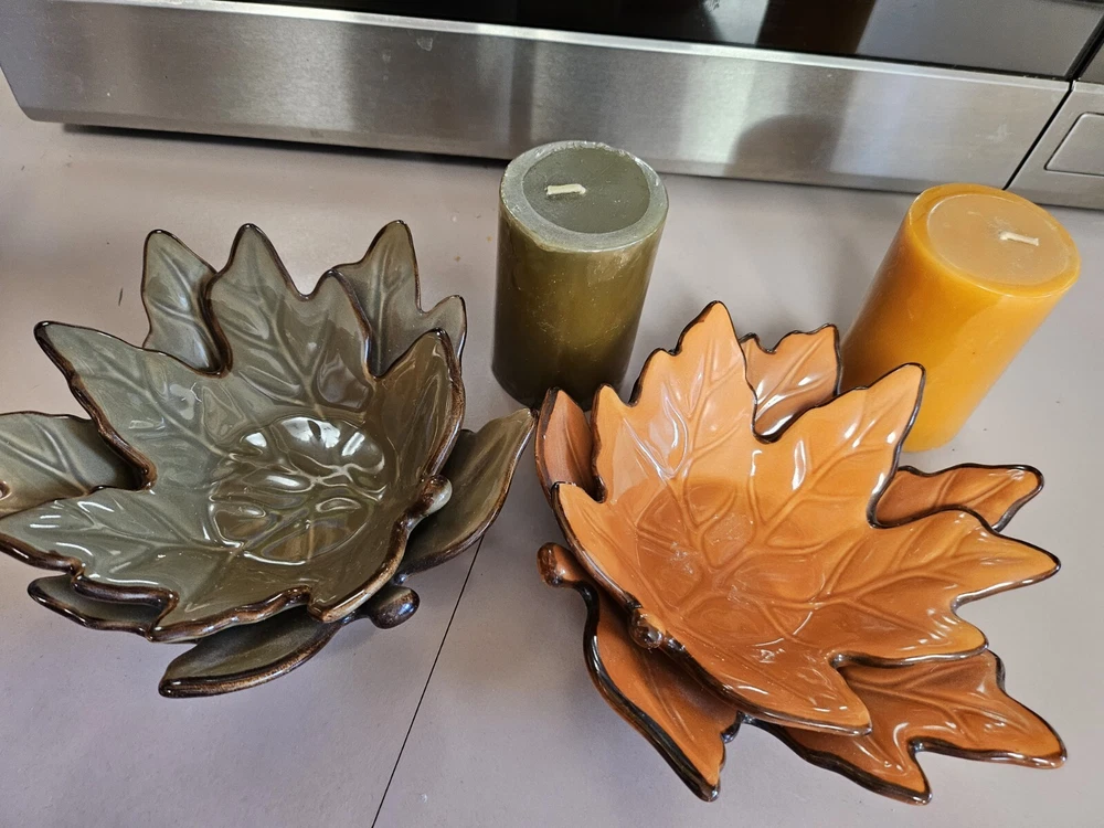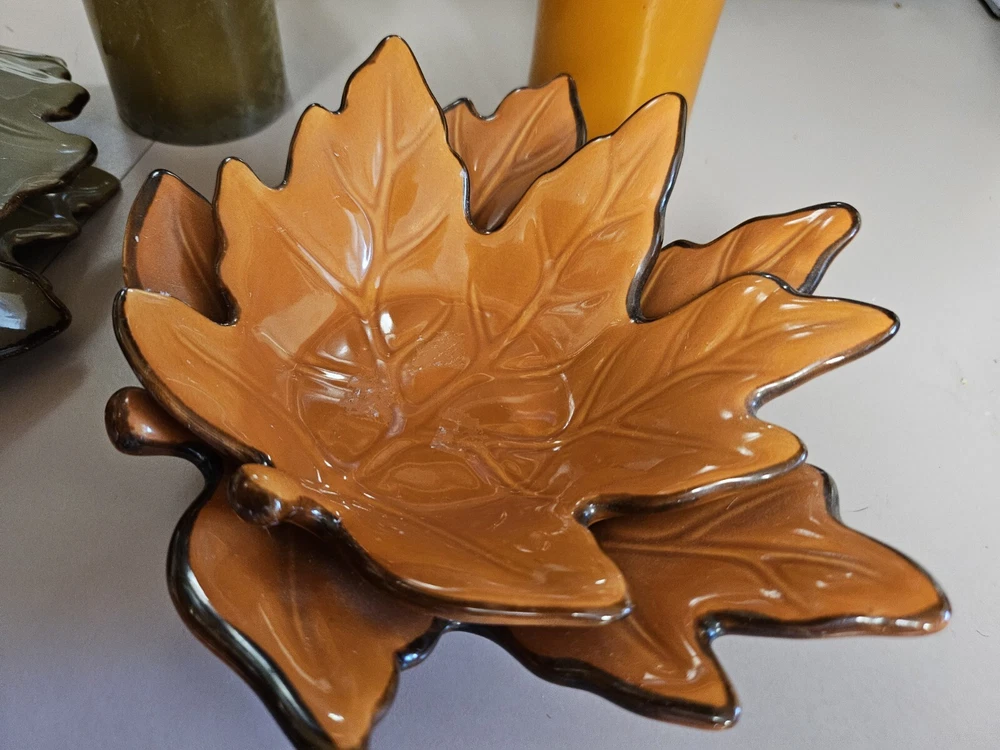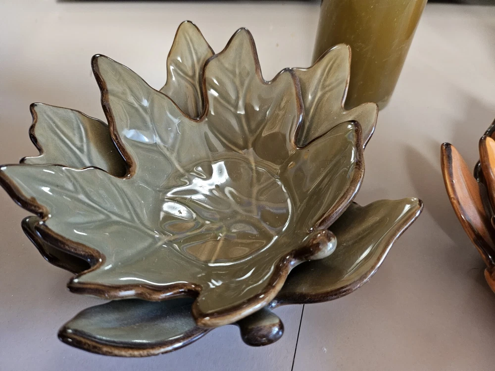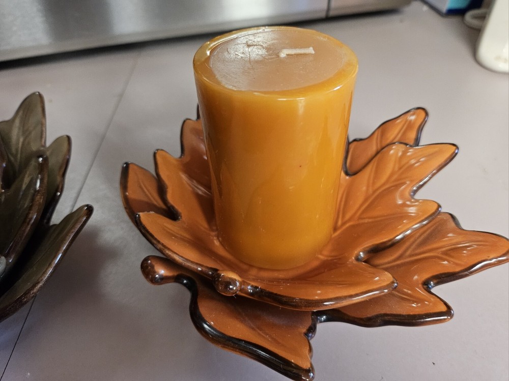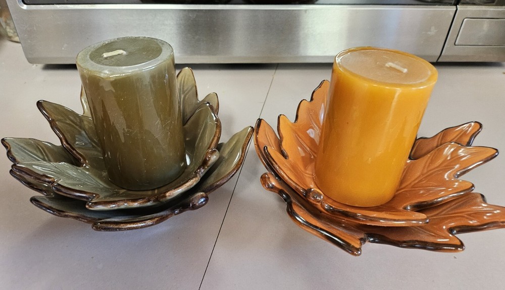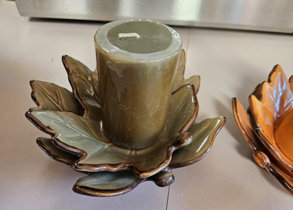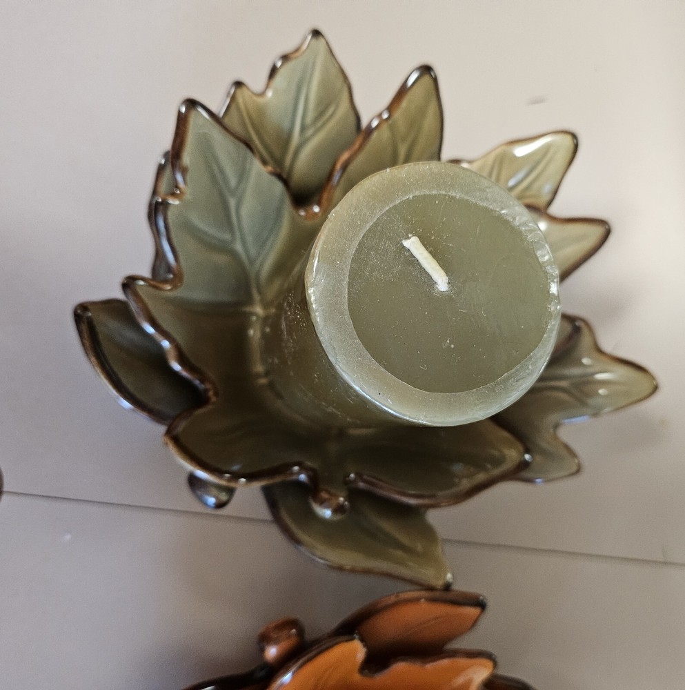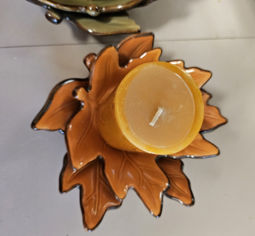 Add a touch of seasonal charm to your home decor with these Beautiful Fall Ceramic Leaf 3D Candle Holders. The holders come in a set of two and feature a stylish design of leaves in green and orange colors. The ceramic material and glossy finish make them perfect for easy care and long-lasting use. Measuring at 2.5 inches in length, 3 inches in height, and 3.5 inches in width, these candle holders are of medium size and can easily accommodate any standard size candle. The leaf-shaped design and high-gloss finish make them an ideal addition to your fall decor. Perfect for adults, these candle holders are easy to use and maintain. Ships fast.