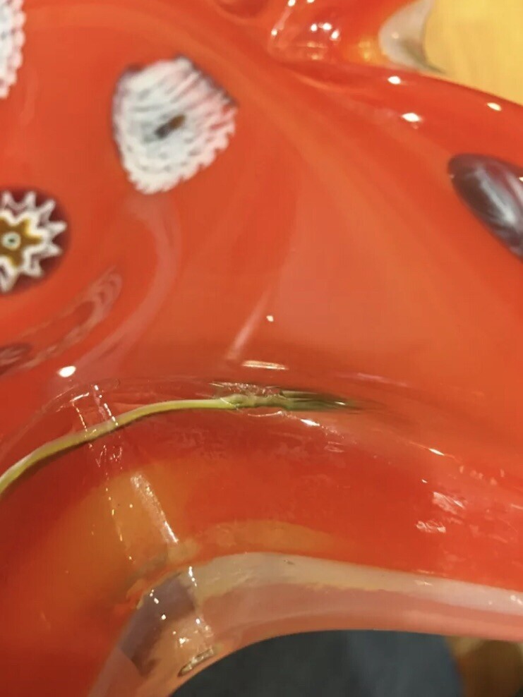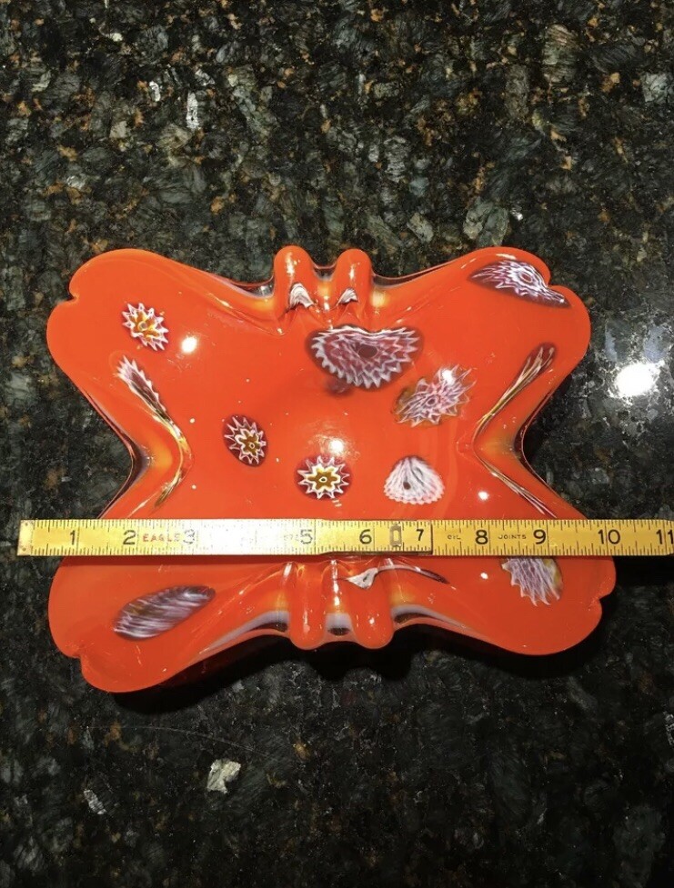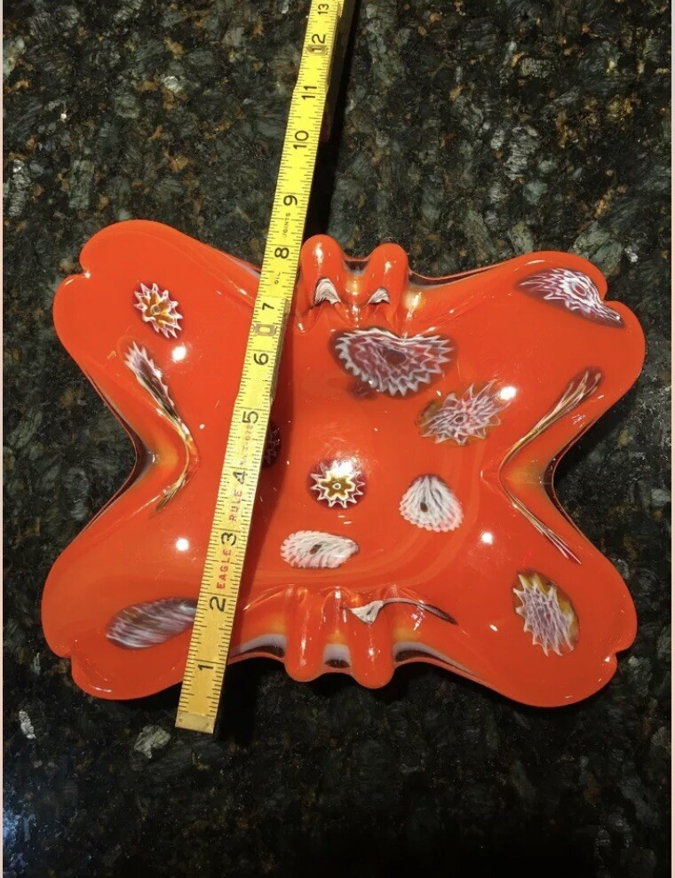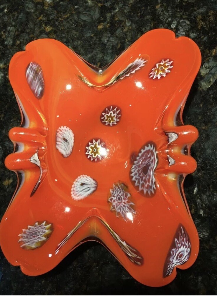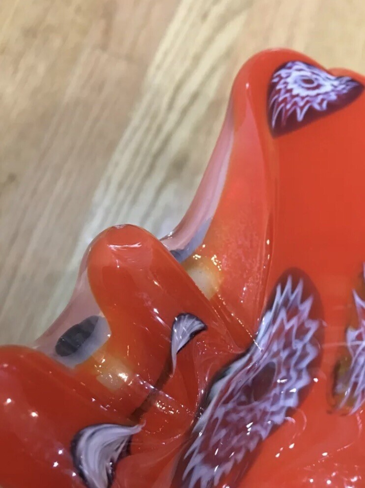 Beautiful Murano Art Glass Orange & White Bowl Millefiori Mid-Century Modern. 2 very small chips view photos close up