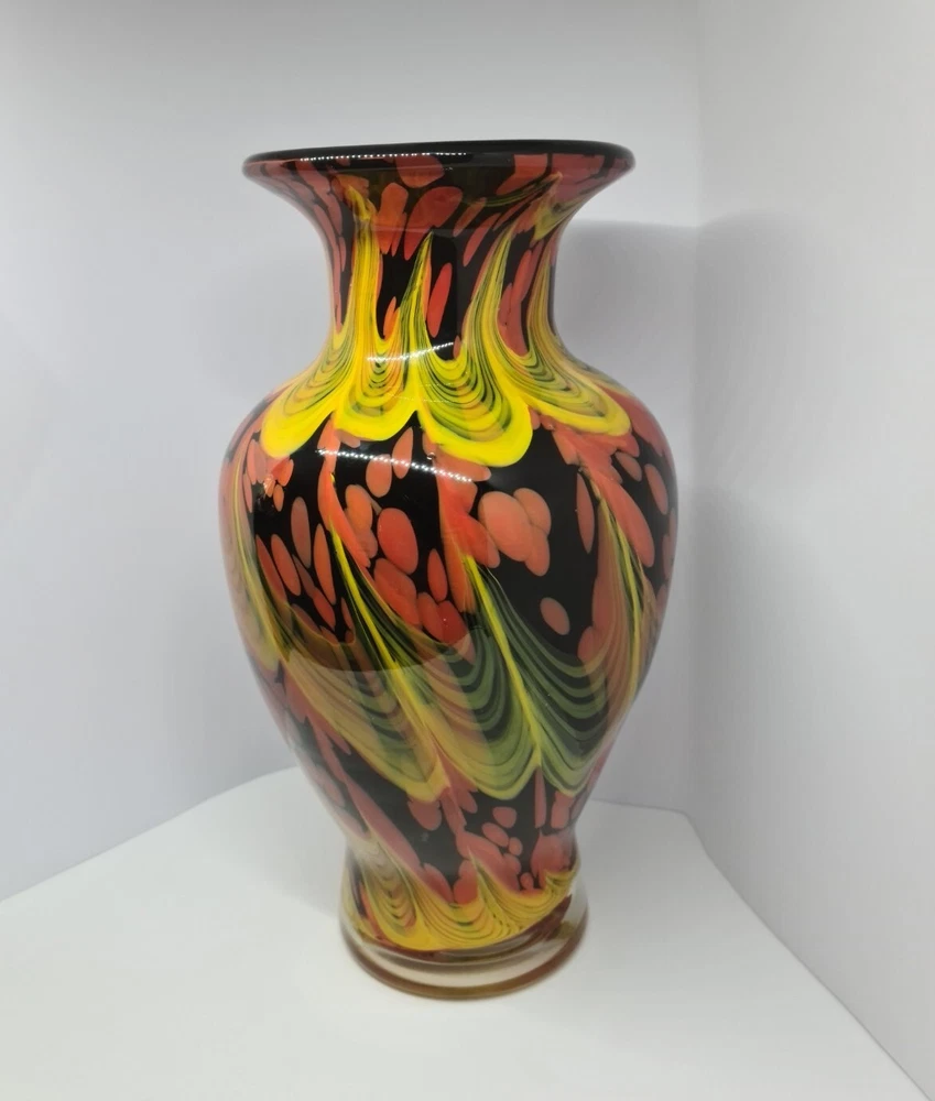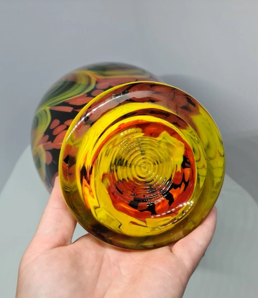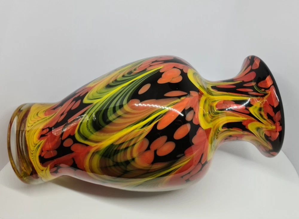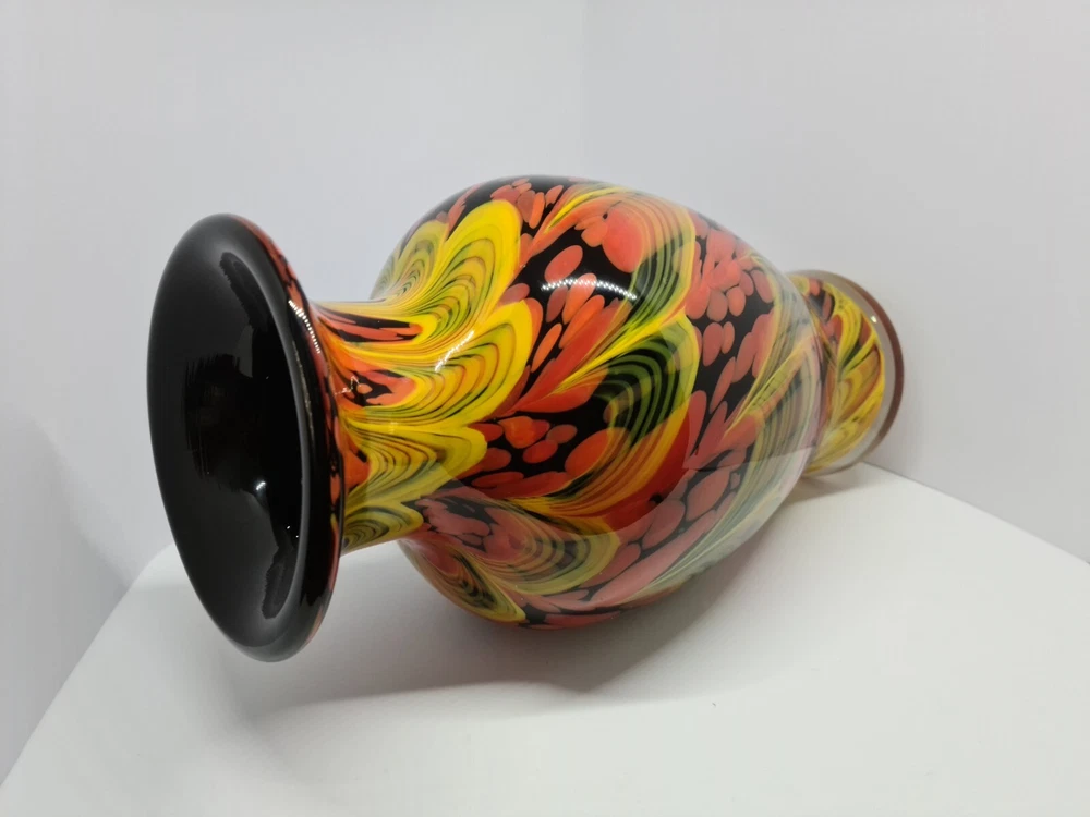Rare stunning art glass vase by Dolphin Glass Japan. In great condition, no chips or cracks. Few tiny scratches on body and base. Dolphin Glass is identified by the impressed spiral mark on base. Black base with yellow waves and orange/red bubbles. 29cm tall, 16cm in diameter at the widest part. Weight: 1.8kg Please feel free to message me if more photos or measurements needed.