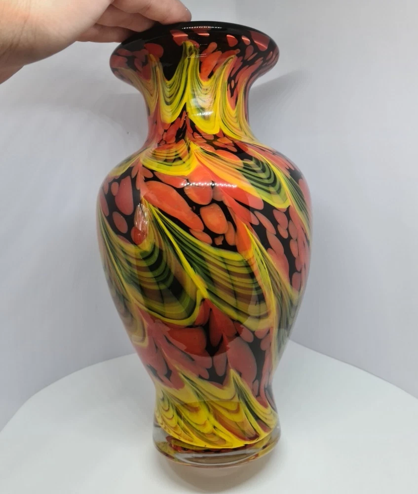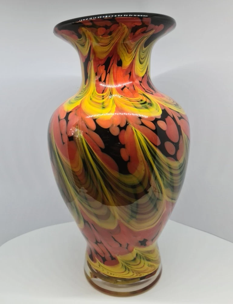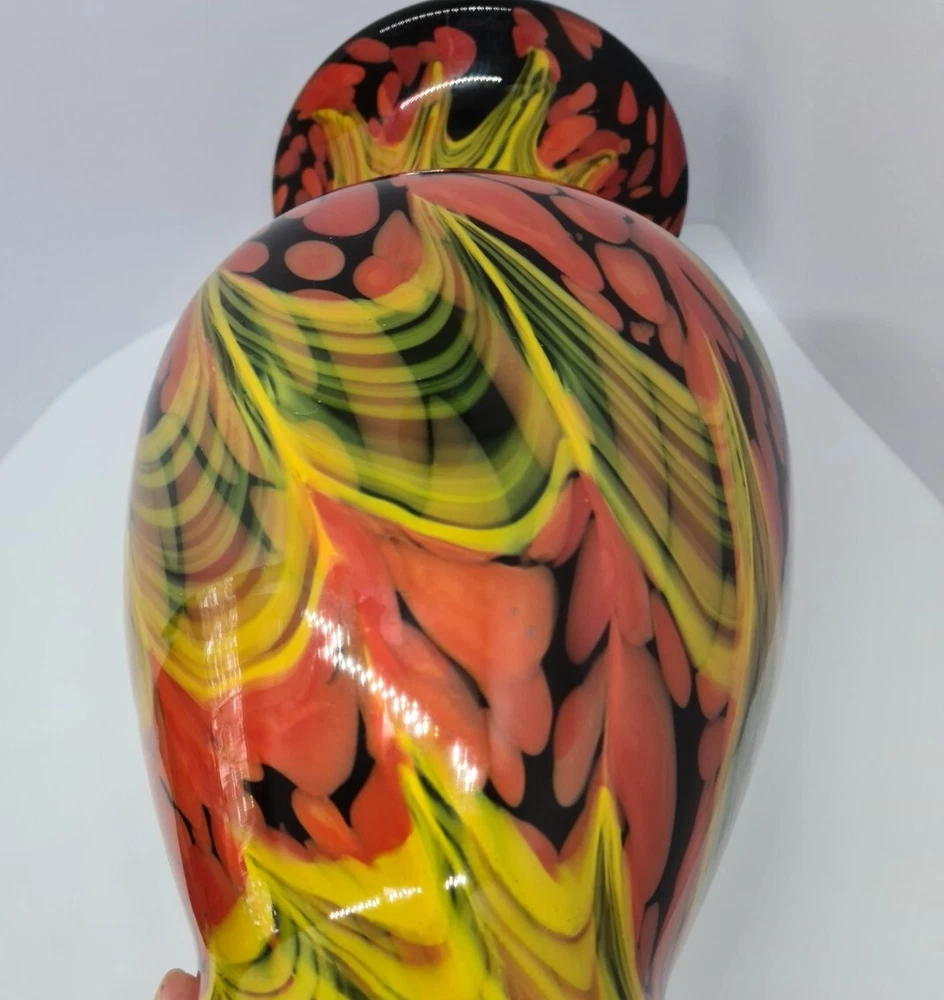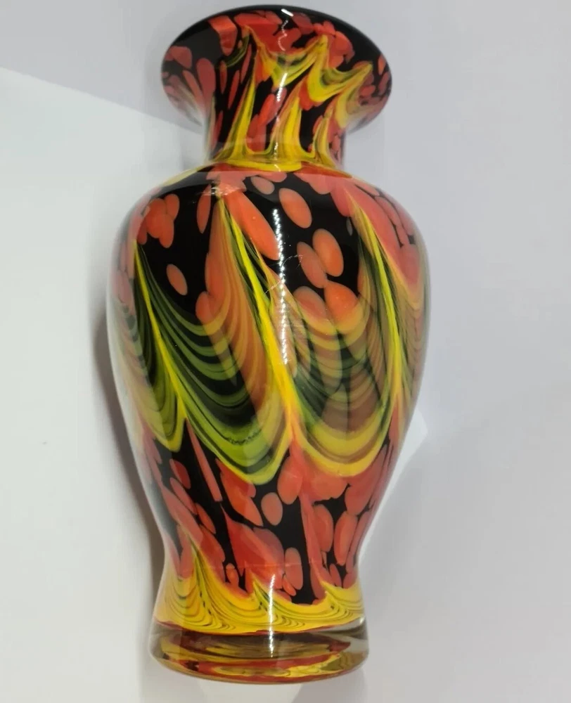 Rare stunning art glass vase by Dolphin Glass Japan. In great condition, no chips or cracks. Few tiny scratches on body and base. Dolphin Glass is identified by the impressed spiral mark on base. Black base with yellow waves and orange/red bubbles. 29cm tall, 16cm in diameter at the widest part. Weight: 1.8kg Please feel free to message me if more photos or measurements needed.