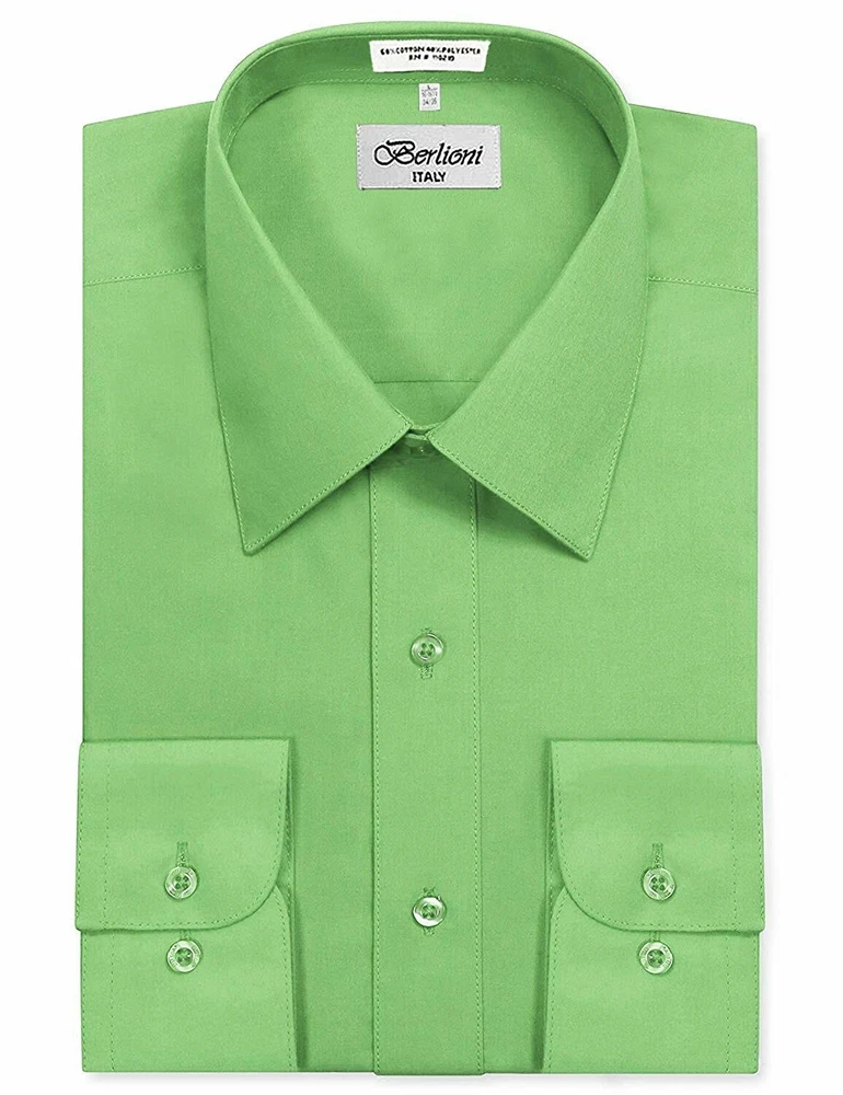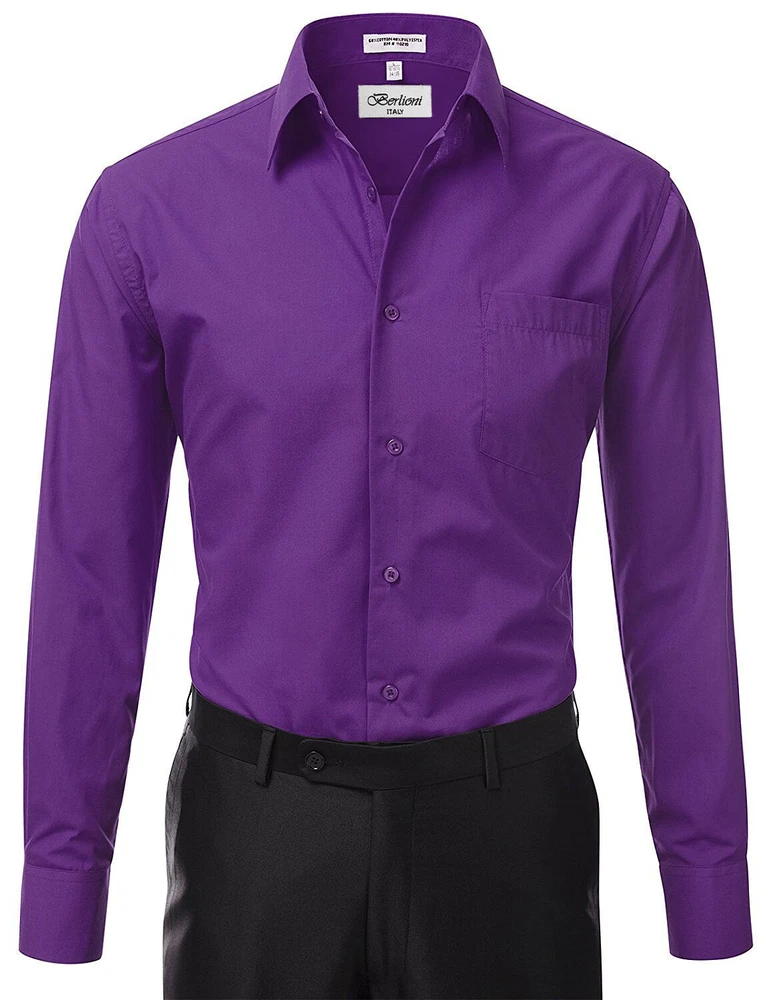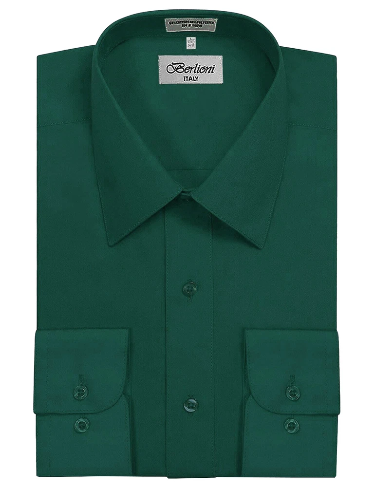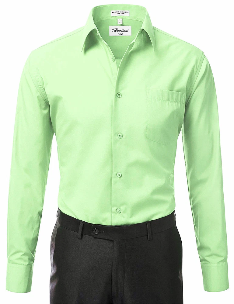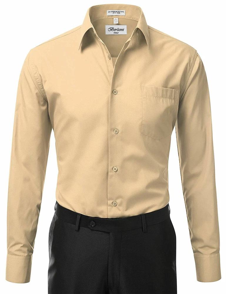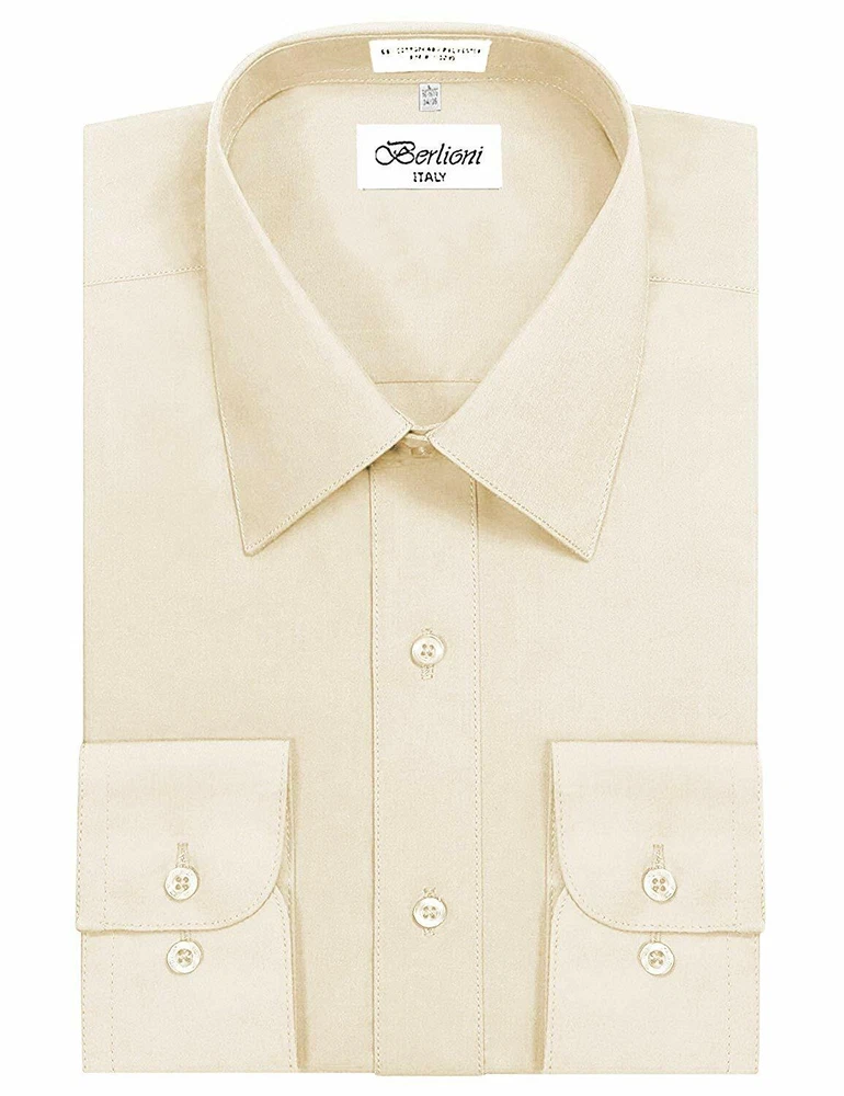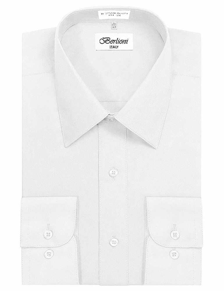 BERLIONI ITALY MEN'S PREMIUM DRESS SHIRT FABRIC: 65% POLYESTER 35% COTTON POINT COLLAR WRINKLE RESISTANT COTTON BLEND 7 BUTTON CLOSURE REINFORCED COLLAR STAYS 1 EXTRA PLACKET BUTTON 1 EXTRA CUFF BUTTON CLASSIC DESIGN WITH GREAT FEEL LIGHT AND COMFORTABLE BRAND NEW WITH TAGS THIS IS AN AUTHENTIC ITEM MORE COLORS AVAILABLE: Lavender, New Mint, Black, Light Grey, Apple Green, Lemon, Silver, Aqua, Peach, Navy, French Blue, Rose, Mustard, Blue, Royal Blue, Gold, Purple, Sage SIMPLE ELEGANCE. Made from a soft and comfortable poly/cotton blend fabric. (65% polyester / 35% cotton) This classically stylish men's collared dress shirt comes in a modern fit which is slightly more of a tailored fit than a regular fit. It also features a front pocket, French convertible cuffs, and coordinates perfectly with virtually any jacket, trousers, suit, tie, and cufflinks, offering endless wardrobe possibilities. CONVERTIBLE FRENCH CUFFS. Convertible cuffs offer fantastic versatility, and provide the option to wear the cuffs in two different ways; either with the cuff buttons, or in the French cuff style, with cufflinks. Since cufflinks have become increasingly more popular over that past few years, more guys than ever before are now seeking this multi-purpose, convertible cuff style. VAST SELECTION. Available in a myriad of appealing colors, ranging from light to dark, and subdued to bright, these convertible French cuff dress shirts offer a multitude of wonderful wardrobe options. WELL PRICED, TIMELESS STYLE. Traditional in its design, this inexpensive, but very durable men's dress shirt will undoubtedly become a fixture in your wardrobe. And with a wide array of charming hues available at such a wallet-friendly price, why not buy a few? EASY MAINTENANCE. These collared, convertible cuff men's dress shirts are machine washable, and may be washed separately or with similar colors. Tumble dry and warm iron.