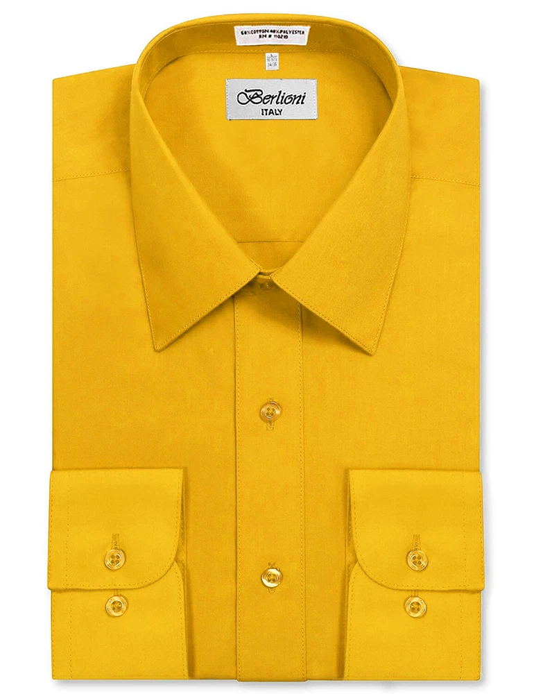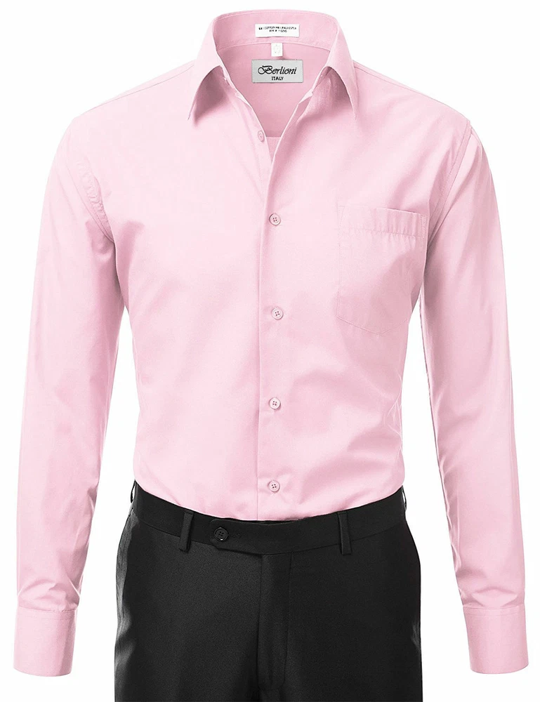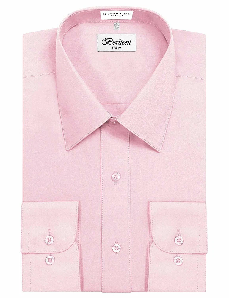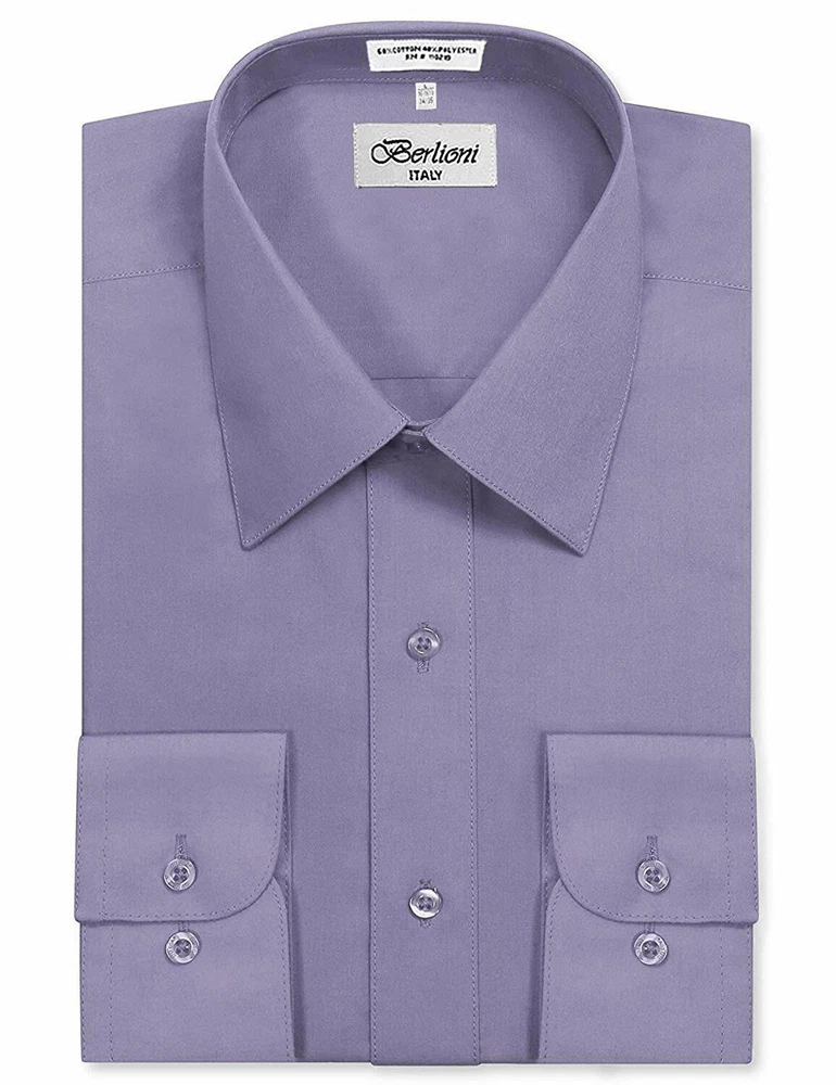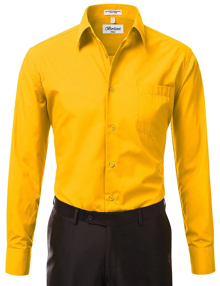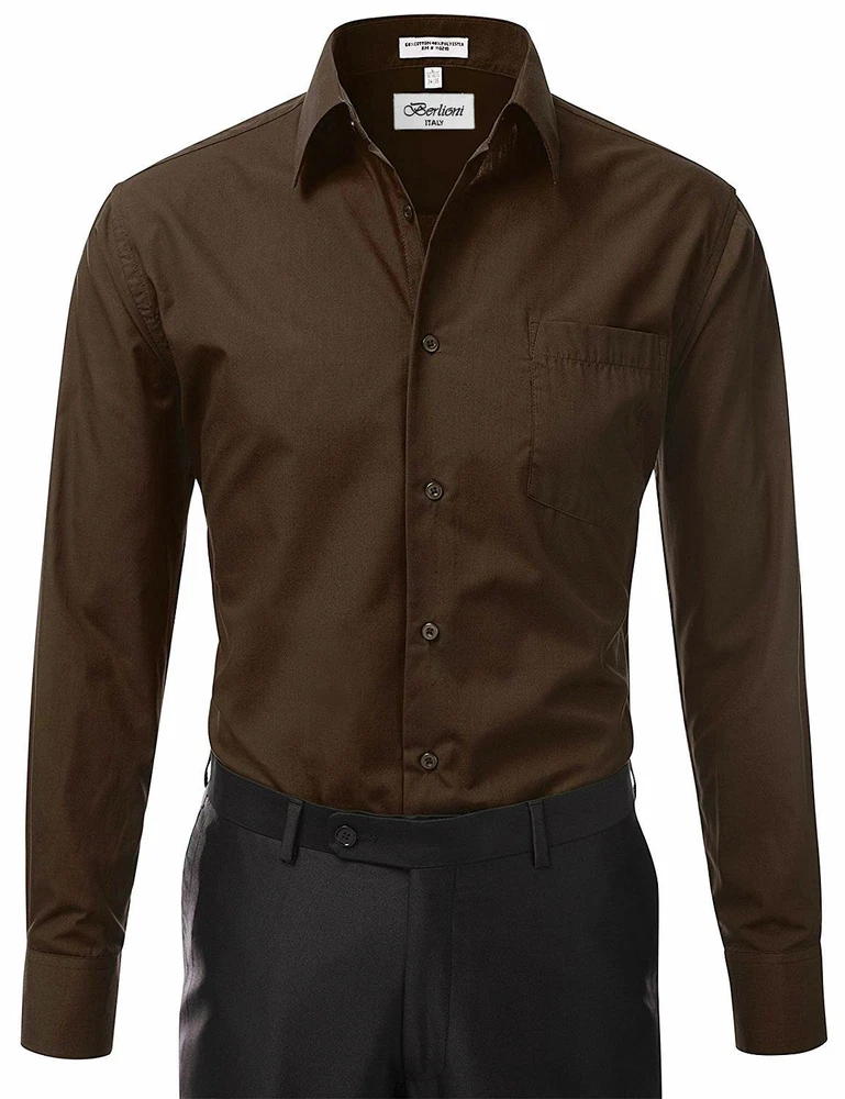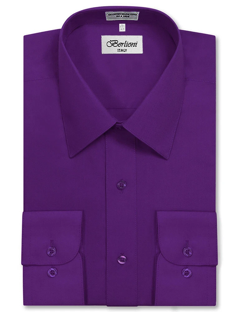 BERLIONI ITALY MEN'S PREMIUM DRESS SHIRT FABRIC: 65% POLYESTER 35% COTTON POINT COLLAR WRINKLE RESISTANT COTTON BLEND 7 BUTTON CLOSURE REINFORCED COLLAR STAYS 1 EXTRA PLACKET BUTTON 1 EXTRA CUFF BUTTON CLASSIC DESIGN WITH GREAT FEEL LIGHT AND COMFORTABLE BRAND NEW WITH TAGS THIS IS AN AUTHENTIC ITEM MORE COLORS AVAILABLE: Lavender, New Mint, Black, Light Grey, Apple Green, Lemon, Silver, Aqua, Peach, Navy, French Blue, Rose, Mustard, Blue, Royal Blue, Gold, Purple, Sage SIMPLE ELEGANCE. Made from a soft and comfortable poly/cotton blend fabric. (65% polyester / 35% cotton) This classically stylish men's collared dress shirt comes in a modern fit which is slightly more of a tailored fit than a regular fit. It also features a front pocket, French convertible cuffs, and coordinates perfectly with virtually any jacket, trousers, suit, tie, and cufflinks, offering endless wardrobe possibilities. CONVERTIBLE FRENCH CUFFS. Convertible cuffs offer fantastic versatility, and provide the option to wear the cuffs in two different ways; either with the cuff buttons, or in the French cuff style, with cufflinks. Since cufflinks have become increasingly more popular over that past few years, more guys than ever before are now seeking this multi-purpose, convertible cuff style. VAST SELECTION. Available in a myriad of appealing colors, ranging from light to dark, and subdued to bright, these convertible French cuff dress shirts offer a multitude of wonderful wardrobe options. WELL PRICED, TIMELESS STYLE. Traditional in its design, this inexpensive, but very durable men's dress shirt will undoubtedly become a fixture in your wardrobe. And with a wide array of charming hues available at such a wallet-friendly price, why not buy a few? EASY MAINTENANCE. These collared, convertible cuff men's dress shirts are machine washable, and may be washed separately or with similar colors. Tumble dry and warm iron.