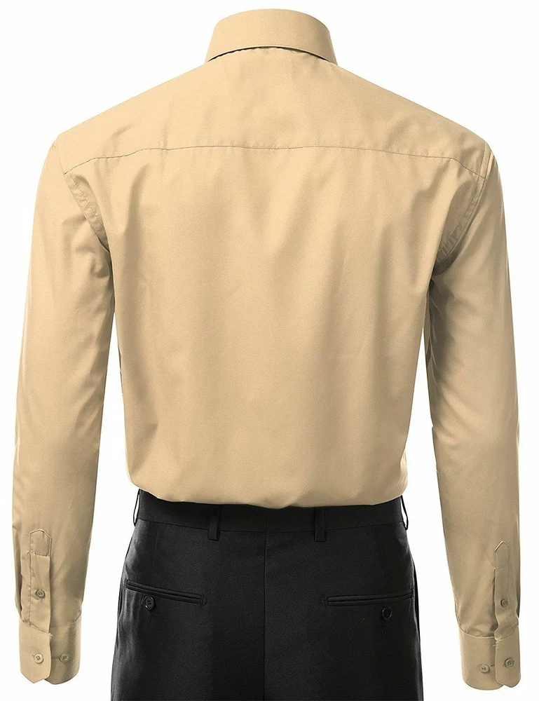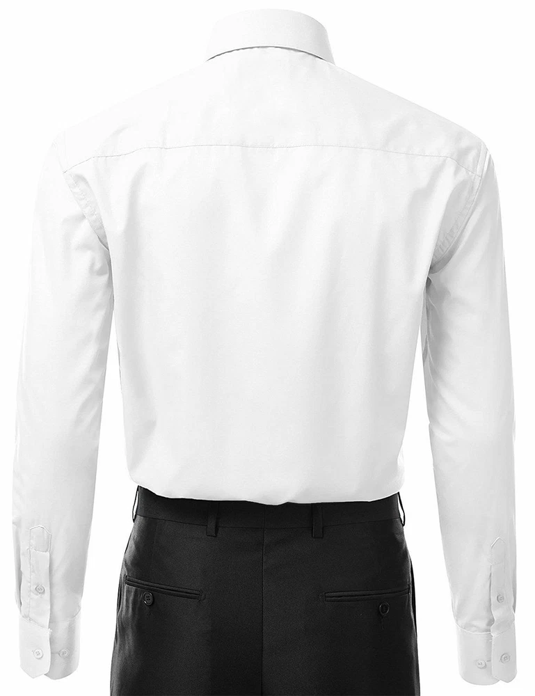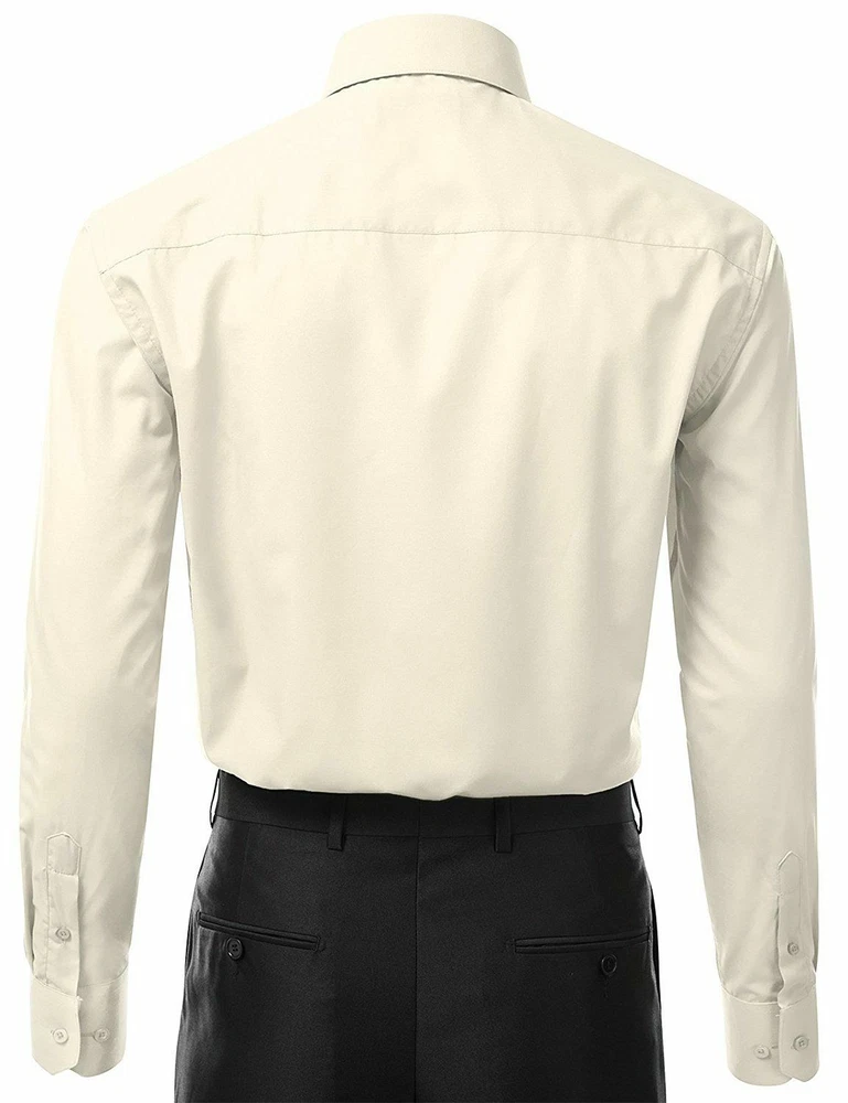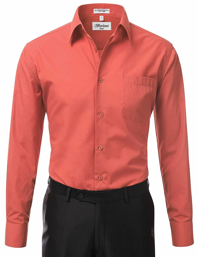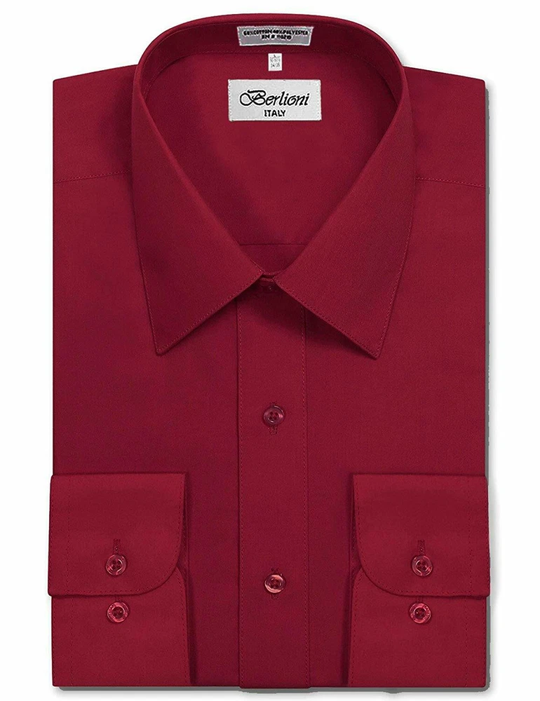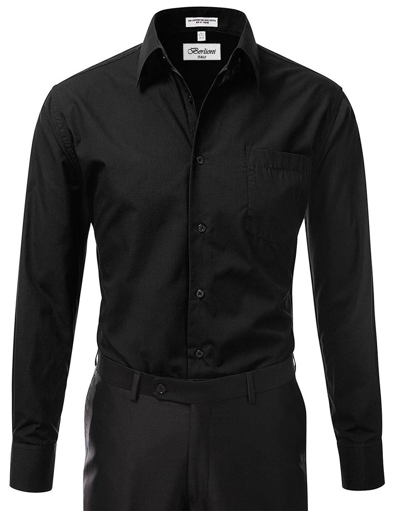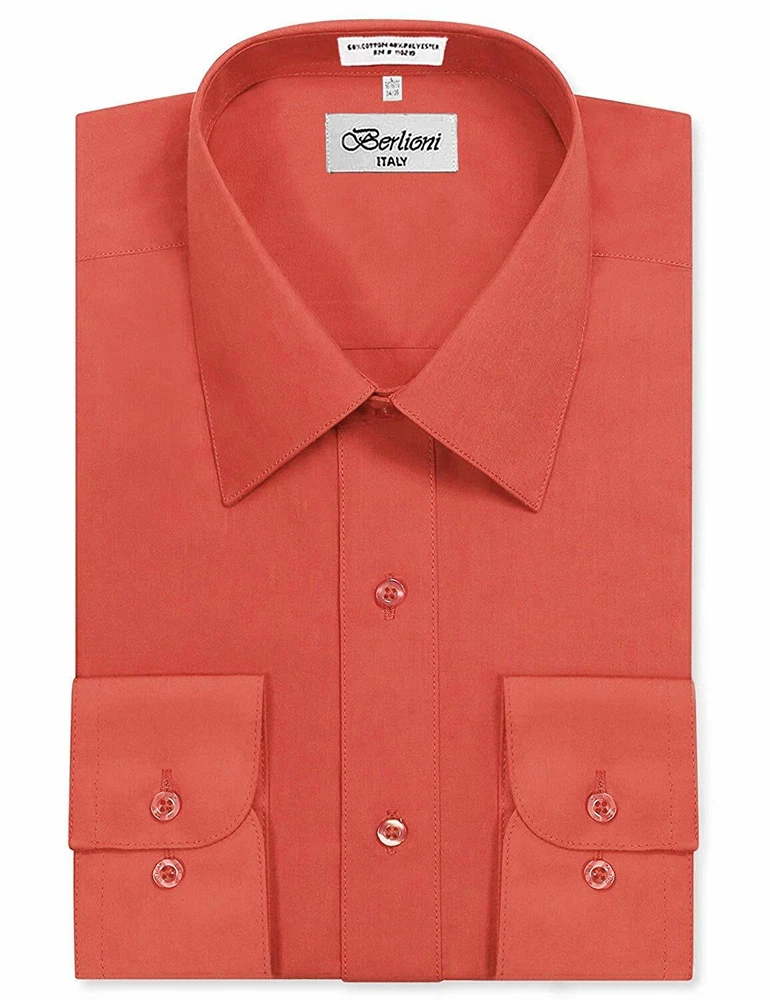 BERLIONI ITALY MEN'S PREMIUM DRESS SHIRT FABRIC: 65% POLYESTER 35% COTTON POINT COLLAR WRINKLE RESISTANT COTTON BLEND 7 BUTTON CLOSURE REINFORCED COLLAR STAYS 1 EXTRA PLACKET BUTTON 1 EXTRA CUFF BUTTON CLASSIC DESIGN WITH GREAT FEEL LIGHT AND COMFORTABLE BRAND NEW WITH TAGS THIS IS AN AUTHENTIC ITEM MORE COLORS AVAILABLE: Lavender, New Mint, Black, Light Grey, Apple Green, Lemon, Silver, Aqua, Peach, Navy, French Blue, Rose, Mustard, Blue, Royal Blue, Gold, Purple, Sage SIMPLE ELEGANCE. Made from a soft and comfortable poly/cotton blend fabric. (65% polyester / 35% cotton) This classically stylish men's collared dress shirt comes in a modern fit which is slightly more of a tailored fit than a regular fit. It also features a front pocket, French convertible cuffs, and coordinates perfectly with virtually any jacket, trousers, suit, tie, and cufflinks, offering endless wardrobe possibilities. CONVERTIBLE FRENCH CUFFS. Convertible cuffs offer fantastic versatility, and provide the option to wear the cuffs in two different ways; either with the cuff buttons, or in the French cuff style, with cufflinks. Since cufflinks have become increasingly more popular over that past few years, more guys than ever before are now seeking this multi-purpose, convertible cuff style. VAST SELECTION. Available in a myriad of appealing colors, ranging from light to dark, and subdued to bright, these convertible French cuff dress shirts offer a multitude of wonderful wardrobe options. WELL PRICED, TIMELESS STYLE. Traditional in its design, this inexpensive, but very durable men's dress shirt will undoubtedly become a fixture in your wardrobe. And with a wide array of charming hues available at such a wallet-friendly price, why not buy a few? EASY MAINTENANCE. These collared, convertible cuff men's dress shirts are machine washable, and may be washed separately or with similar colors. Tumble dry and warm iron.