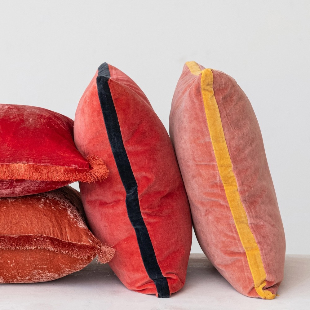This 20-inch Square Pillow is a blend of classic charm and modern sophistication, with its striking Berry and Navy color palette. The contrasting gusset adds a unique, dimensional flair that's reminiscent of the art deco era, while the cotton velvet material provides a soft, tactile experience. Perfect for an array of interior styles, from the boldness of glam to the subtlety of transitional design, it's a versatile piece that offers both visual impact and comfort. The polyester filling ensures the pillow retains its shape and offers a firm yet cozy support, making it a stylish and functional addition to any space. Whether it's the centerpiece of a sofa or an accent on a bed, this pillow is sure to make a statement. A touch of elegance, this pillow boasts a Berry and Navy contrasting gusset, capturing the essence of art deco style A glamorous addition to any setting, it's perfect for elevating a vintage or transitional decor with its bold, contrasting colors Polyester fill insert included A pure cotton velvet construction, offering a soft, premium texture that invites touch 20” L x 20” W
