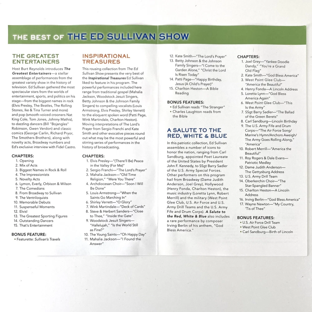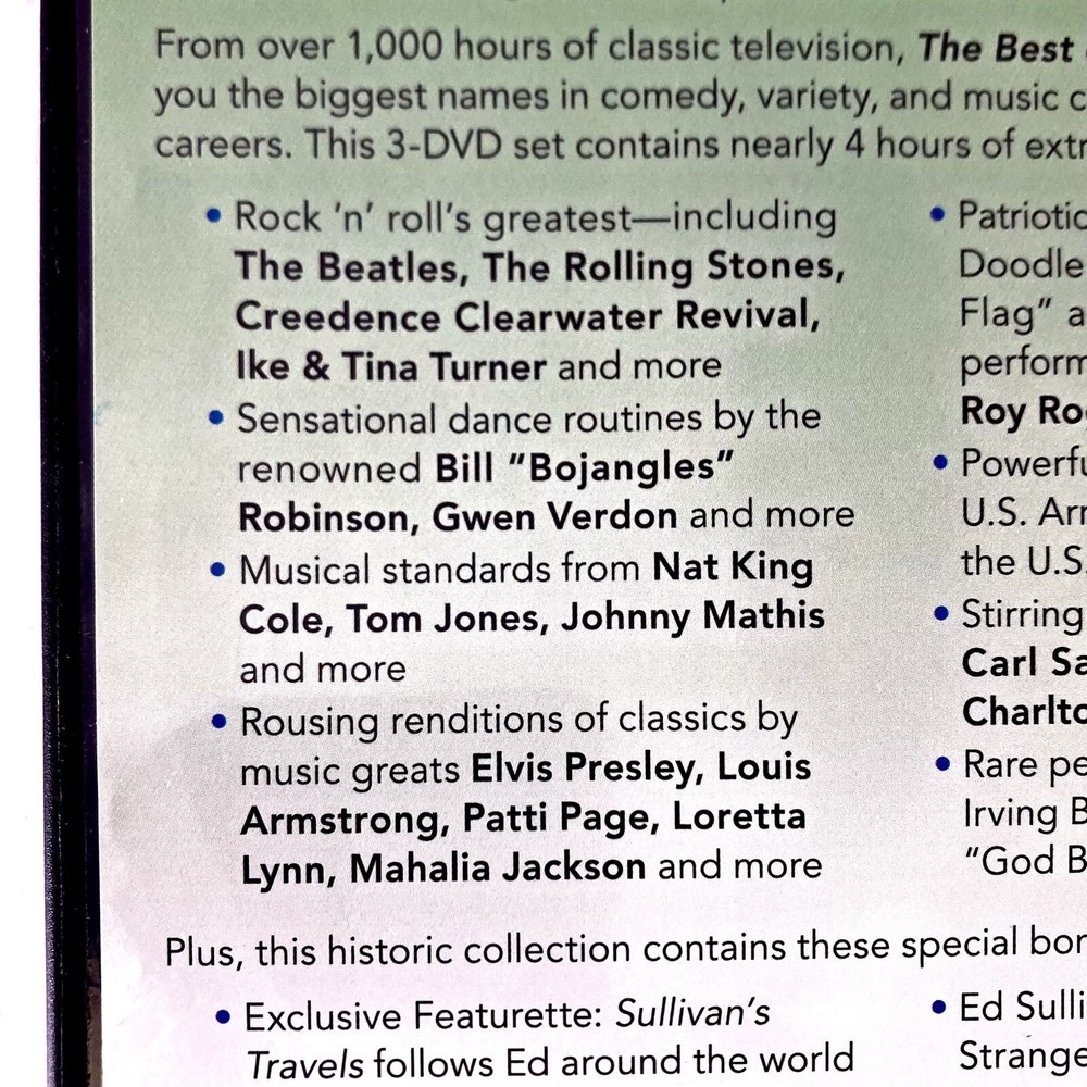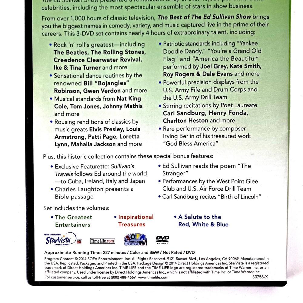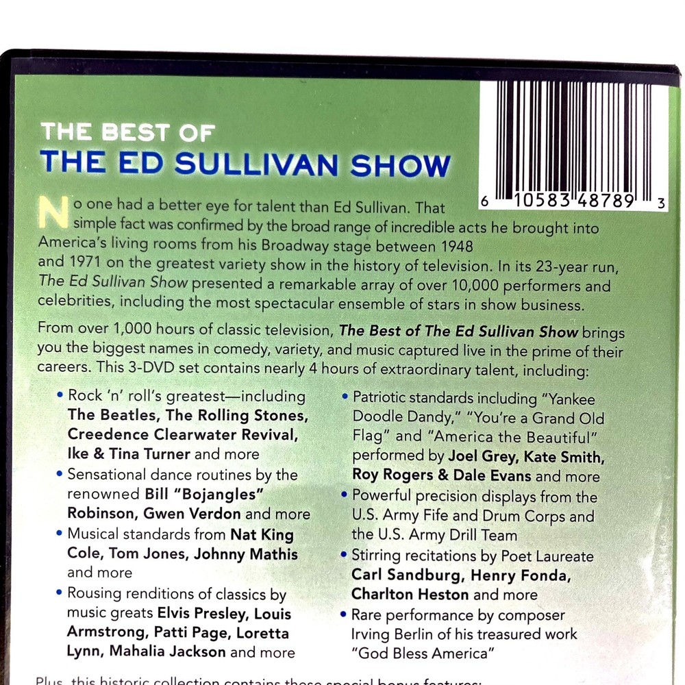 Enjoy the timeless performances of legendary musicians with this 3 DVD set of the Best of the Ed Sullivan Show. Featuring iconic acts such as The Beatles, The Rolling Stones, and Elvis Presley, this set is a must-have for any music lover. Each DVD includes multiple episodes of the show, showcasing a variety of artists and genres. With free shipping, it's never been easier to add this incredible collection to your DVD library. The DVD set will be shipped very quickly and packed with care. The shipping is free (USPS Media Mail) and with my 30 Day return policy, you can buy with confidence. Thank you for your time and consideration.