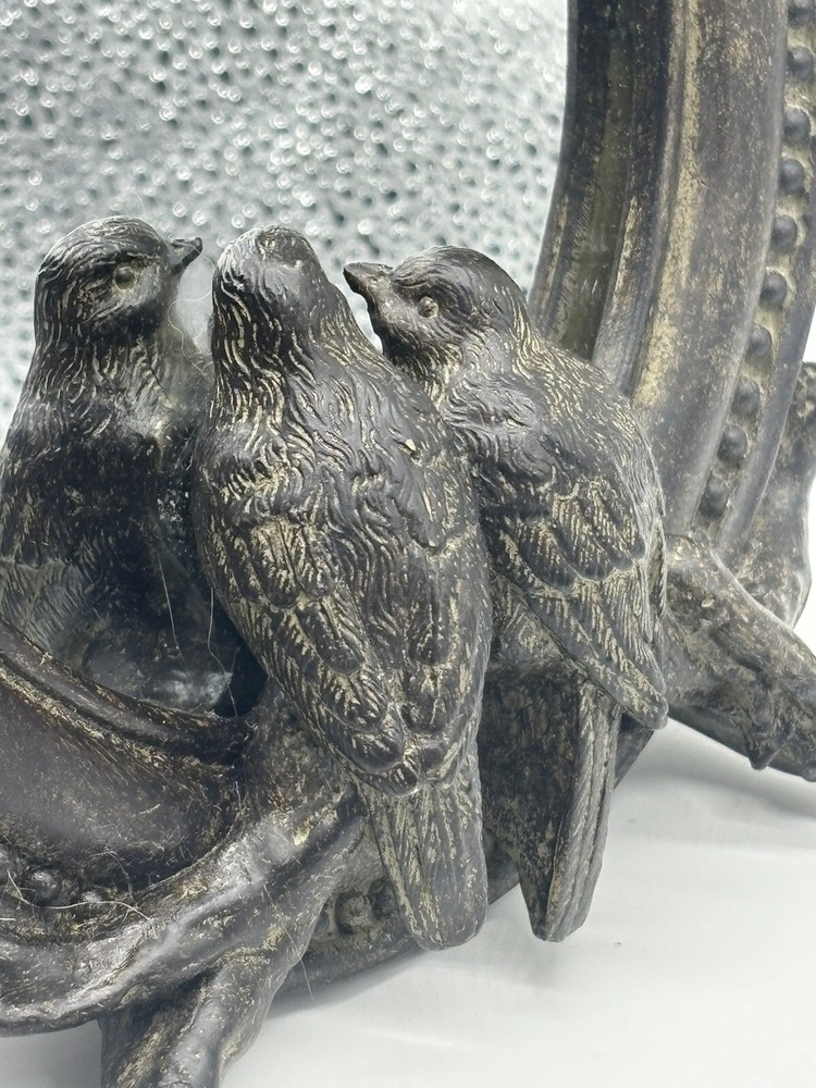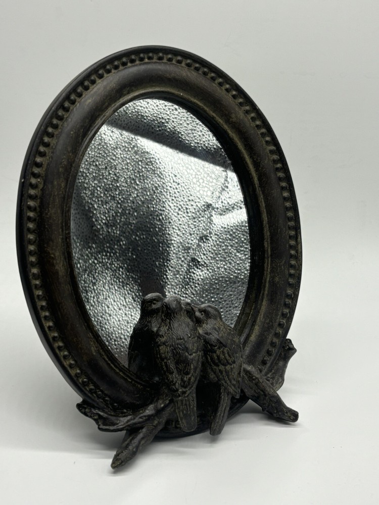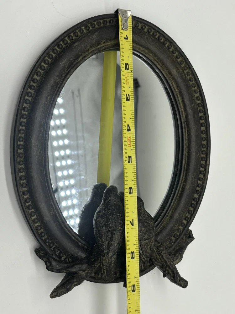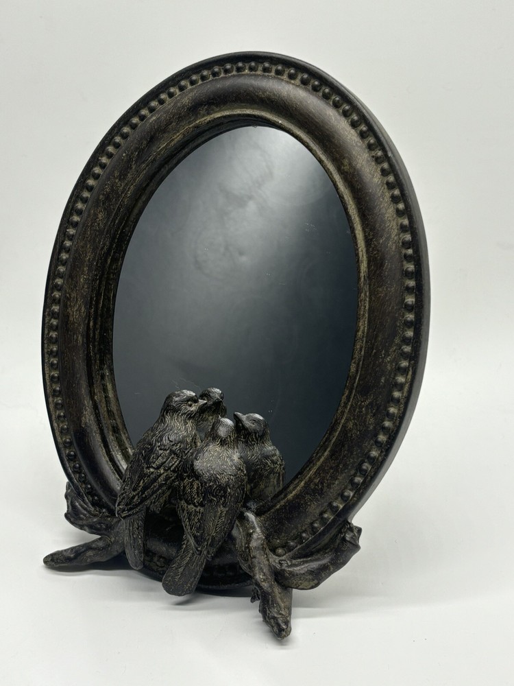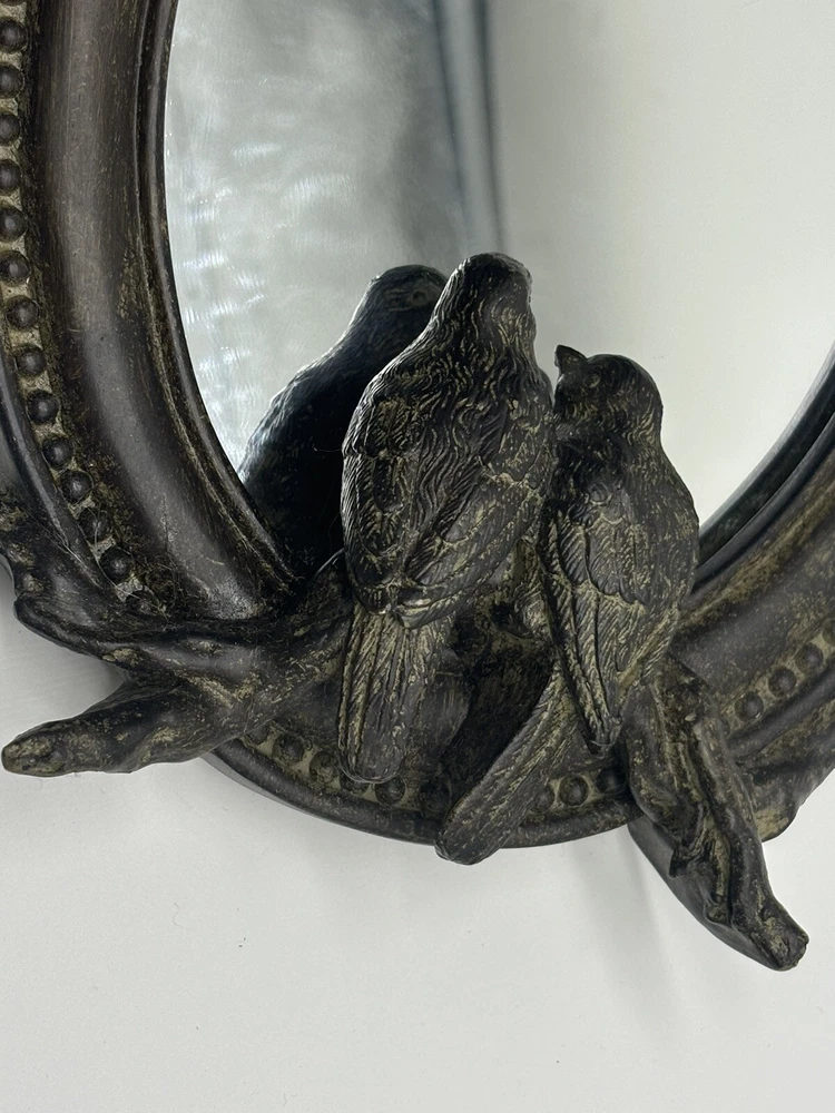 Add a touch of vintage charm to any room with this Creative Co-Op oval framed mirror. The mirror features a beautiful bird-themed design and is made of high-quality resin. Measuring 9 inches in height and 7 inches in width, this freestanding accent mirror is perfect for vertical orientation. Its brown frame color and oval shape give it a unique and elegant look that will complement any decor. The mirror is ideal for those who love bird-themed designs and vintage-style decor.