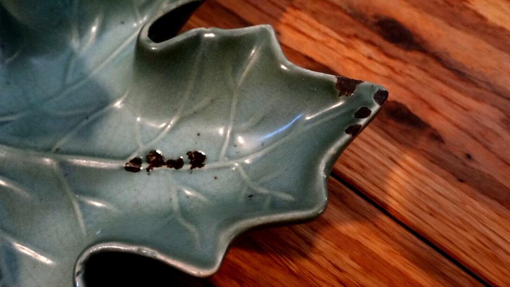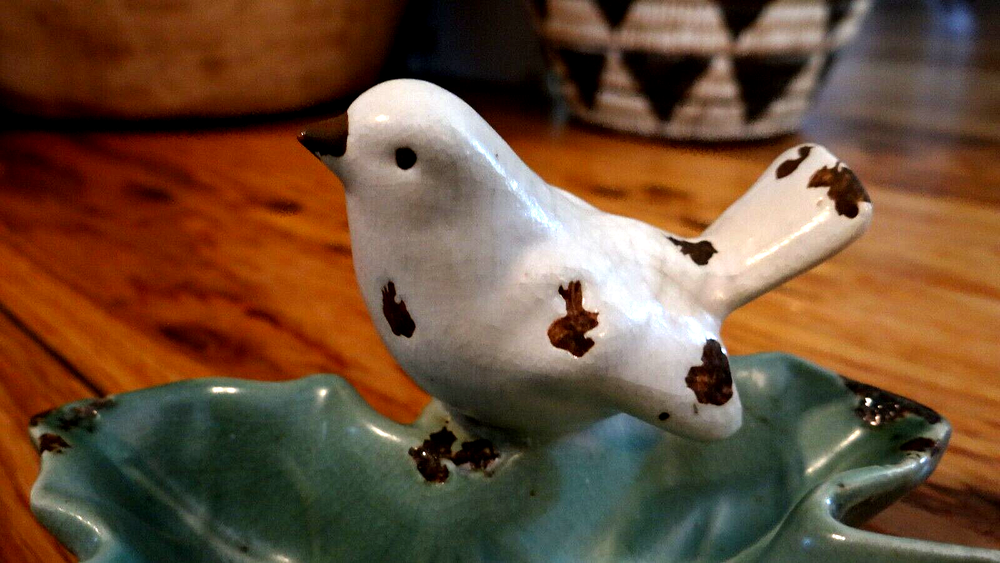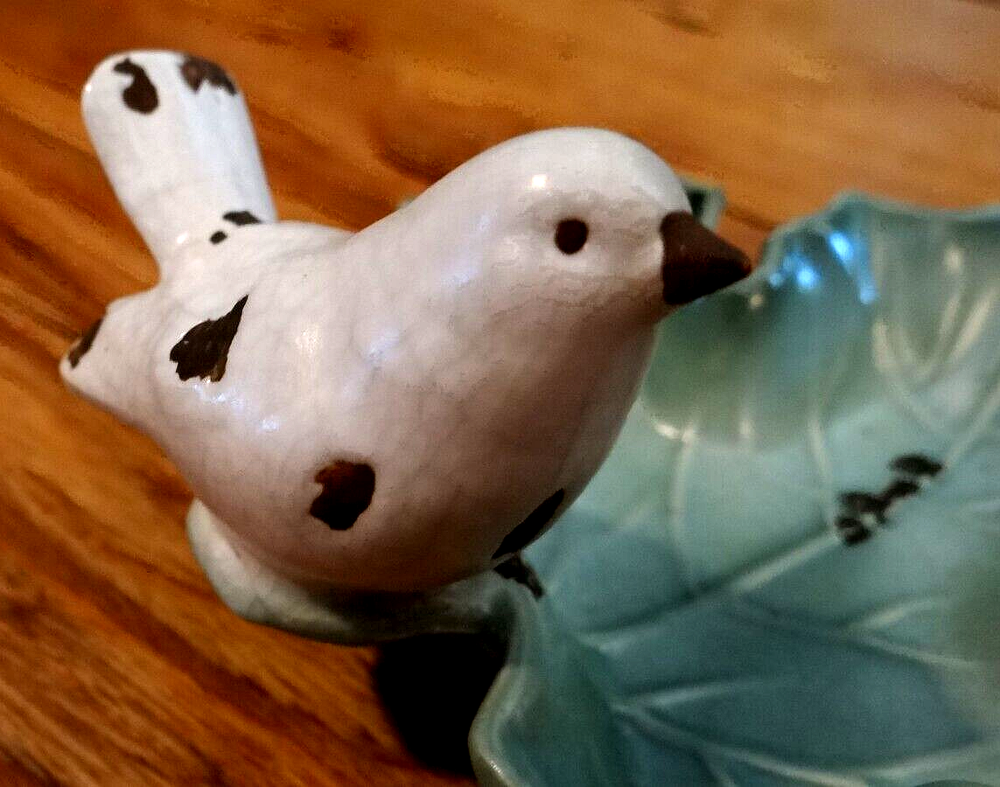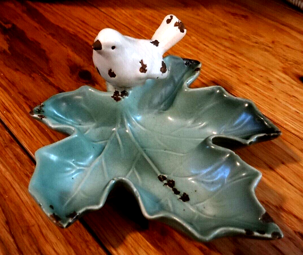 Designed for Tili Collections by Creative Co-Op. This is a discontinued piece. The dish and the bird have faux crazing and distressing. This small leaf dish is perfect for placing your rings in and always knowing where they are. Great for jewelry but also good for holding your keys, paper clips, or even a small bar of soap on your bathroom counter. The great leaf design and antique looking white bird will compliment your room decor. A charming ceramic trinket dish. Maple leaf accented with a little bird. This charming little decorative dish will add a bit of garden style wherever it is displayed. Due to handcrafting, variations and minor imperfections should be expected. Do not use it to hold food. This dish was used for display and is in excellent condition. There are no tags or packaging.