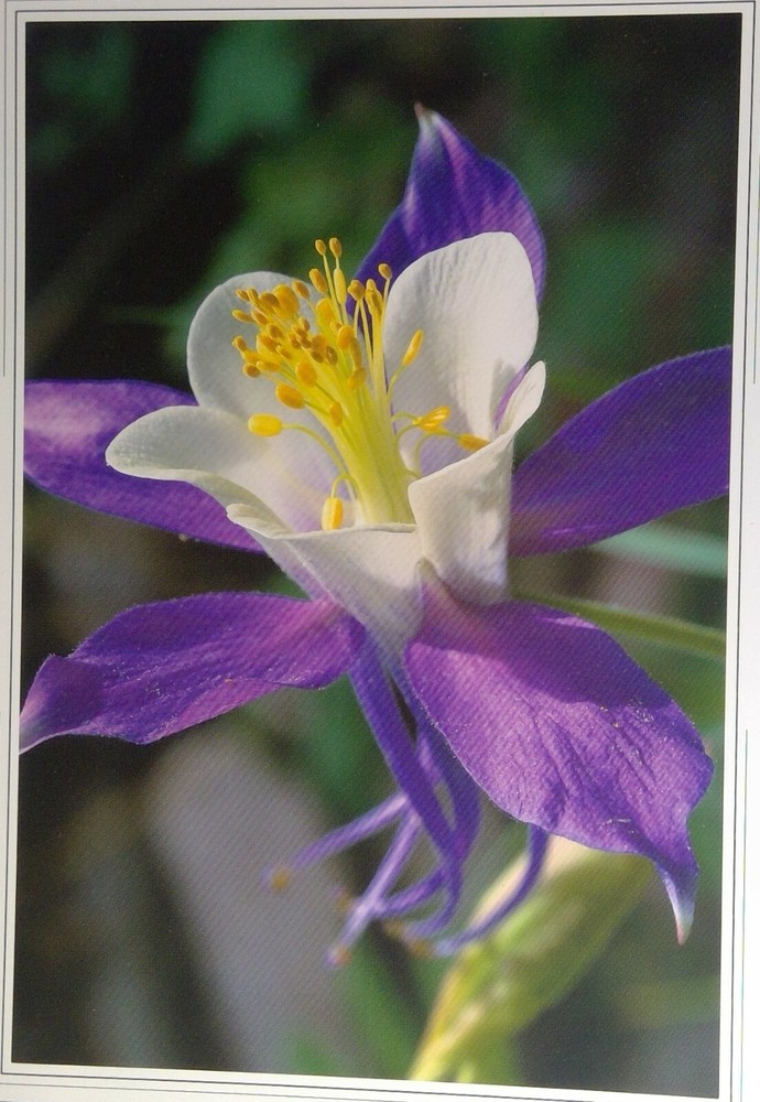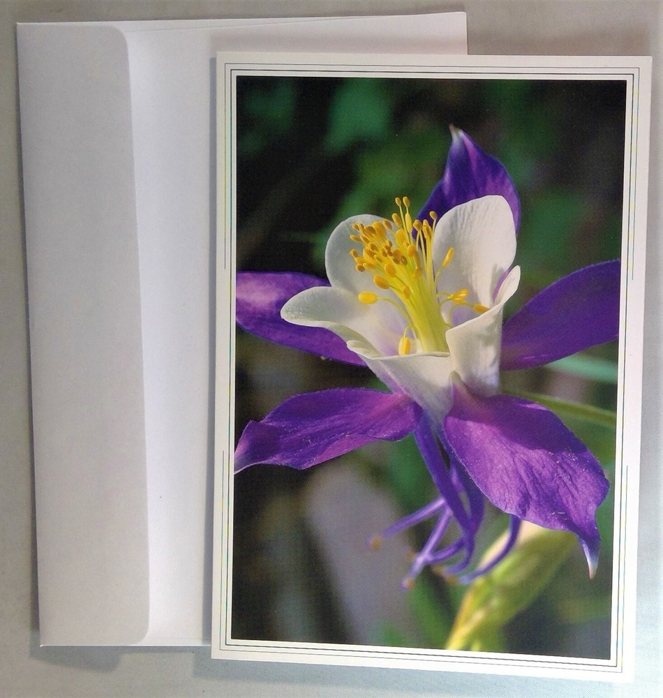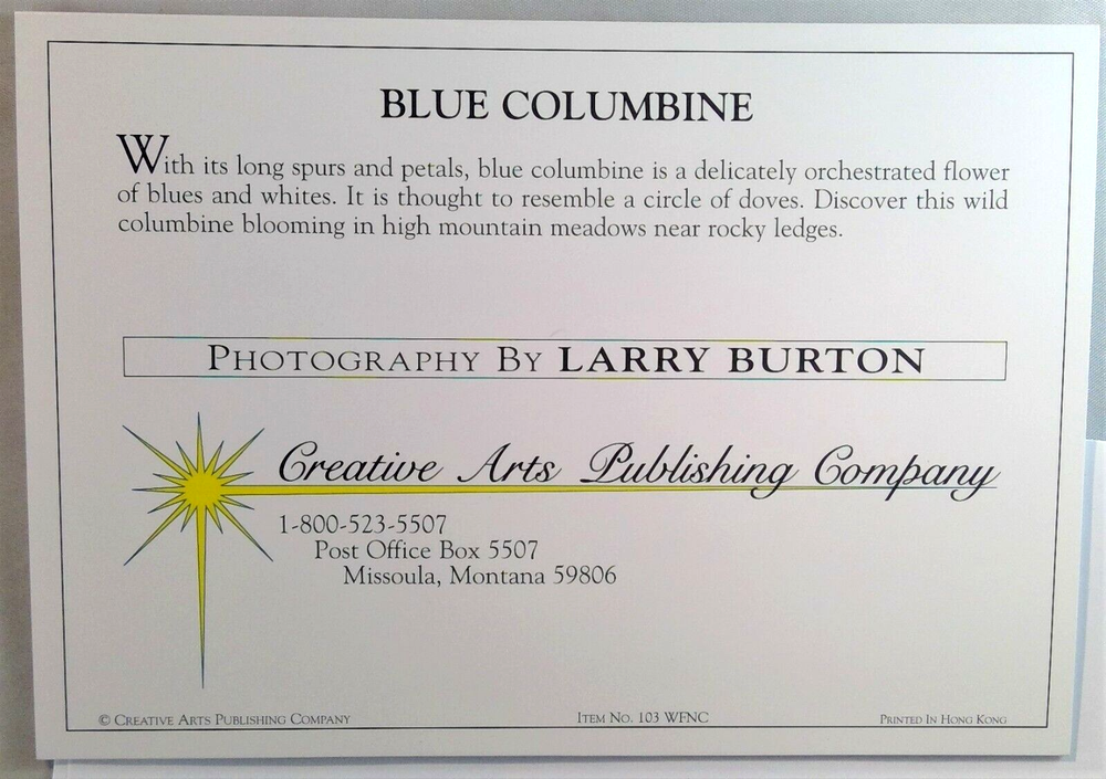 'Blue Columbine', photograph by Larry Burton, notecard from Creative Arts Publishing Company. Blank inside. Pre-owned, unused notecard in very good condition. Please email questions. Thank you for your interest. We do combine shipping. Have a great day!