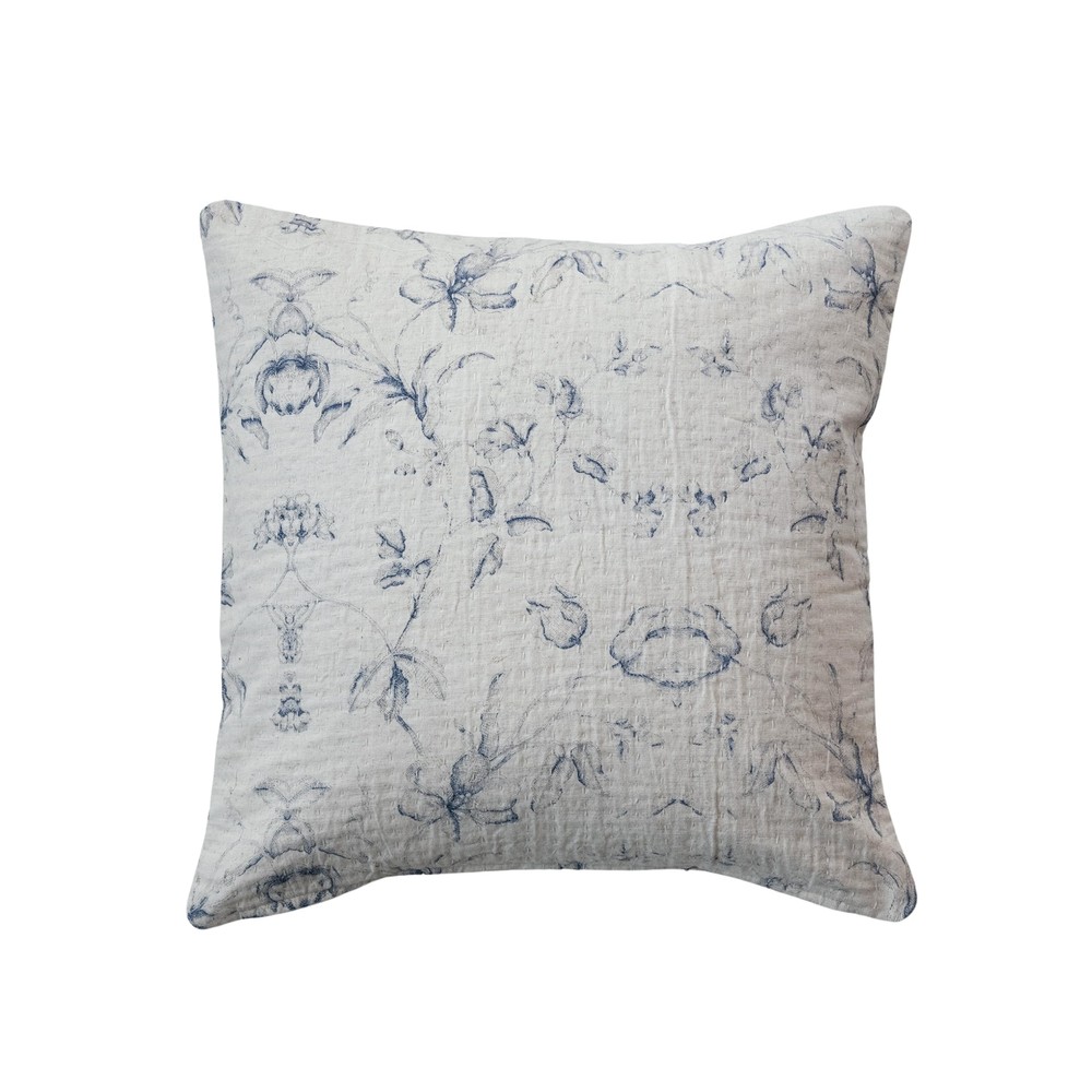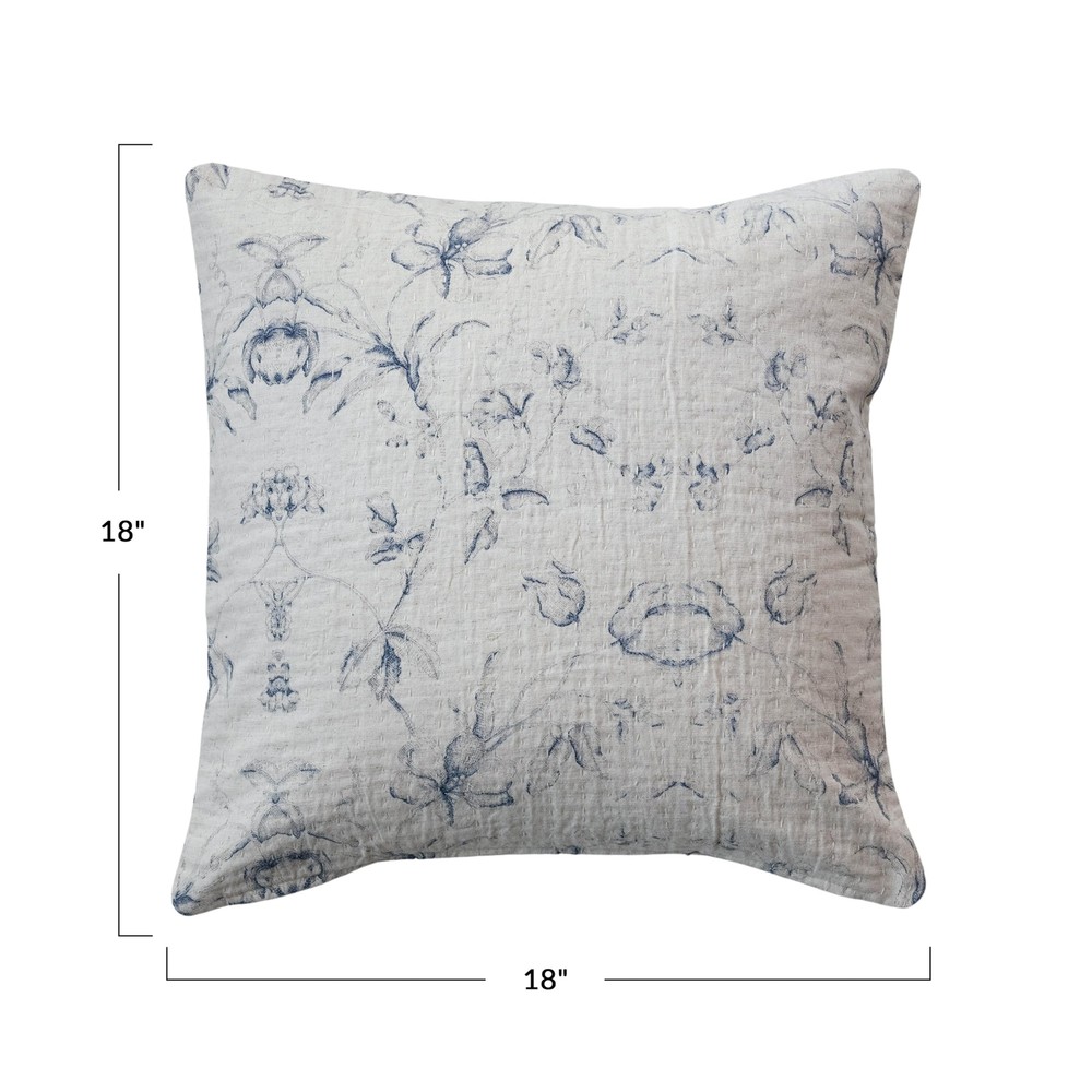 This Blue Floral Patterned Cotton and Linen Pillow is a charming piece that marries comfort with classic design. The intricate floral pattern in shades of blue provides a tranquil visual appeal, while the 18-inch square form factor ensures it fits perfectly in a variety of settings. Whether it's offering additional back support or serving as a decorative centerpiece, this pillow is a versatile choice for anyone looking to enhance their space with a touch of farmhouse elegance or cottage charm. The cotton and linen blend fabric also adds a touch of luxury and durability to the pillow, making it a practical choice for everyday use. Its neutral color palette allows for easy coordination with existing decor, making it a versatile addition to any room in the home. A blue cotton and linen pillow, adorned with a graceful floral print, evoking the charm of a blooming meadow An ideal accent for French country, cottage, or farmhouse aesthetics, it brings a touch of bucolic sophistication Polyester fill insert included Made from a blend of cotton and linen, this pillow is a durable and soft addition to any home 18” L x 18” W