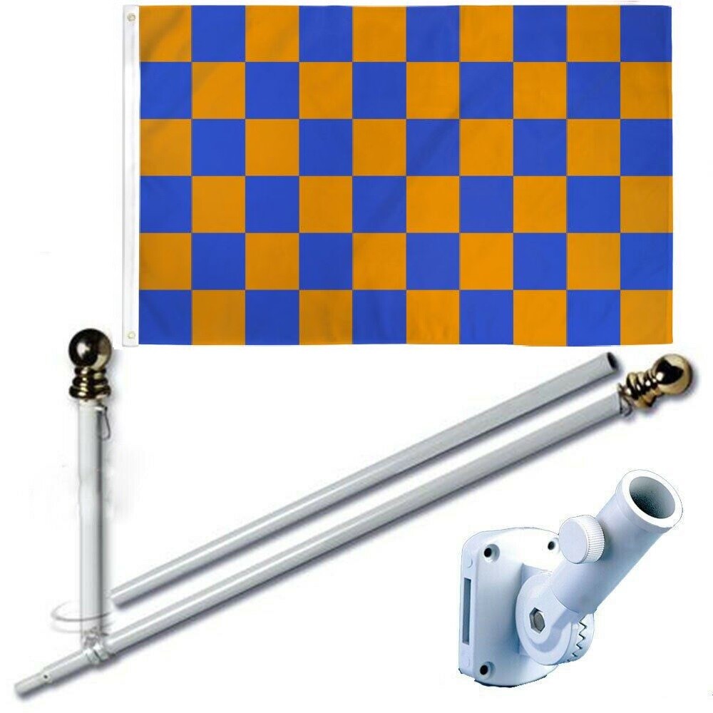 3' x 5' Super Polyester Flag w/ 2 Grommets for Hoisting 6' spinning stabilizing flag pole with 1" diameter Adjustable bracket and wall mounting hardware included This pole kit includes our 6ft Spinning Stabilizer Pole and Adjustable Aluminum Bracket. 2 Section Aluminum Spinning Stabilizer Pole is 6 feet long with a 1-inch diameter and gold ball top and white finish. These poles were recently upgraded from our previous model for strength and durability. They now include a mid-section ball joint so that the pole spins freely, and the flag never tangles. Adjustable Aluminum Bracket with White Finish can fit in up to 13 different angles across 180 degrees of motion.