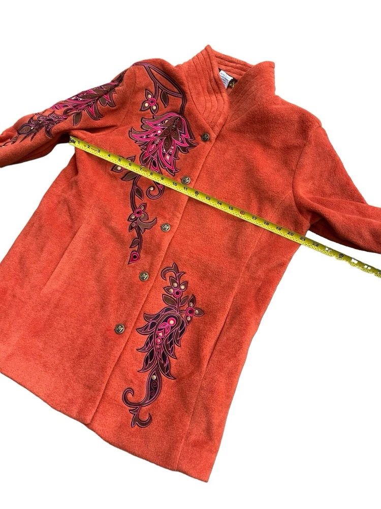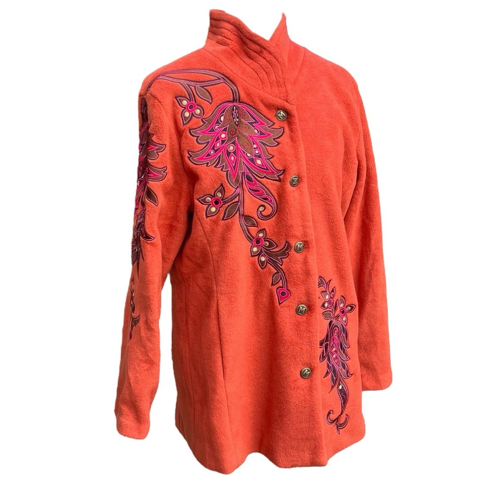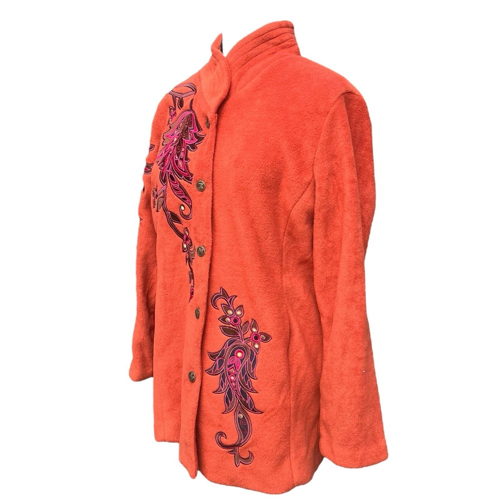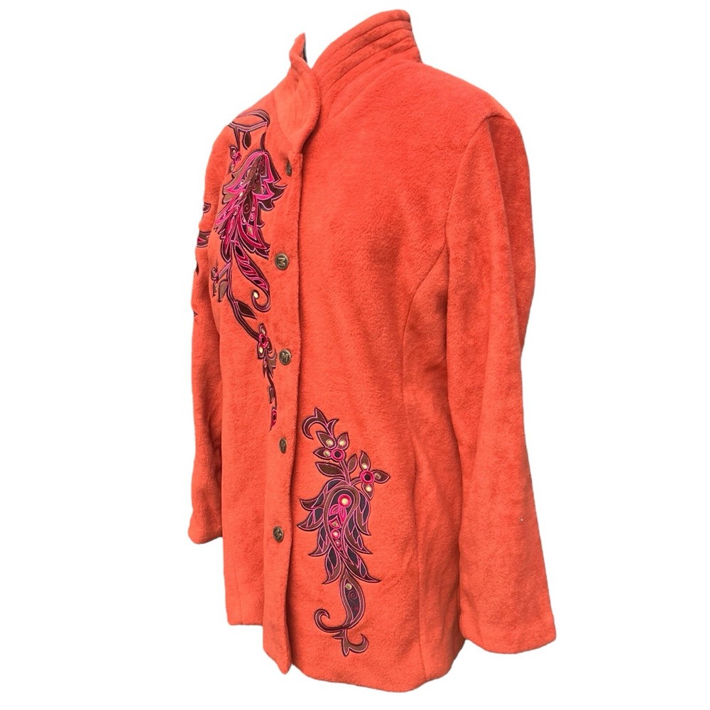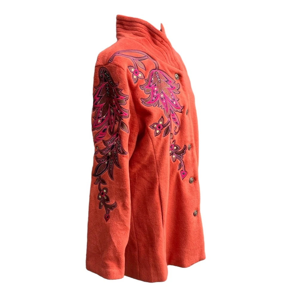 This Bob Mackie Wearable Art jacket is a stunning piece that will make you stand out from the crowd. Made of high-quality polyester, this mid-length jacket features a stand-up collar, designer button closure, and long sleeves with embroidered accents. The geometric pattern in orange color adds a touch of art to this basic jacket. This jacket is perfect for all occasions and can be worn in winter, fall, and spring. It is lined with polyester and insulated with more polyester to keep you warm and comfortable. The jacket is machine washable and easy to maintain. Get this classic fit jacket in size M for regular size type.