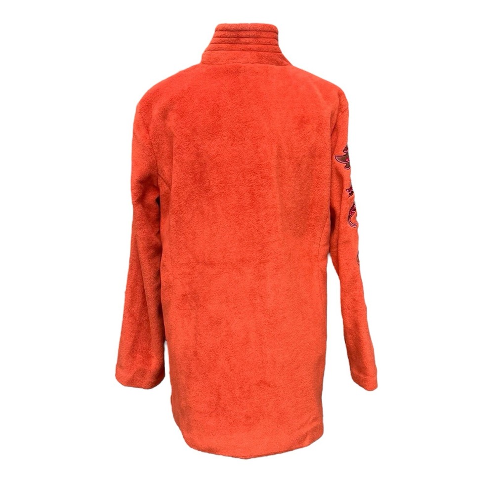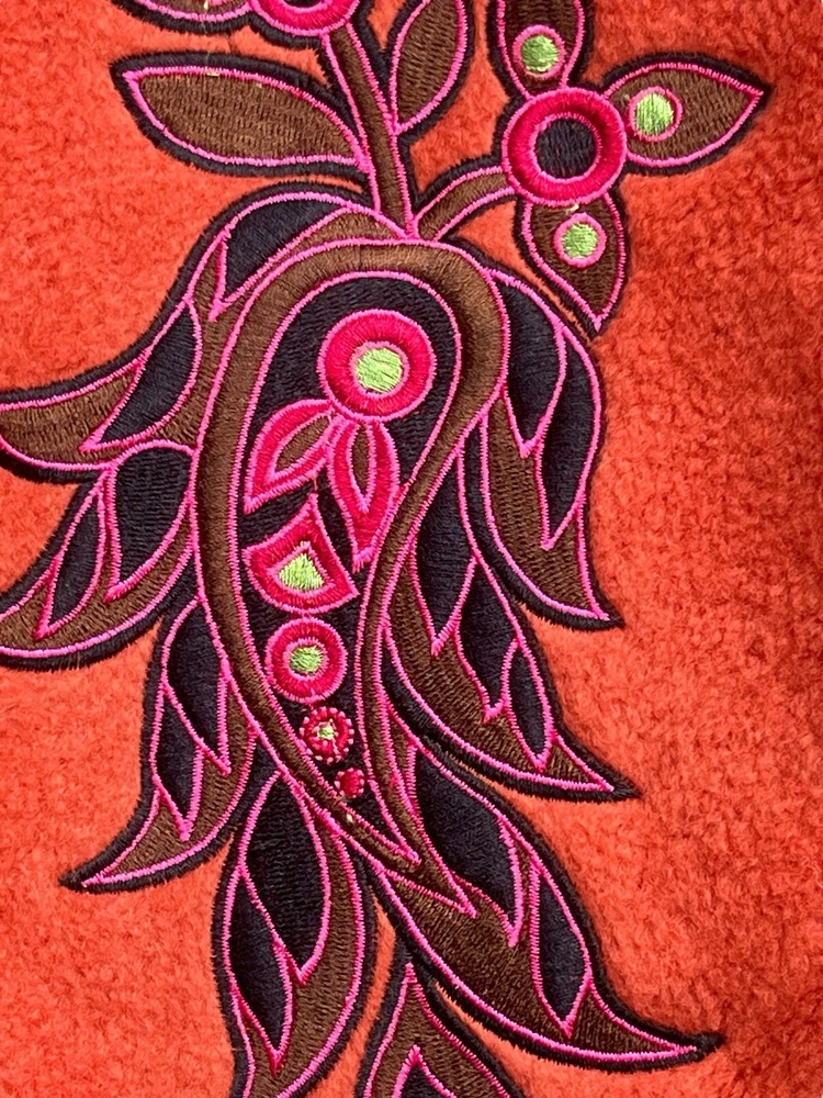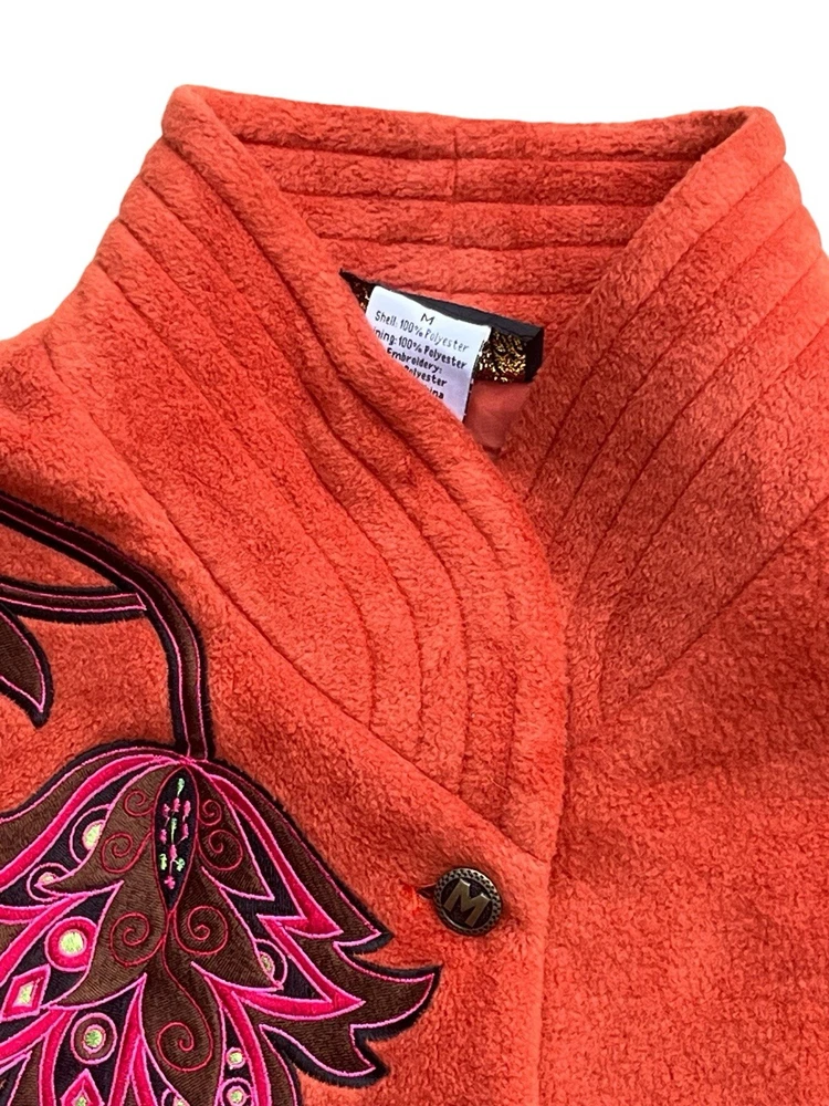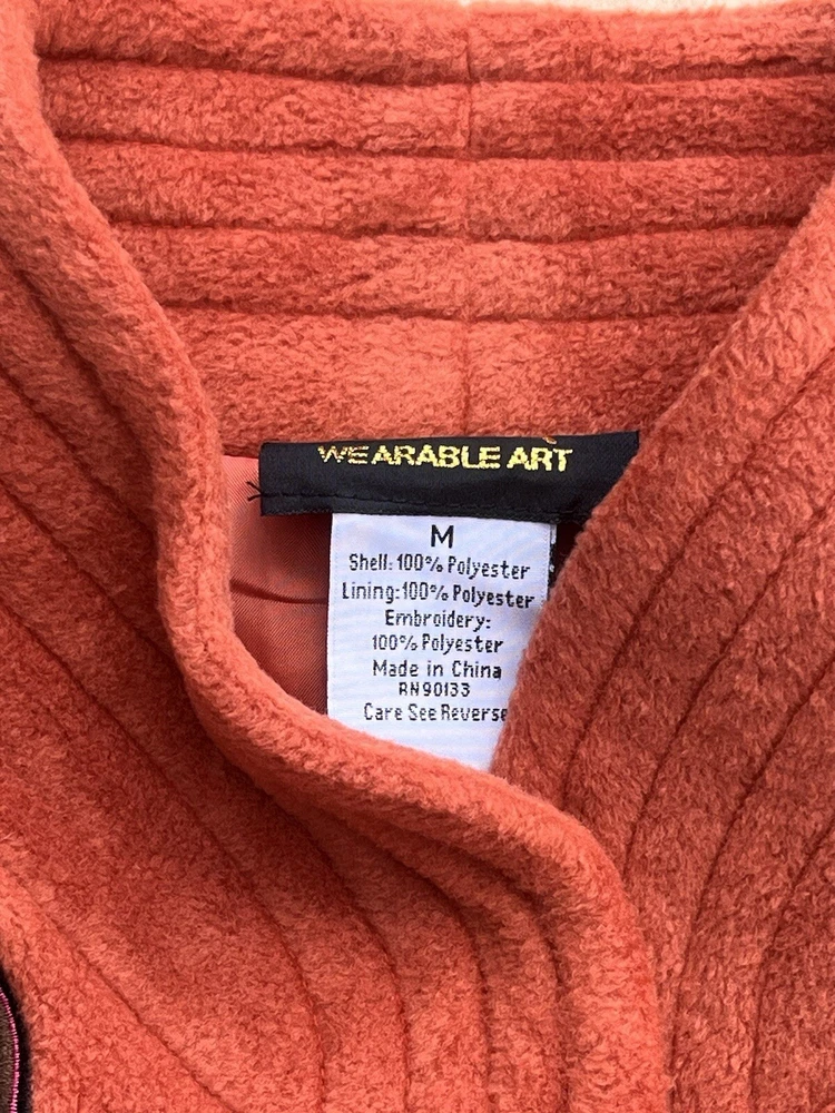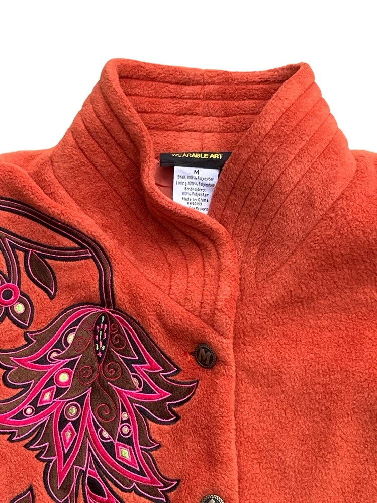 This Bob Mackie Wearable Art jacket is a stunning piece that will make you stand out from the crowd. Made of high-quality polyester, this mid-length jacket features a stand-up collar, designer button closure, and long sleeves with embroidered accents. The geometric pattern in orange color adds a touch of art to this basic jacket. This jacket is perfect for all occasions and can be worn in winter, fall, and spring. It is lined with polyester and insulated with more polyester to keep you warm and comfortable. The jacket is machine washable and easy to maintain. Get this classic fit jacket in size M for regular size type.