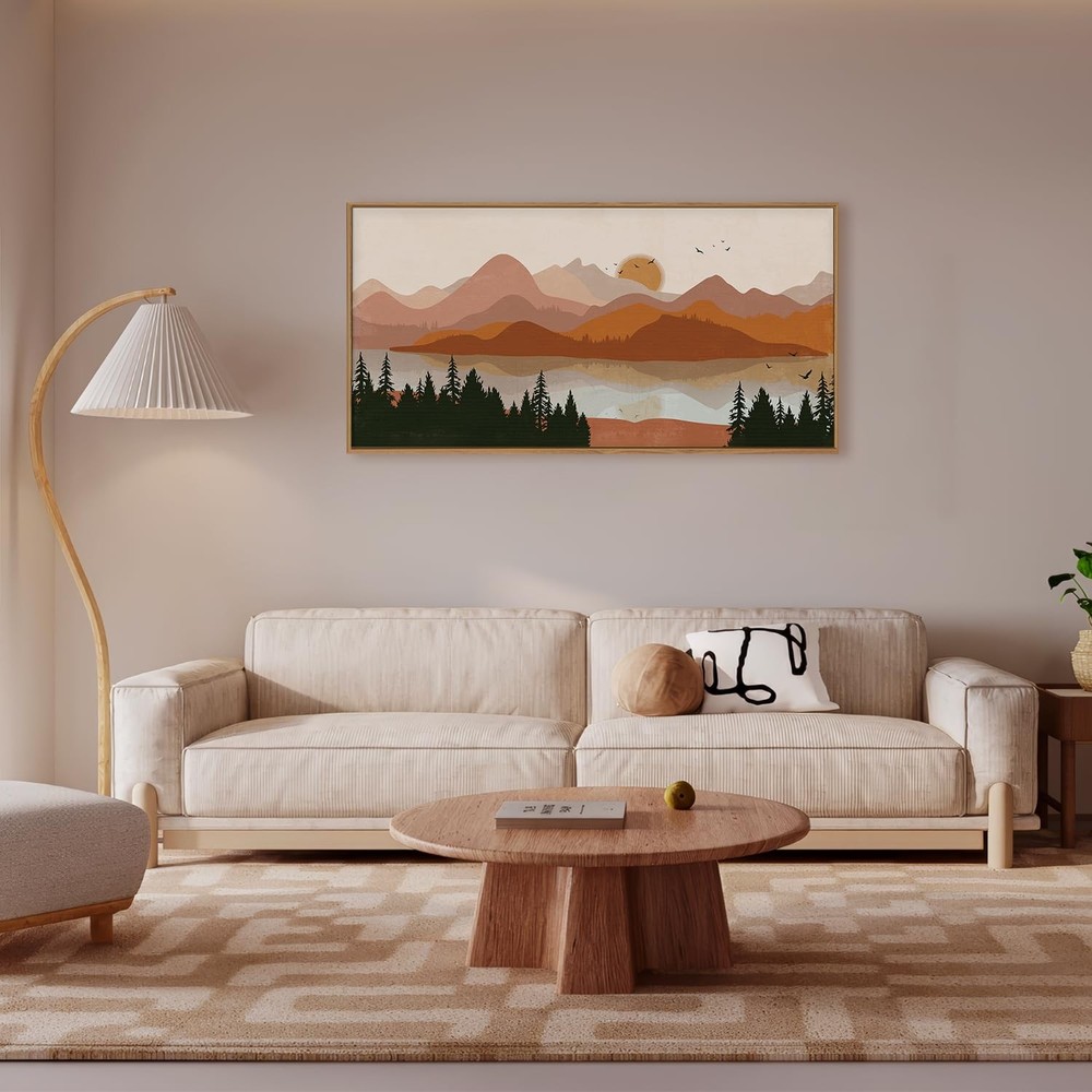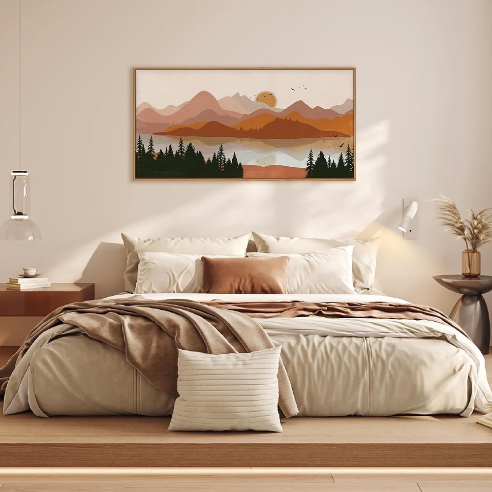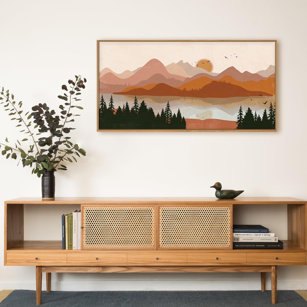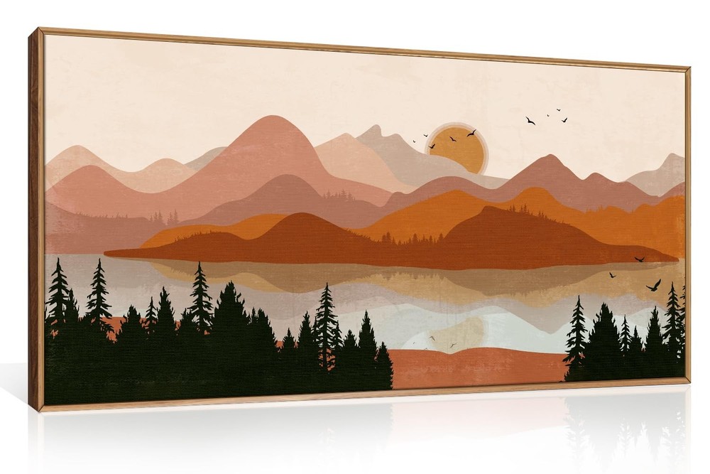 This stunning boho-inspired wall art brings warmth and serenity to any space with its rich burnt orange and terracotta tones. The layered mountain and forest scenes create a dreamy, free-spirited vibe that instantly calms the mind. The high-quality framed canvas adds a mid-century modern touch, making it a perfect statement piece for living rooms, bedrooms, or offices. The sunset hues shift beautifully throughout the day, offering a dynamic yet peaceful focal point. It’s an effortless way to elevate your decor while infusing natural tranquility into your home.