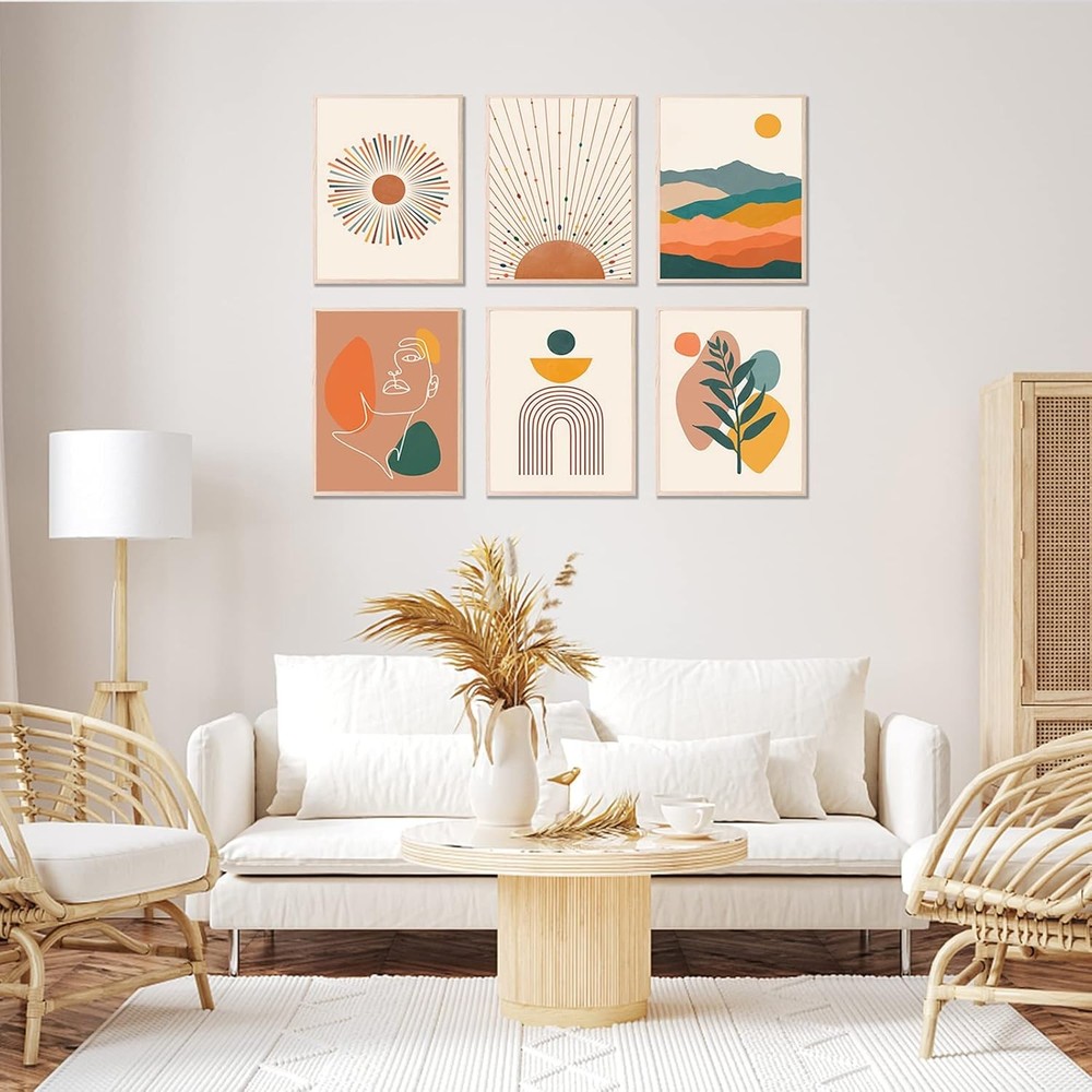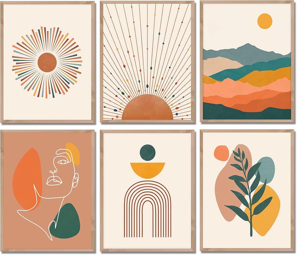 Boho Prints, Wall Art, Orange Decor, Mid 8x10 inches, 6pcs-Boho 01 Product Details Product Dimensions: 10 x 8 x 0.2 inches Item Weight: 0.352 ounces Manufacturer: uniro Item model number: UN-Boho-01 Premium Quality Canvas Materials:Our Boho wall art prints are made of high-quality canvas and inks, which can ensure that these boho posters will not easy to fade and waterproof. The boho minimalist wall art is perfect for various home decor style, like boho, mid-century, neutral or modern. Boho Style Wall Art Decor: Minimalist Boho art paintings are composed of various patterns, such as palm leaf, Sunrise, mountain, desert, women face line, etc. The set of art wall prints complement existing Bohemian wall art decor or can be the new focal point in a room. If you like this style, then the Boho wall art prints and posters will deserve your choice. Perfect Choice for Your Home Decoration: The orange and beige boho prints are suitable for bathroom, bedroom, living Room, dining Room, teen girls room, office, gallery etc. And if you are looking for boho wall decor gift for your friends in special days,like housewarming, Christmas, birthday, anniversary, Valentine's Day, Mother's Day, Father's Day, graduation, it can be your best gift choice. How to Hang Your Wall Art Prints: The size of the boho room decor is 8x10inchx6pcs. These mid-century modern wall art pictures perfectly fit a standard 8” x 10” picture frame. You can also hang these boho paintings with Binder clip, Clothespins, or Tape sticker. Just decorate them with your favorite frames or other suitable ways to fit your home style. Boho Prints, Boho Wall Art, Orange Wall Decor, Mid Century Modern Wall Pictures Palm Leaf Sun Mountain Women Face Line Canvas Wall Painting, Minimalist Geometric Boho Wall Decor, Boho Posters for Living Room Bedroom Office | Unframed 8"x10"