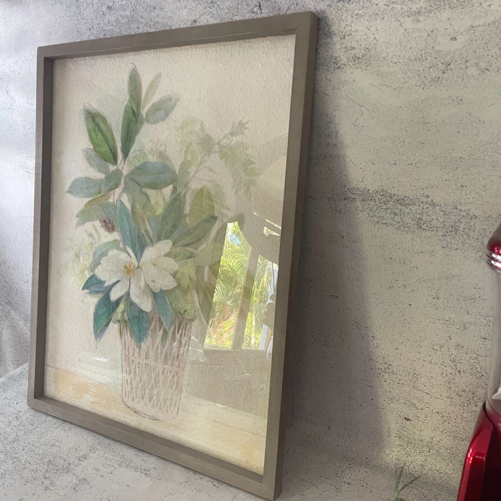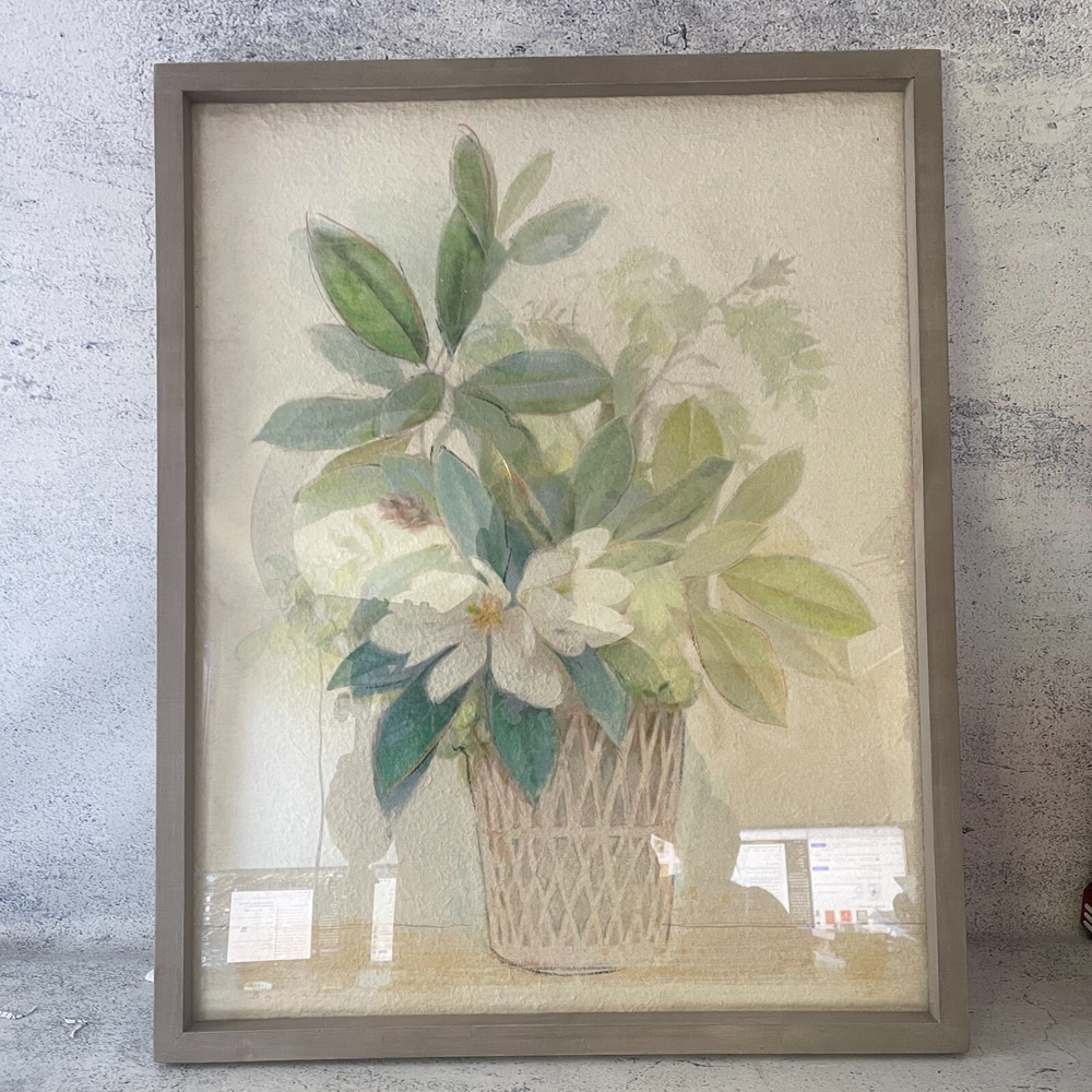 Botanical Wall Art Magnolia Floral Print Wood Framed Glass Creative Co op 71cm ***Pre-Owned*** Product Description: Enhance your space with this beautiful Magnolia in Planter Wood Framed Wall Décor from Creative Co-op . Featuring a delicate floral print with soft green leaves and a woven-style planter, this artwork is framed in a wooden border with a glass front , adding a timeless and elegant touch to any home décor. This pre-owned piece is in good condition and offers a serene botanical aesthetic, making it ideal for living rooms, bedrooms, or offices. Important This item is second-hand and sold in used condition . It may exhibit signs of wear, such as minor scratches or imperfections, which are inherent to its age and previous use. We have provided accurate product images and descriptions for your reference. Please review them carefully before making a purchase decision. The staging materials, including plants, pots, or other decorative items, used in product photos are for display purposes only . They are not included as part of the sale. The listing solely encompasses the main item described in the product description and does not include any additional accessories or staging materials. Photographs are taken with studio lights, which may cause spots of glare. Colours may vary on different screens.