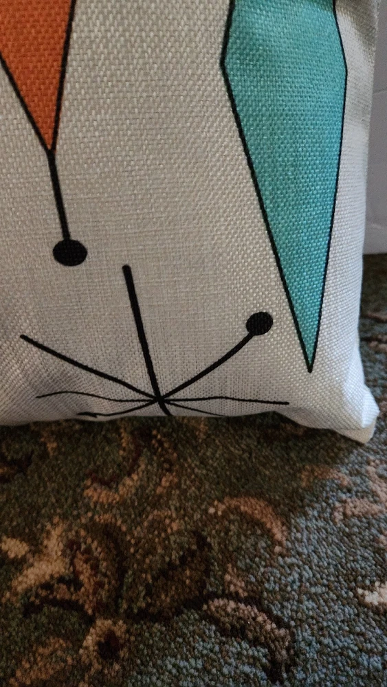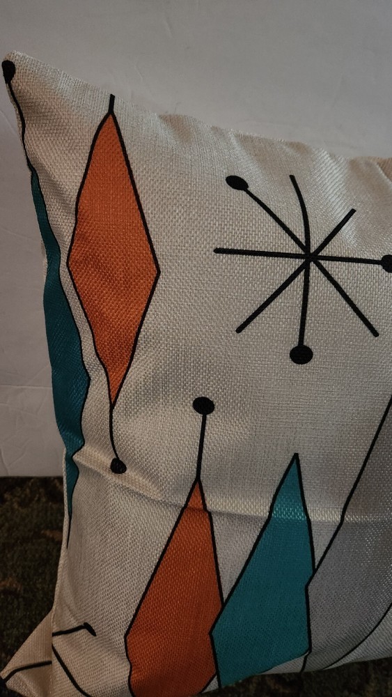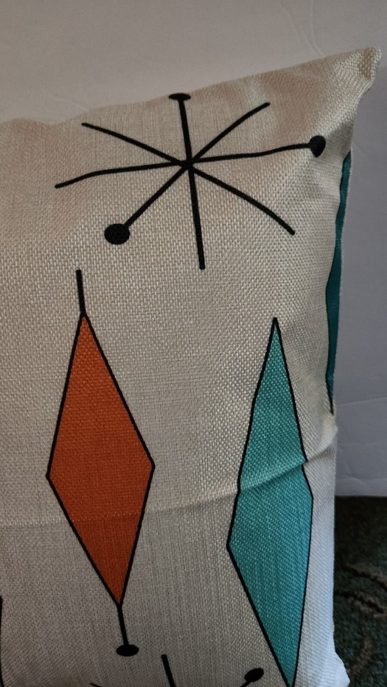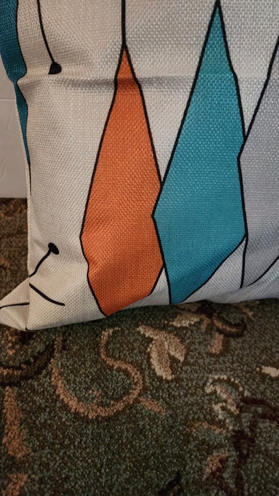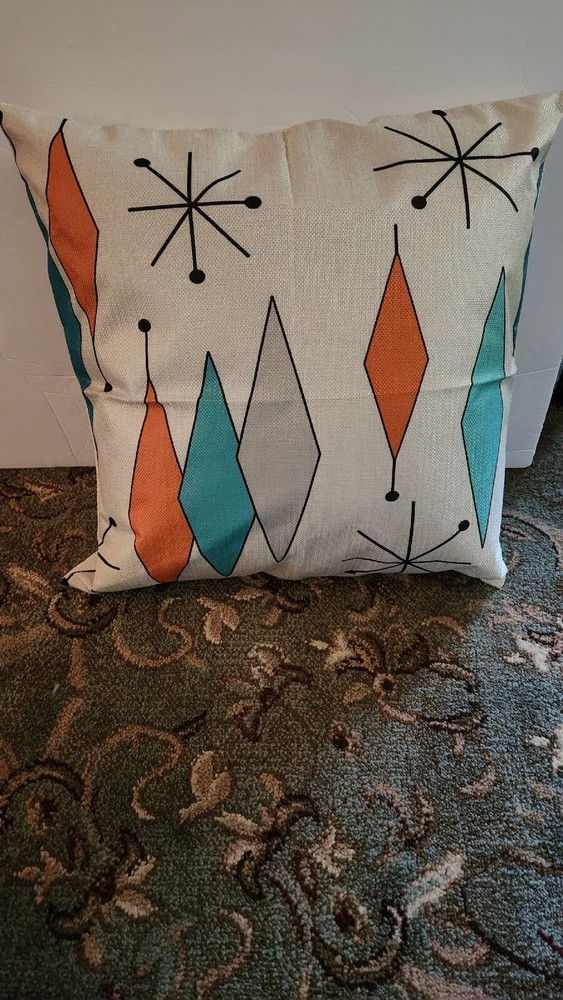 Here is a Brand New Teal/Orange/Gray Diamond Grid Square Linen Mid-century 18" x 18" Pillow. The pillows cover is 100% Polyester and the filling is 100% Polyester. I'm no expert on this but will answer any questions you have the best I can. Sold as is, so please look at the pictures. I ship within 2 days after payment is received unless something happens, and I can not ship within 2 days. I will let you know. I get my items from estate sales and have no idea if they come from a smoke-free home or not!!! I ship within 2 days unless something happens. PLEASE DO NOT MESSAGE ME WITH OFFERS BECAUSE I ALREADY HAVE A PERCENTAGE OFF! IF SHIPPING IS CHEAPER I ALWAYS REFUND THE DIFFERENCE.